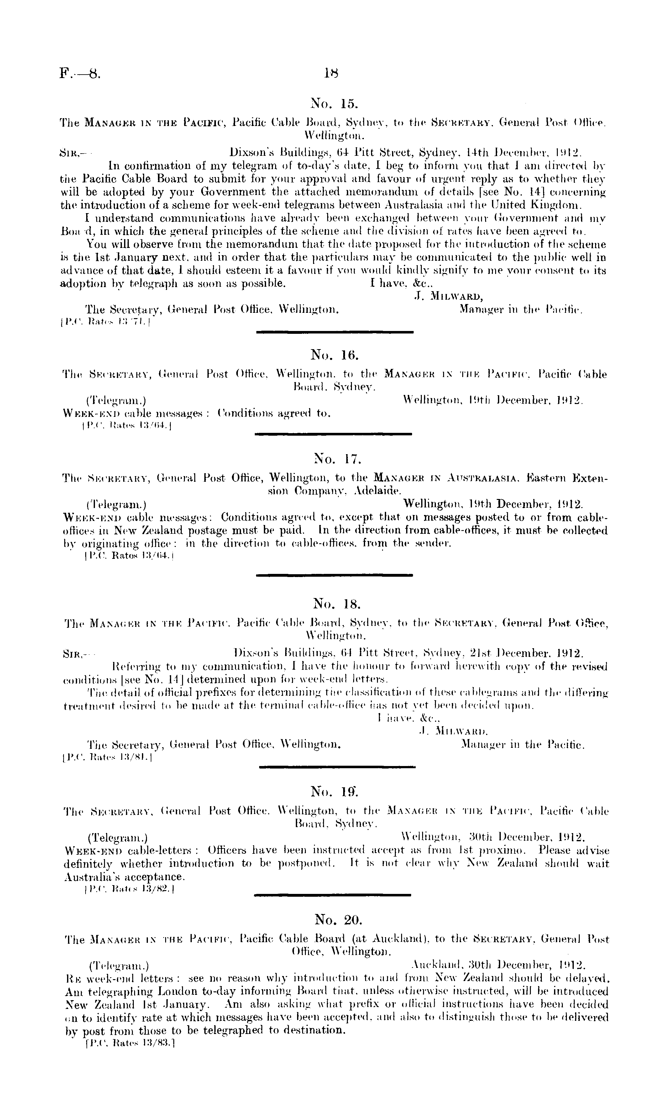 No. 15. The Manager in the Pacific, Pacific Cable Board, Sydney, to the Secretary, General Post Office. Wellington. Sir- Dixson's Buildings, 64 Pitt Street, Sydney, 14th December, 1912. In confirmation of my telegram of to-day's date. I beg to inform you that I am directed by the Pacific Cable Board to submit for your approval and favour of urgent reply as to whether they will be adopted by your Government the attached memorandum of details [see No. 14] concerning the introduction of a scheme for week-end telegrams between Australasia and the United Kingdom. I understand communications have already been exchanged between your Government and mv Boa d, in which the general principles of the scheme and the division of rates have been agreed to. You will observe from the memorandum that the date proposed for the introduction of the scheme is the Ist January next, and in order that the particulars may be communicated to the public well in advance of that date, I should esteem it a favour if you would kindly signify to mc your consent to its adoption by telegraph as soon as possible. I have, &c, J. Mil. WARD, The Secretary, General Post Office. Wellington, Manager in the Pacific. [P.C. Rates 13 71.]