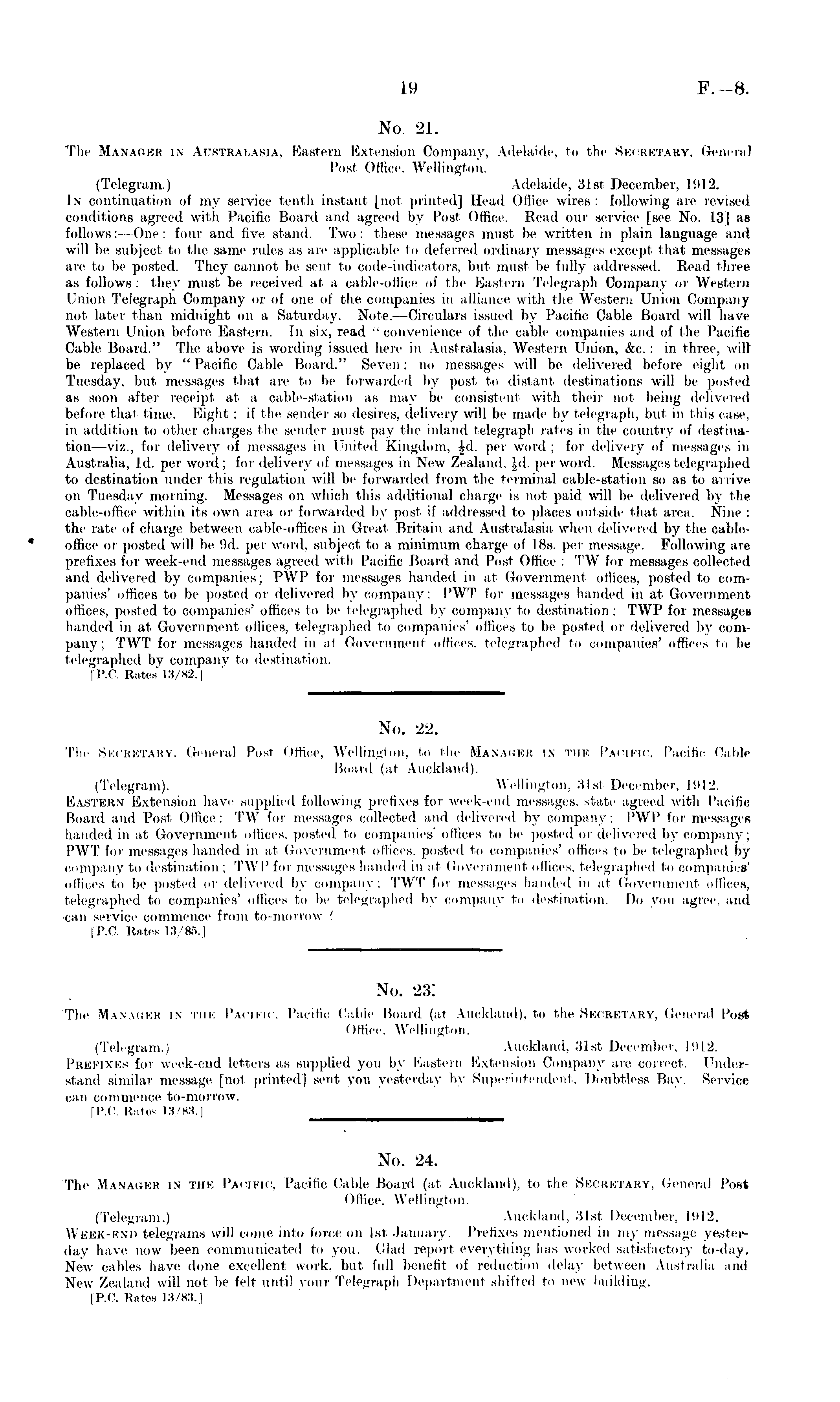 No. 21. The Manager in Australasia, Eastern Extension Company, Adelaide, to the Secretary, General Post Office. Wellington. (Telegram.) Adelaide, 31st December, 1912. In continuation of my service tenth instant [not printed] Head Office wires: following are revised conditions agreed with Pacific Board and agreed by Post Office. Read our service [see No. 13] as follows: —One: four and five stand. Two: these messages must be written in plain language and will be subject to the same rules as are applicable to deferred ordinary messages except that messages are to be posted. They cannot be sent to code-indicators, but must be fully addressed. Read three as follows : they must be received at a cable-office of the Eastern Telegraph Company or Western Union Telegraph Company or of one of the companies in alliance with the Western Union Company not later than midnight on a Saturday. Note.—Circulars issued by Pacific Cable Board will have Western Union before Eastern. In six, read " convenience of the cable companies and of the Pacific Cable Board." The above is wording issued here in Australasia, Western Union, &c. :in three, will be replaced by "Pacific Cable Board." Seven: no messages will be delivered before eight on Tuesday, but messages that are to be forwarded by post to distant destinations will be posted as soon after receipt at a cable-station as may be consistent with their not being delivered before that time. Eight: if the sender so desires, delivery will be made by telegraph, but in this case, in addition to other charges the sender must pay the inland telegraph rates in the country of destination—viz., for delivery of messages in United Kingdom, £d. per word ; for delivery of messages in Australia, Id. per word; for delivery of messages in New Zealand, Jd. per word. Messages telegraphed to destination under this regulation will be forwarded from the terminal cable-station so as to arrive on Tuesday morning. Messages on which this additional charge is not paid will be delivered by the cable-office within its own area or forwarded by post if addressed to places outside that area. Nine : the rate of charge between cable-offices in Great Britain and Australasia when delivered by the cableoffice or posted will be 9d. per word, subject to a minimum charge of 18s. per message. Following are prefixes for week-end messages agreed with Pacific Board and Post Office : TW for messages collected and delivered by companies; PWP for messages handed in at Government offices, posted to companies' offices to be posted or delivered by company: PWT for messages handed in at Government offices, posted to companies' offices to be telegraphed by company to destination; TWP for messages handed in at Government offices, telegraphed to companies' offices to be posted or delivered by company; TWT for messages handed in at Government offices, telegraphed to companies' offices to be telegraphed by company to destination. | P.C. Rates 13/82.]