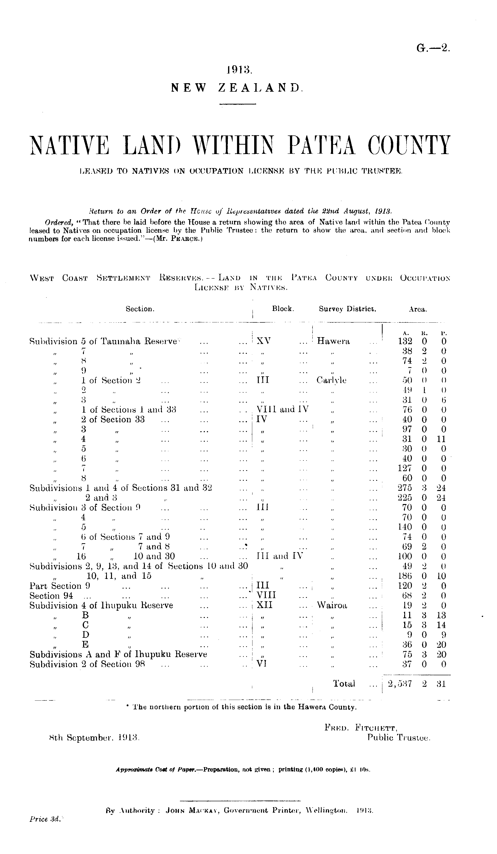 Return to an Order of the Hcusc of Representative*) dated the 22nd August, 1913. Ordered, "That there be laid before the House a return showing the area of Native land within the Patea County leased to Natives on occupation license by the Public Trustee: the return to show the area, and section and block numbers for each license issued."—(Mr. Pbaecb.)