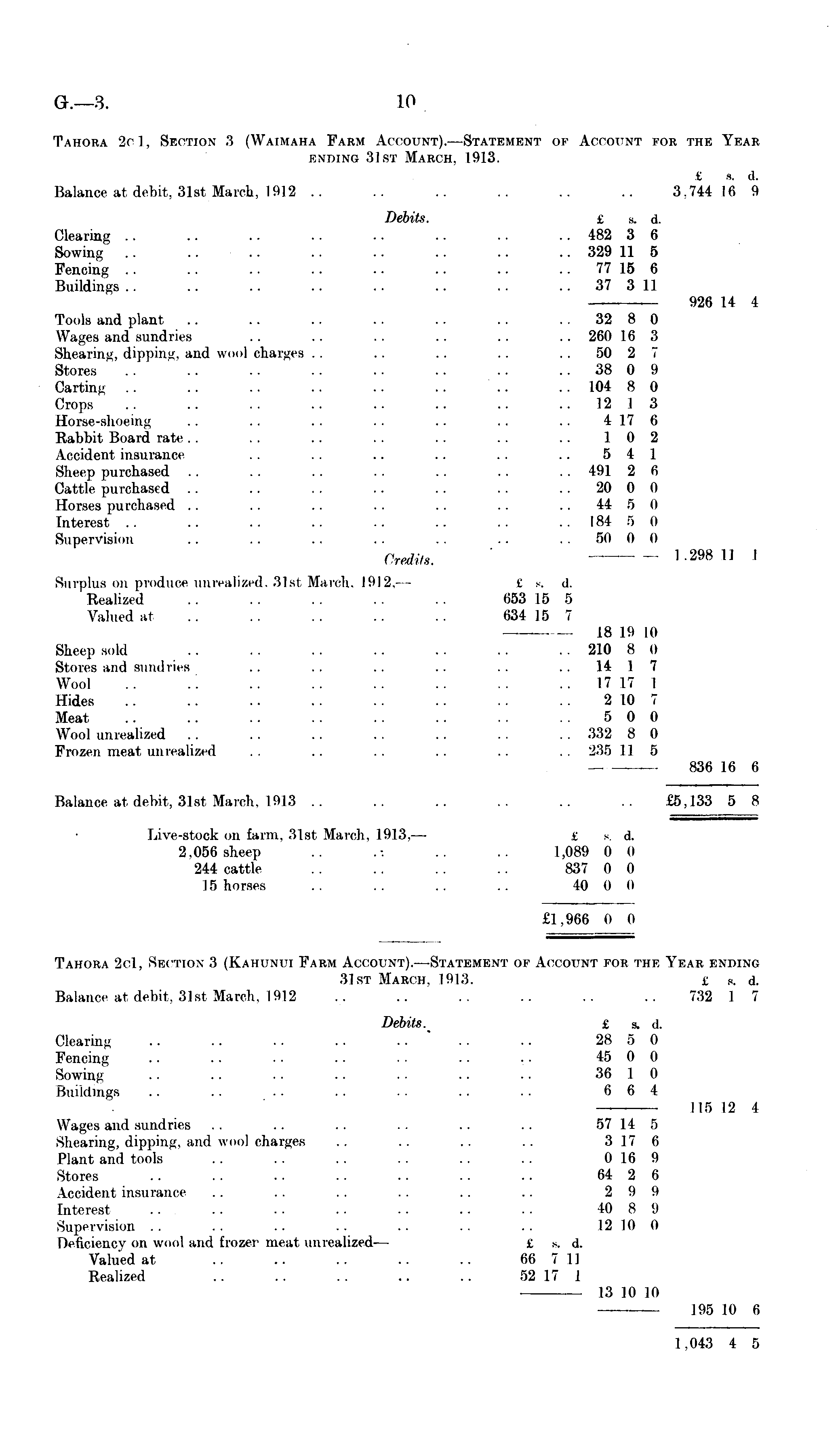 Tahora 2cl, Section 3 (Kahunui Farm Account).—Statement of Account for the Year ending 31st March, 1913. £ g. d. Balance at debit. 31st March, 1912 .. .. .. .. .. .. 732 1 7 Debits. £ s. d. Clearing .. .. .. .. .. .. .. 28 5 0 Fencing .. . ■ • • • • • • • • ■ • 45 0 0 Sowing .. .. .. .. . • .. .. 36 1 0 Buildings .. .. .. .. .. .. .. 664 — 115 12 4 Wages and sundries .. .. .. .. .. .. 57 14 5 Shearing, dipping, and wool charges .. .. .. .. 3176 Plant and tools .. .. .. .. .. 0 16 9 Stores .. .. .. .. .. .. .. 64 2 6 Accident insurance .. .. .. .. .. .. 299 Interest .. .. .. .. .. .. .. 40 8 9 Supervision .. .. .. .. .. .. .. 12100 Deficiency on wool and frozer meat unrealized.— £ b. d. Valued at .. .. .. .. .. 66 7 11 Realized .. .. .. .. .. 52 17 1 13 10 10 195 10 6 1,043 4 5