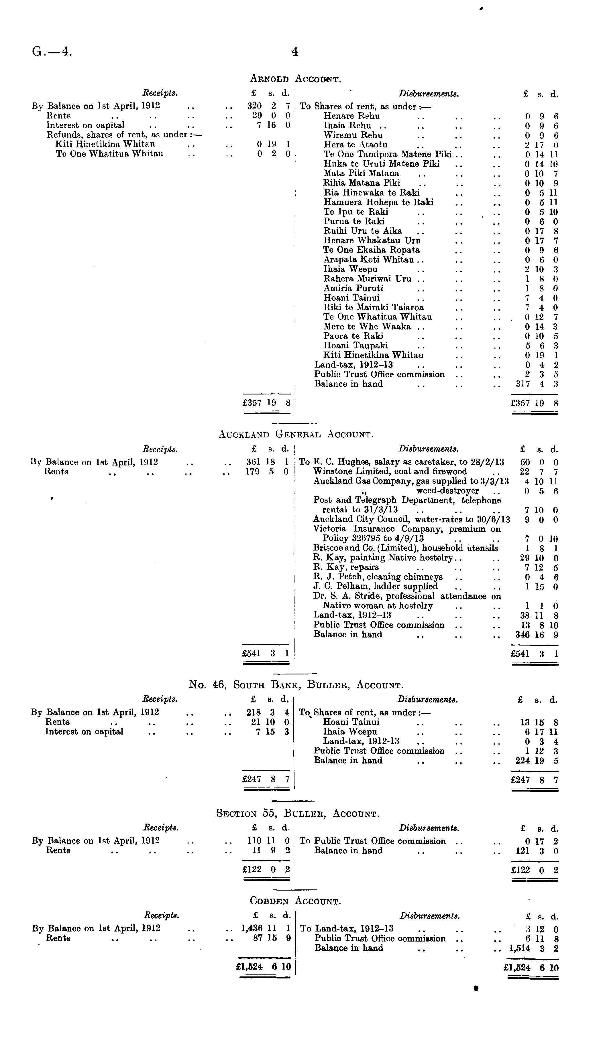 No. 46, South Bank, Buller, Account. Receipts. £ s. d. Disbursements. £ s. d. By Balance on Ist April, 1912 .. .. 218 3 4 To Shares of rent, as under:— Rents .. .. .. .. 21 10 0 " Hoani Tainui .. .. .. 13 15 8 Interest on capital .. .. .. 7 15 3 Ihaia Weepu .. .. .. 6 17 11 Land-tax, 1912-13 .. .. .. 0 3 4 Public Trust Office commission .. .. 1 12 3 Balance in hand .. .. .. 224 19 5 £247 8 7 £247 8 7
