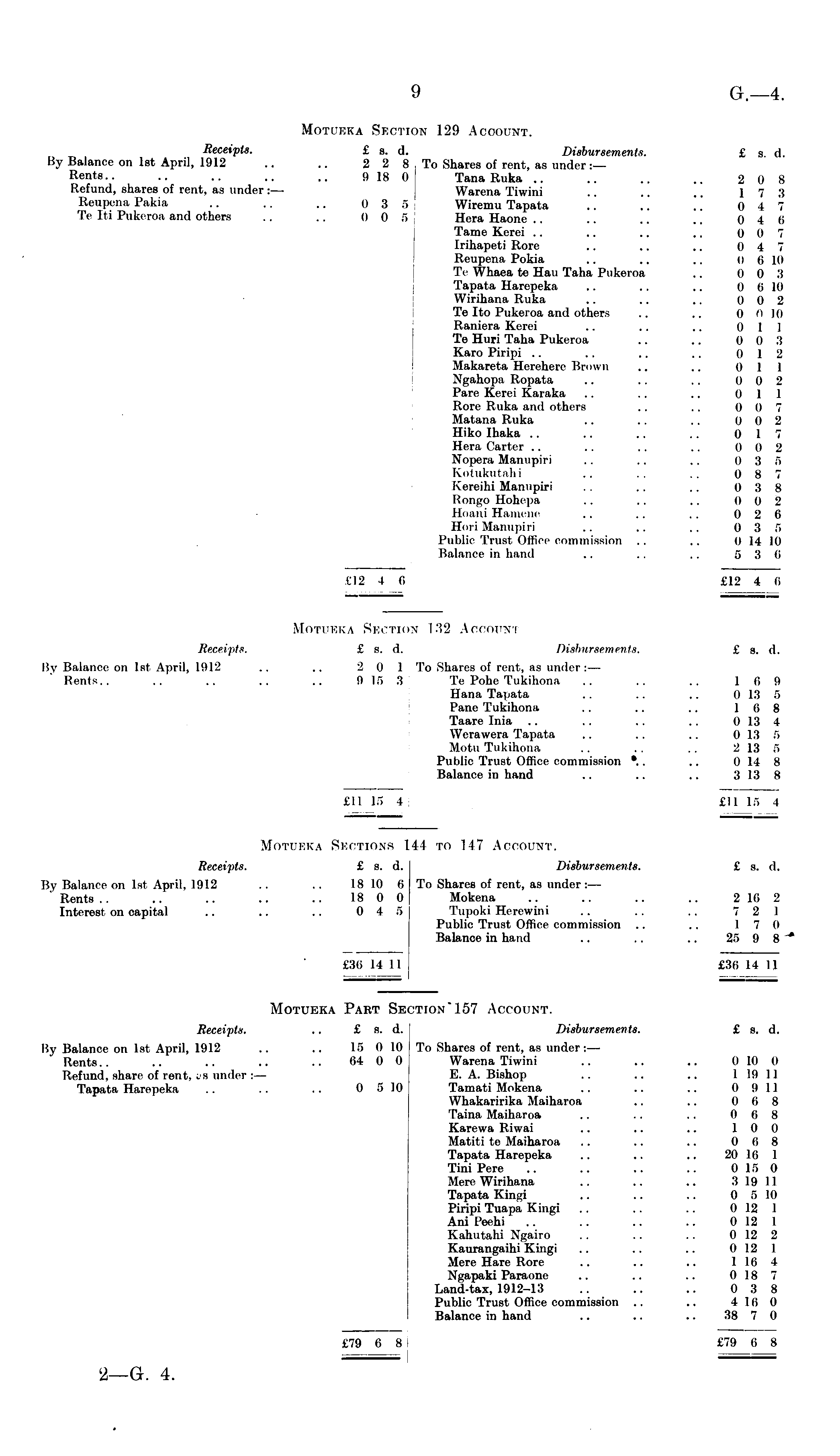 Motueka Sections 144 to 147 Account. Receipts. £ s. d. Disbursements. £ s. d. By Balance on Ist April, 1912 .. .. 18 10 6 To Shares of rent, as under : — Rents.. .. .. .. .. 18 0 0 Mokena .. .. .. .. 2 16 2 Interest on capital .. .. .. 0 4 5 Tupoki Herewini .. .. .. 7 2 1 Public Trust Office commission .. .. 17 0 Balance in hand .. .. .. 25 9 8 ' £36 14 11 £36 14 11