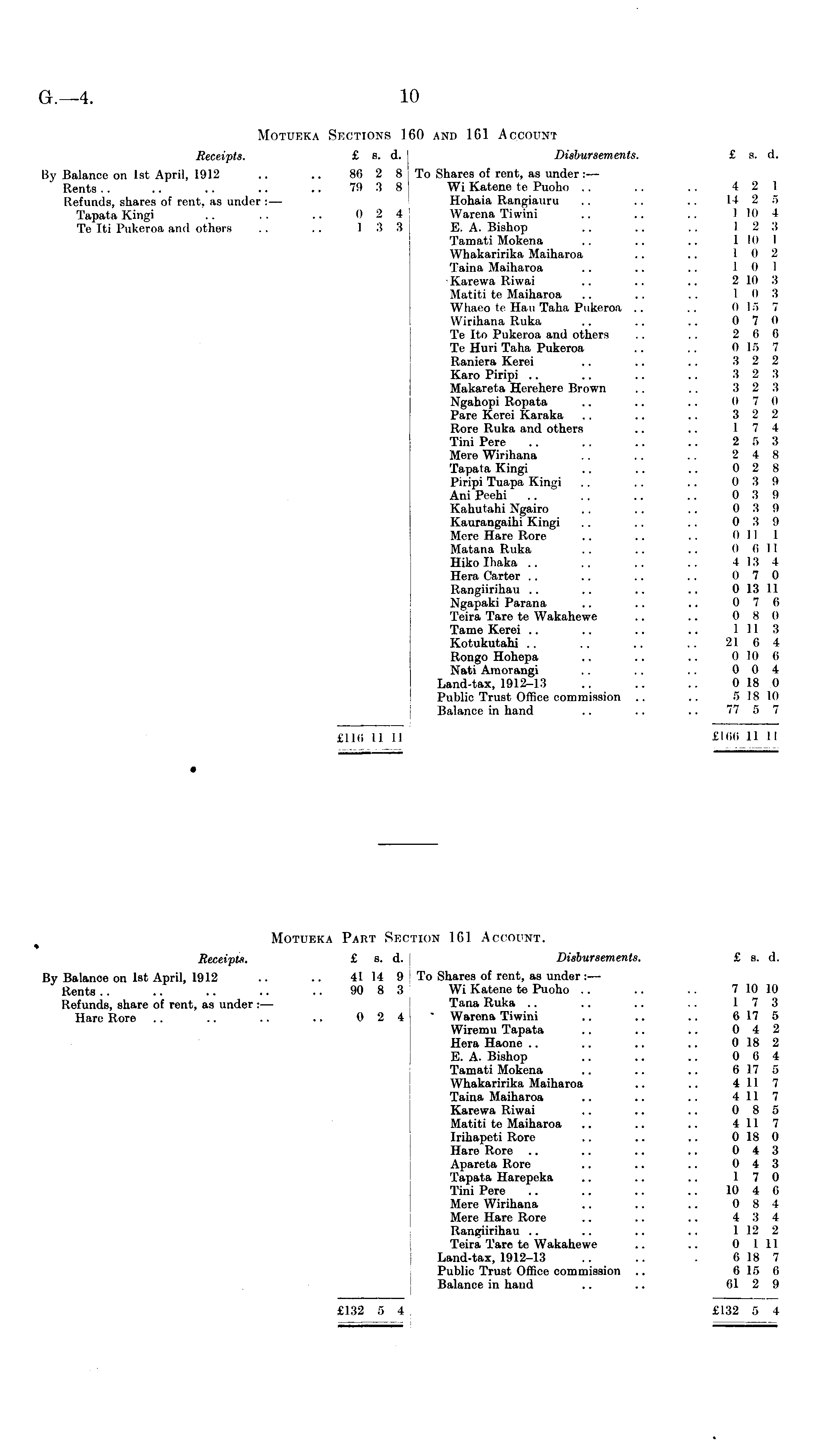 Motueka Sections 160 and 161 Account Receipts. £ s. d. Disbursements. £ s. d. By Balance on Ist April, 1912 .. .. 86 2 8 To Shares of rent, as under : — Rents.. .. .. .. .. 79 3 8 Wi Katene te Puoho .. .. .. 4 2 1 Refunds, shares of rent, as under:— Hohaia Rangiauru .. .. .. 14 2 5 Tapata Kingi .. .. .. 0 2 4 Warena Tiwini .. .. .. 110 4 Te Iti Pukeroa and others .. .. 13 3 E. A. Bishop .. .. .. 12 3 Tamati Mokena .. .. .. 110 1 Whakaririka Maiharoa .. .. 10 2 Taina Maiharoa .. .. .. 10 1 ■ Karewa Riwai .. .. .. 2 10 3 Matiti te Maiharoa .. .. .. 10 3 Whaeo te Hau Taha Pukeroa .. .. 0 15 7 Wirihana Ruka .. .. .. 0 7 0 Te Ito Pukeroa and others .. .. 2 6 6 Te Huri Taha Pukeroa .. .. 0 15 7 Raniera Kerei .. .. .. 3 2 2 Karo Piripi .. .. .. .. 3 2 3 Makareta Herehere Brown .. .. 3 2 3 Ngahopi Ropata .. .. .. 0 7 0 Pare Kerei Karaka .. .. .. 3 2 2 Rore Ruka and others .. .. 17 4 Tini Pere .. .. .. .. 2 5 3 Mere Wirihana .. .. .. 2 4 8 Tapata Kingi .. .. .. 0 2 8 Piripi Tuapa Kingi .. .. .. 0 3 9 AniPeehi .. .. .. .. 0 3 9 Kahutahi Ngairo .. .. .. 0 3 9 Kaurangaihi Kingi .. .. .. 0 3 9 Mere Hare Rore .. .. .. 0 111 Matana Ruka .. .. .. 0 0 11 Hiko Ihaka .. .. .. .. 4 13 4 Hera Carter .. .. .. .. 0 7 0 Rangiirihau .. .. .. .. 0 13 11 Ngapaki Parana .. .. .. 0 7 6 Teira Tare te Wakahewe .. .. 0 8 0 Tame Kerei .. .. .. .. 1113 Kotukutahi .. .. .. .. 21 6 4 Rongo Hohepa .. .. .. 0 10 6 Nati Amorangi .. .. .. 0 0 4 Land-tax, 1912-13 .. .. .. 018 0 Public Trust Office commission .. .. 518 10 Balance in hand .. .. .. 77 5 7 £116 11 II £166 U 11