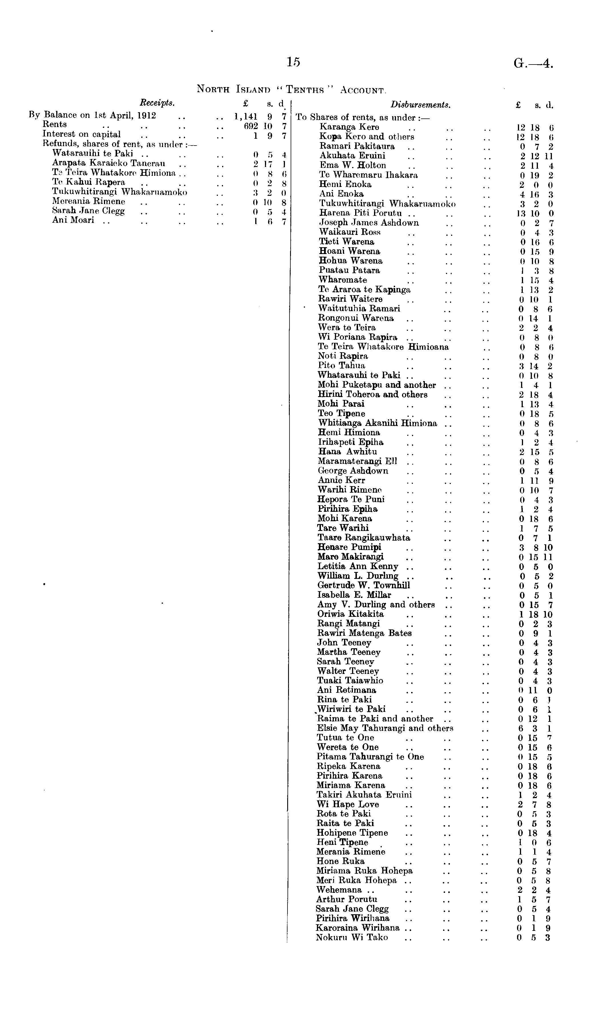North Island "Tenths" Account. Receipts. £ s. d Disbursements. £ s. d. By Balance on Ist April, 1912 .. .. 1,141 9 7 To Shares of rents, as under :— Rents •• •• •• .. 692 10 7 KarangaKere .. .. .. 12 18 6 Interest on capital .. .. .. 19 7 Kopa Kero and others .. .. 12 18 6 Refunds, shares of rent, as under:— Ramari Pakitaura .. . 0 7 2 Watarauihi te Paki .. .. .. 0 5 4 Akuhata Eruini ' 2 12 11 Arapata Karaieko Tanerau .. .. 217 1 Ema W. Holton .. .. .. 211 4 Te Teira Whatakore Himiona .. .. 0 8 6 Te Wharcmaru Ihakara .. . 019 2 Te Kahui Rapera .. .. .. 0 2 8 Hemi Enoka .. .. 2 0 0 Tukuwhitirangi Whakaruamoko .. 3 2 0 Ani Enoka .. 416 3 Mereania Rimene .. .. .. 010 8 Tukuwhitirangi Whakaruamoko .' 3 2 0 Sarah Jane Clegg .. .. .. 0 5 4 Harena Piti Porutu .. .. .. 13 10 0 Am Moari .. .. .. .. 16 7 Joseph James Ashdown 0 2 7 Waikauri Ross .. .. .. 0 4 3 Tieti Warena .. .. .. 016 6 Hoani Warena .. .. .. 0 15 9 Hohua Warena .. .. .. 0 10 8 Puatau Patara .. .. .. 13 8 Wharemate .. .. .. 115 4 Te Araroa te Kapinga .. .. 113 2 Rawiri Waitere .. .. .. 010 1 Waitutuhia Ramari .. .. 0 8 6 Rongonui Warena .. .. .. 0 14 1 Wera te Teira .. .. .. 2 2 4 Wi Poriana Rapira .. .. 0 8 0 Te Teira Whatakore Himioana .. 0 8 6 Noti Rapira .. .. .. 0 8 0 Pito Talma .. .. .. 3 14 2 Whatarauhi te Paki .. .. .. o 10 8 Mohi Puketapu and another .. .. 14 1 Hirini Toheroa and others .. .. 2 18 4 Mohi Parai .. .. .. 1 13 4 Teo Tipene .. .. .. 018 5 Whitianga Akanihi Himiona .. 0 8 6 Hemi Himiona .. .. .. 0 4 3 Irihapeti Epiha .. .. .. 12 4 Hana Awhitu .. .. .. 215 5 Maramaterangi Ell .. .. .. 0 8 6 George Ashdown .. .. .. 0 5 4 Annie Kerr .. .. .. 1 11 9 Warihi Rimene .. .. .. 010 7 Hepora Te Puni .. .. .. 0 4 3 Pirihira Epiha .. .. 12 4 Mohi Karena .. .. .. 018 6 Tare Warihi .. .. .. 17 5 Taare Rangikauwhata .. .. 0 7 1 Henare Pumipi .. .. .. 3 810 Mare Makirangi .. .. .. 0 15 11 Letitia Ann Kenny .. .. .. 0 5 0 William L. Duriing .. .. .. 0 5 2 Gertrude W. Townhill .. .. 0 5 0 Isabella E. Millar .. .. .. 0 5 1 Amy V. Duriing and others .. .. 015 7 Oriwia Kitakita .. .. .. 118 10 Rangi Matangi .. .. .. 0 2 3 Rawiri Matenga Bates .. .. 0 9 1 John Teeney .. .. .. 0 4 3 Martha Teeney .. .. .. 0 4 3 Sarah Teeney .. .. .. 0 4 3 Walter Teeney .. .. .. 0 4 3 Tuaki Taiawhio .. .. .. 0 4 3 Ani Retimana .. .. .. 0 110 Rina te Paki .. .. .. 0 6 1 .Wiriwiri te Paki .. .. .. 0 6 1 Raima te Paki and another .. .. 012 1 Elsie May Tahurangi and others .. 6 3 1 Tutua te One .. .. .. 0 15 ' Wereta te One .. .. .. 015 6 Pitama Tahurangi te One .. .. 015 5 Ripeka Karena .. .. .. 0 18 6 Pirihira Karena .. .. .. 018 6 Miriama Karena .. .. .. 0 18 6 Takiri Akuhata Eruini .. .. 12 4 Wi Hape Love .. .. .. 2 7 8 Rota te Paki .. .. .. 0 5 3 Raita te Paki .. .. .. 0 5 3 Hohipene Tipene .. .. .. 0 18 4 Heni Tipene .. .. .. 10 6 Merania Rimene .. .. .. 114 Hone Ruka .. .. .. 0 5 7 Miriama Ruka Hohepa .. .. 0 5 8 Meri Ruka Hohepa .. .. .. 0 5 8 Wehemana .. .. .. .. 2 2 4 Arthur Porutu .. .. .. 15 7 Sarah Jane Clegg .. .. .. 0 5 4 Pirihira Wirihana .. .. .. 0 19 Karoraina Wirihana .. .. .. 0 19 Nokuru Wi Tako .. .. .. 0 5 3