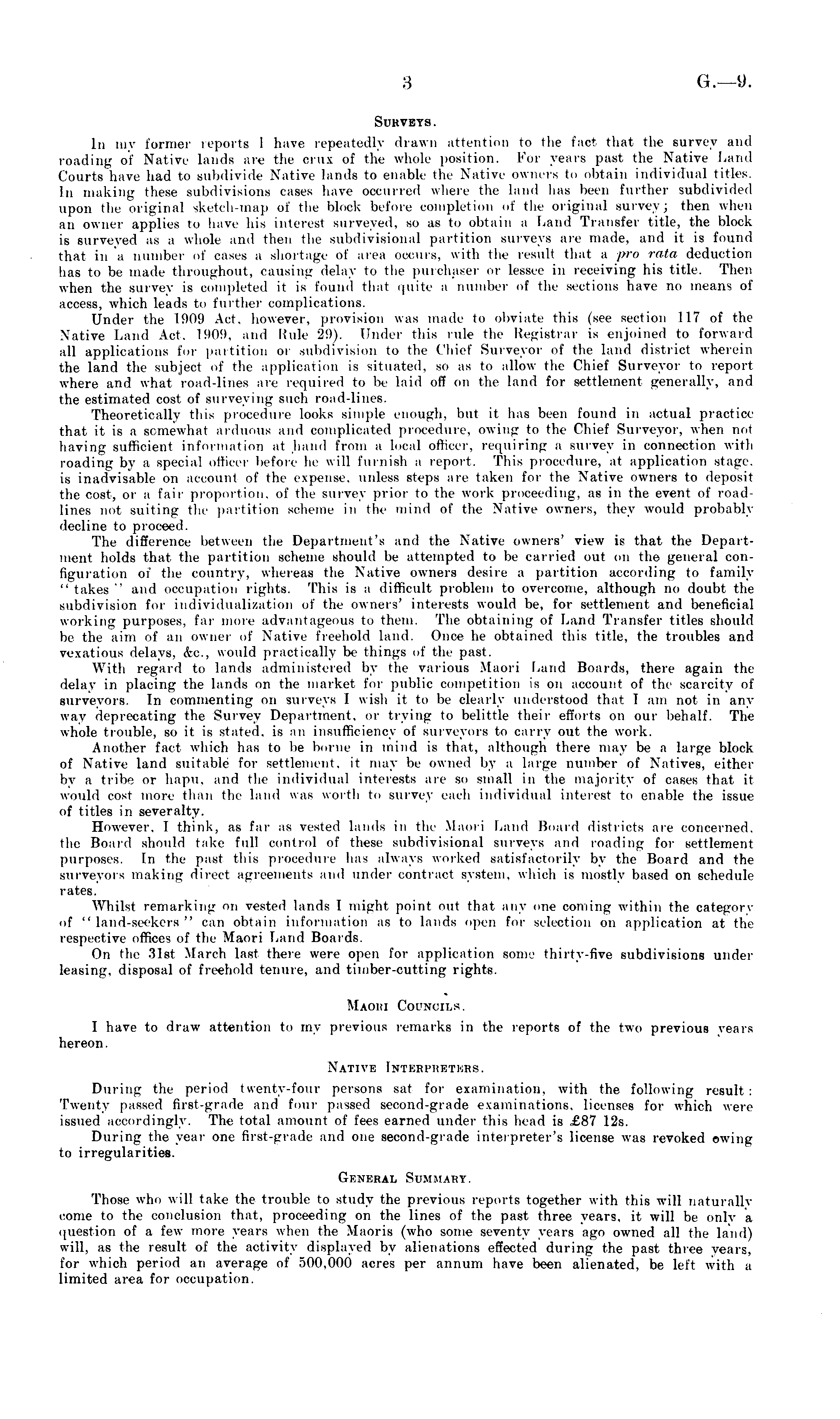 Surveys. In my former reports I have repeatedly drawn attention to the fact that the survey and reading of Native lands are the crux of the whole position. For years past the Native I.and Courts have had to subdivide Native lands to enable the Native owners to obtain individual titles. In making these subdivisions cases have occurred where the land has been further subdivided upon the original sketch-map of the block before completion of the original survey; then when an owner applies to have his interest surveyed, so as to obtain a Land Transfer title, the block is surveyed as a whole and then the subdivisional partition surveys are made, and it is found that in a number of cases a shortage of area occurs, witli the result that a pro rata deduction has to be made throughout, causing delay to the purchaser or lessee in receiving his title. Then when the survey is completed it is found that quite a number of the sections have no means of access, which leads to further complications. Under the 1909 Act, however, provision was made to obviate this (see section 117 of the Native Land Act. 1909, and Rule 29). Under this rule the Registrar is enjoined to forward all applications for partition or subdivision to the Chief Surveyor of the land district wherein the land the subject of the application is situated, so as to allow the Chief Surveyor to report where and what road-lines are required to be laid off on the land for settlement generally, and the estimated cost of surveying such road-lines. Theoretically this procedure looks simple enough, but it has been found in actual practice that it is a somewhat arduous and complicated procedure, owing to the Chief Surveyor, when not having sufficient information at hand from a local officer, requiring a survey in connection with roading by a special officer before he will furnish a report. This procedure, at application stage. is inadvisable on account of the expense, unless steps are taken for the Native owners to deposit the cost, or a fair proportion, of the survey prior to the work proceeding, as in the event of roadlines not suiting the partition scheme in the mind of the Native owners, they would probably decline to proceed. The difference between the Department's and the Native owners' view is that the Department holds that the partition scheme should be attempted to be carried out on the general configuration of the country, whereas the Native owners desire a partition according to family " takes " and occupation rights. This is a difficult problem to overcome, although no doubt the subdivision for individualization of the owners' interests would be, for settlement and beneficial working purposes, far more advantageous to them. The obtaining of Land Transfer titles should be the aim of an owner of Native freehold land. Once he obtained this title, the troubles and vexatious delays, &c, would practically be things of the past. With regard to lands administered by the various Maori Land Boards, there again the delay in placing the lands on the market for public competition is on account of the scarcity of surveyors. In commenting on surveys I wish it to be clearly understood that I am not in any way deprecating the Survey Department, or trying to belittle their efforts on our behalf. The whole trouble, so it is stated, is an insufficiency of surveyors to carry out the work. Another fact which has to be borne in mind is that, although there may be a large block of Native land suitable for settlement, it may be owned by a large number of Natives, either by a tribe or liapu, and the individual interests are so small in the majority of cases that it would cost more than the land was worth to survey each individual interest to enable the issue of titles in severalty. However, T think, as far as vested lands in the Maori Land Board districts are concerned, the Board should take full control of these subdivisional surveys and roading for settlement purposes. In the past this procedure lias always worked satisfactorily by the Board and the surveyors making direct agreements and under contract system, which is mostly based on schedule rates. Whilst remarking on vested lands I might point out that any one coming within the category of "land-seekers" can obtain information as to lands open for selection on application at the respective offices of the Maori Land Boards. On the 31st March last there were open for application some thirty-five subdivisions under leasing, disposal of freehold tenure, and timber-cutting rights. Maori Councils. I have to draw attention to my previous remarks in the reports of the two previous years hereon. Native Interpreters. During the period twenty-four persons sat for examination, with the following result : Twenty passed first-grade and four passed second-grade examinations, licenses for which were issued accordingly. The total amount of fees earned under this head is £87 12s. During the year one first-grade and one second-grade interpreter's license was revoked owing to irregularities. General Summary. Those who will take the trouble to study the previous reports together with this will naturally come to the conclusion that, proceeding on the lines of the past three years, it will be only a question of a few more years when the Maoris (who some seventy years ago owned all the land) will, as the result of the activity displayed by alienations effected during the past three years, for which period an average of 500,000 acres per annum have been alienated, be left with a limited area for occupation.