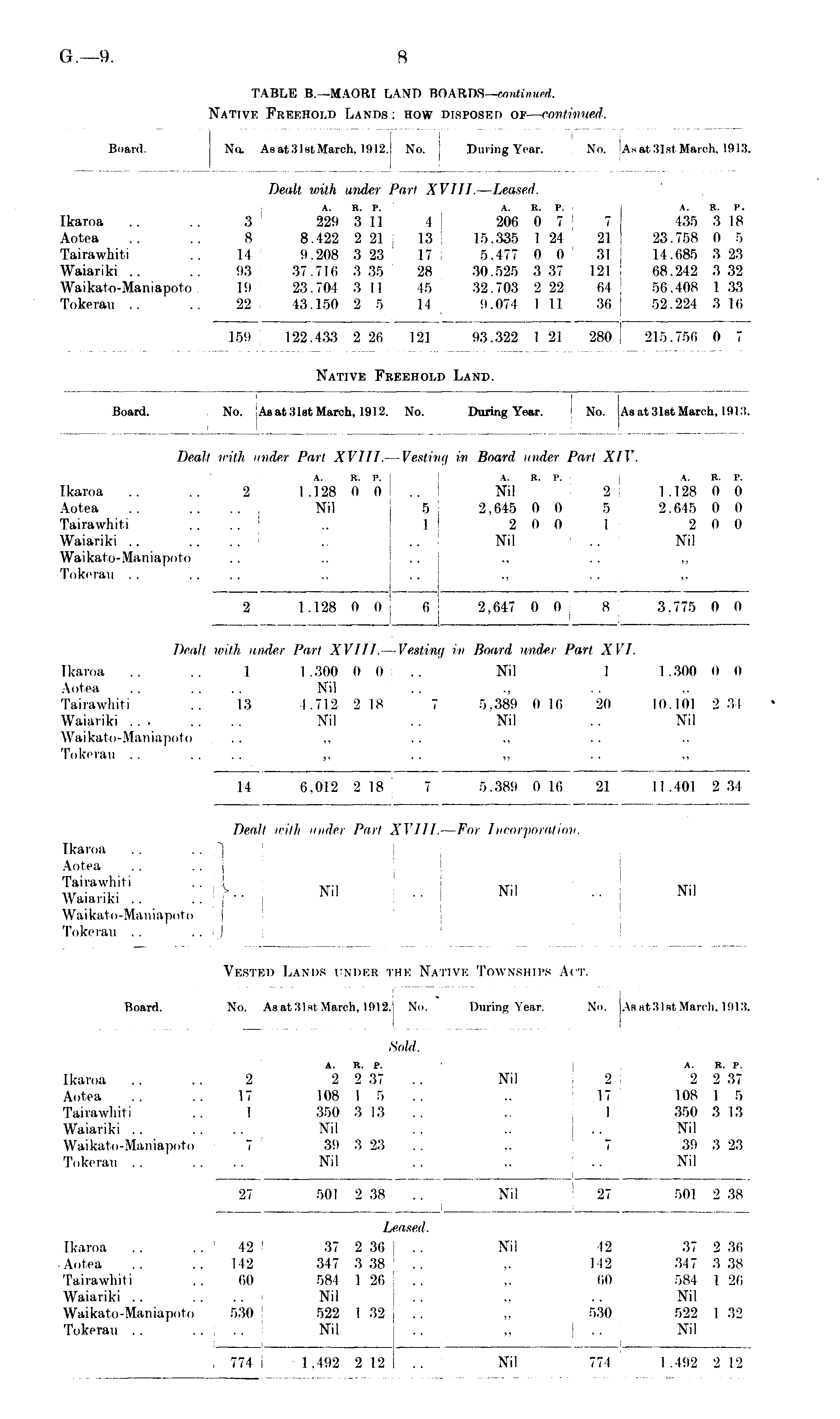 TABLE B.—MAORI LAND BOARDS—continued. Native Freehold Lands: how disposed of — continued.