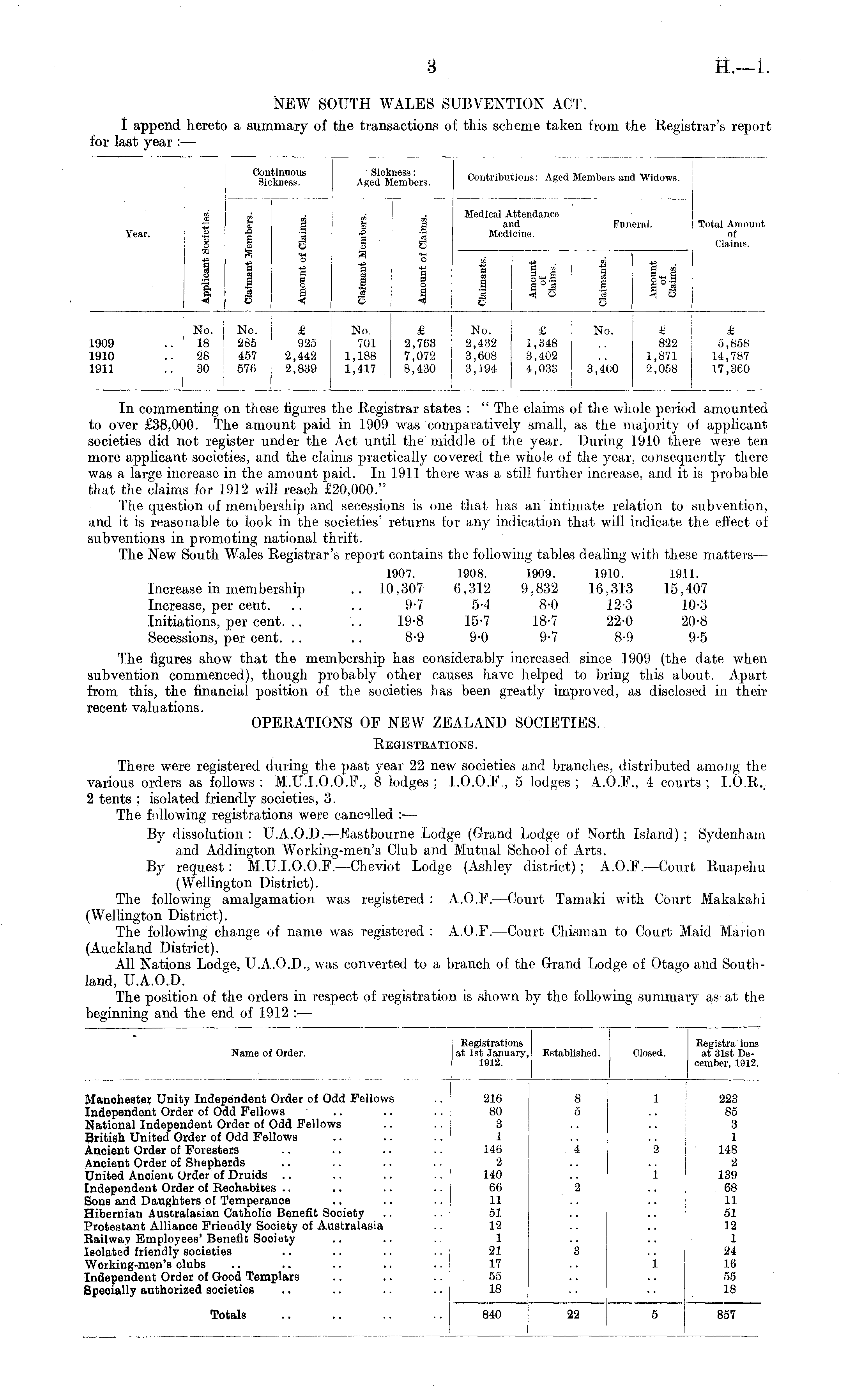 In commenting on these figures the Registrar states : " The claims of the whole period amounted to over £38,000. The amount paid in 1909 was comparatively small, as the majority of applicant societies did not register under the Act until the middle of the year. During 1910 there were ten more applicant societies, and the claims practically covered the whole of the year, consequently there was a large increase in the amount paid. In 1911 there was a still further increase, and it is probable that the claims for 1912 will reach £20,000." The question of membership and secessions is one that has an intimate relation to subvention, and it is reasonable to look in the societies' returns for any indication that will indicate the effect of subventions in promoting national thrift. The New South Wales Registrar's report contains the following tables dealing with these matters — 1907. 1908. 1909. 1910. 1911. Increase in membership .. 10,307 6,312 9,832 16,313 15,407 Increase, per cent. .. .. 9-7 5-4 8-0 12-3 10-3 Initiations, per cent. .. .. 19-8 15-7 18-7 22-0 20-8 Secessions, per cent. .. .. 8-9 9'0 9-7 8-9 9-5 The figures show that the membership has considerably increased, since 1909 (the date when subvention commenced), though probably other causes have helped to bring this about. Apart from this, the financial position of the societies has been greatly improved, as disclosed in their recent valuations. OPERATIONS OF NEW ZEALAND SOCIETIES. Registrations. There were registered during the past year 22 new societies and branches, distributed among the various orders as follows : M.U.I.O.O.F., 8 lodges ; I.O.O.F., 5 lodges ; A.O.F., 4 courts ; I.O.R.. 2 tents ; isolated friendly societies, 3. The following registrations were cancelled : — By dissolution : U.A.O.D. —Eastbourne Lodge (Grand Lodge of North Island) ; Sydenham and Addington Working-men's Club and Mutual School of Arts. By request: M.U.I.O.O.F.—Cheviot Lodge (Ashley district) ; A.O.F.—Court Ruapehu (Wellington District). The following amalgamation was registered : A.O.F. —Court Tamaki with Court Makakahi (Wellington District). The following change of name was registered : A.O.F. —Court Chisman to Court Maid Marion (Auckland District). All Nations Lodge, U.A.O.D., was converted to a branch of the Grand Lodge of Otago and Southland, U.A.O.D. The position of the orders in respect of registration is shown by the following summary as at the beginning and the end of 1912 : —