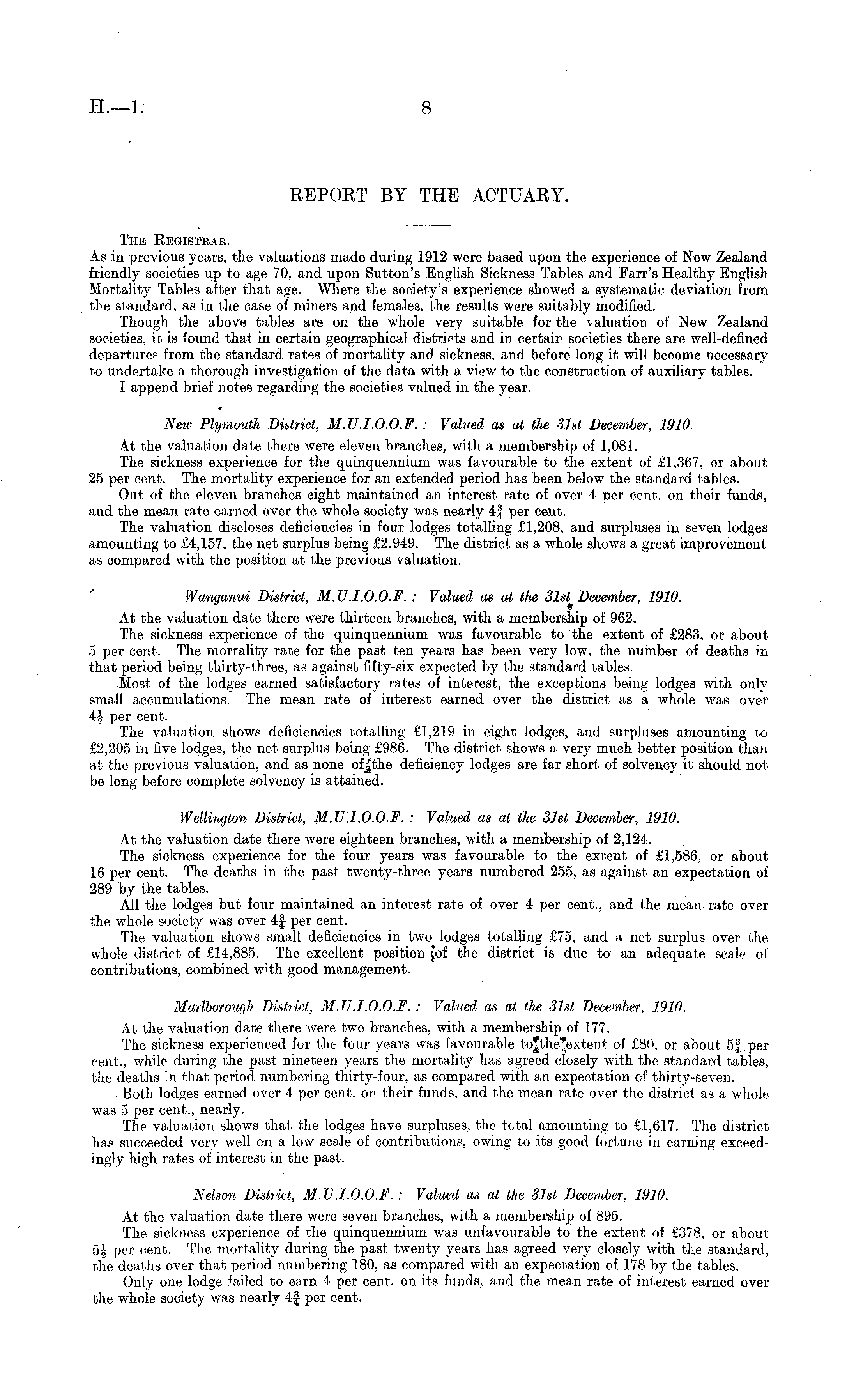 REPOKT BY THE ACTUARY. The Registrar. As in previous years, the valuations made during 1912 were based upon the experience of New Zealand friendly societies up to age 70, and upon Sutton's English Sickness Tables and Farr's Healthy English Mortality Tables after that age. Where the society's experience showed a systematic deviation from the standard, as in the case of miners and females, the results were suitably modified. Though the above tables are on the whole very suitable for the valuation of New Zealand societies, it is found that in certain geographical districts and in certain societies there are well-defined departures from the standard rates of mortality and sickness, and before long it will become necessary to undertake a thorough investigation of the data with a view to the construction of auxiliary tables. I append brief notes regarding the societies valued in the year. New Plymouth District, M.U.1.0.0.F. : Valued as at the 31st December, 1910. At the valuation date there were eleven branches, with a membership of 1,081. The sickness experience for the quinquennium was favourable to the extent of £1,367, or about 25 per cent. The mortality experience for an extended period has been below the standard tables. Out of the eleven branches eight maintained an interest rate of over 4 per cent, on their funds, and the mean rate earned over the whole society was nearly 4f per cent. The valuation discloses deficiencies in four lodges totalling £1,208, and surpluses in seven lodges amounting to £4,157, the net surplus being £2,949. The district as a whole shows a great improvement as compared with the position at the previous valuation. Wanganui District, M.U.1.0.0.F.: Valued as at the 31st December, 1910. At the valuation date there were thirteen branches, with a membership of 962. The sickness experience of the quinquennium was favourable to the extent of £283, or about 5 per cent. The mortality rate for the past ten years has been very low, the number of deaths in that period being thirty-three, as against fifty-six expected by the standard tables. Most of the lodges earned satisfactory rates of interest, the exceptions being lodges with only small accumulations. The mean rate of interest earned over the district as a whole was over 4-J; per cent. The valuation shows deficiencies totalling £1,219 in eight lodges, and surpluses amounting to £2,205 in five lodges, the net surplus being £986. The district shows a very much better position than at the previous valuation, and as none ofjthe deficiency lodges are far short of solvency it should not be long before complete solvency is attained. Wellington District, M.U.1.0.0.F. : Valued as at the 31st December, 1910. At the valuation date there were eighteen branches, with a membership of 2,124. The sickness experience for the four years was favourable to the extent of £1,586, or about 16 per cent. The deaths in the past twenty-three years numbered 255, as against an expectation of 289 by the tables. All the lodges but four maintained an interest rate of over 4 per cent., and the mean rate over the whole society was over 4f per cent. The valuation shows small deficiencies in two lodges totalling £75, and a net surplus over the whole district of £14,885. The excellent position [oi the district is due to- an adequate scale of contributions, combined with good management. Marlborough District, M.U.1.0.0.F. : Valued as at the 31st December, 1910. At the valuation date there were two branches, with a membership of 177. The sickness experienced for the four years was favourable to*the'*extent of £80, or about 5f per cent., while during the past nineteen years the mortality has agreed closely with the standard tables, the deaths in that period numbering thirty-four, as compared with an expectation of thirty-seven. Both lodges earned over 4 per cent, or their funds, and the mean rate over the district as a whole was 5 per cent., nearly. The valuation shows that the lodges have surpluses, the total amounting to £1,617. The district has succeeded very well on a low scale of contributions, owing to its good fortune in earning exceedingly high rates of interest in the past. Nelson Distiict, M.U.1.0.0.F. : Valued as at the 31st December, 1910. At the valuation date there were seven branches, with a membership of 895. The sickness experience of the quinquennium was unfavourable to the extent of £378, or about 5i per cent. The mortality during the past twenty years has agreed very closely with the standard, the deaths over that period numbering 180, as compared with an expectation of 178 by the tables. Only one lodge failed to earn 4 per cent, on its funds, and the mean rate of interest earned over the whole society was nearly 4f per cent.