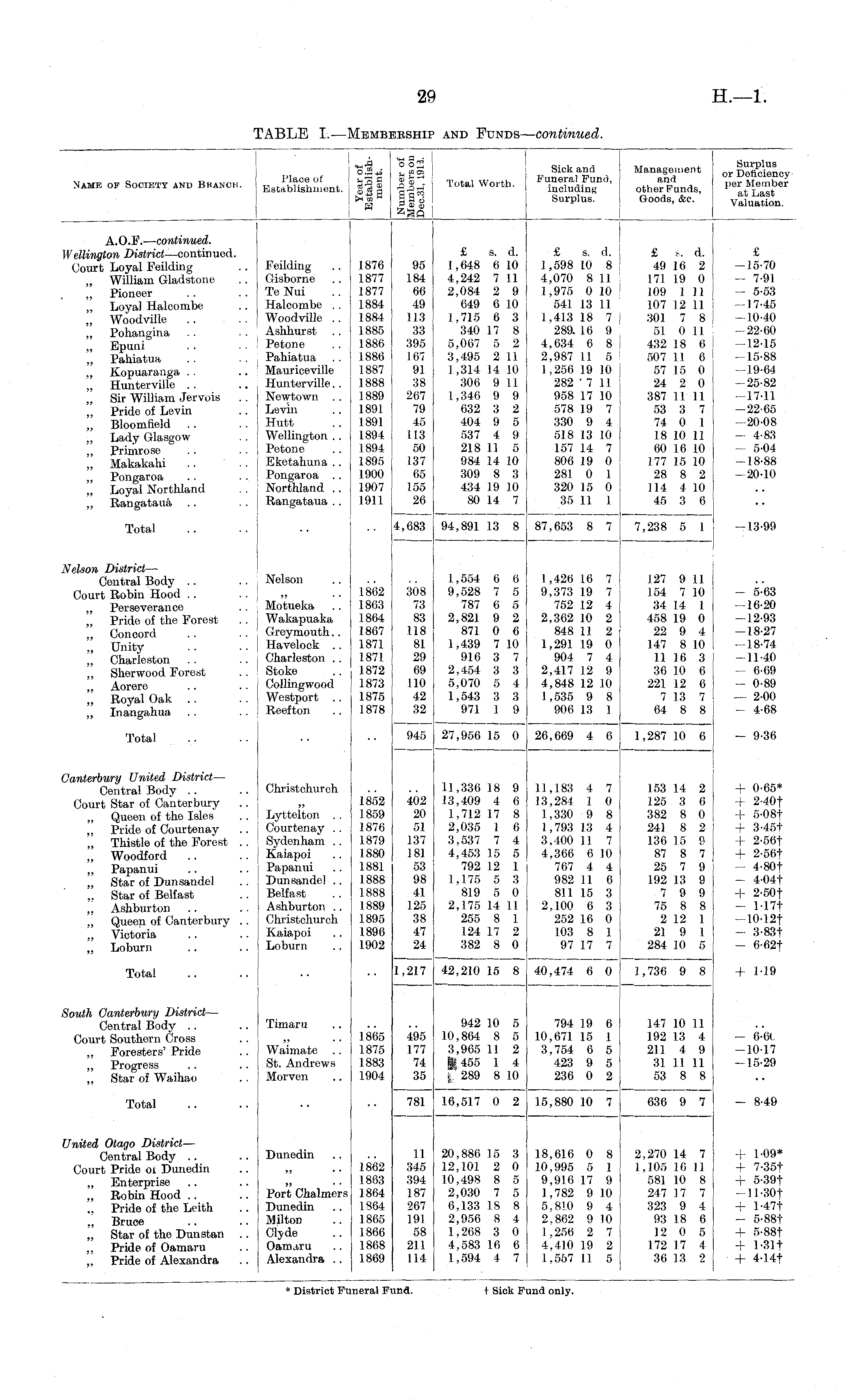 Name of Society and Bhanoh. ! A -a* •*A o o3 0.3 u a cc Place of i-J a co £ w Establishment. _tiS '§'255 \ >h io a a a o a 3 CO O) S5SQ Total Worth. Sick and Funeral Fund, including Surplus. Management and other Funds, Goods, &c. Surplus or Deficiency per Member at Last Valuation. A.O.F.— continued. Wellington District —continued. Court Loyal Feilding „ William Gladstone ,, Pioneer „ Loyal Halcombe „ Woodville „ Pohangina „ Epuni „ Pahiatua „ Kopuaranga .. „ Hunterville „ Sir William Jervois „ Pride of Levin „ Bloomfield „ Lady Glasgow ,, Primrose „ Makakahi . . . . ,, Pongaroa „ Loyal Northland ,, Rangataua Feilding Gisborne Te Nui Halcombe . . Woodville . . Ashhurst Petone Pahiatua Mauriceville Hunterville.. Newtown Levin Hutt Wellington .. Petone Eketahuna .. Pongaroa .. Northland .. Rangataua .. 1876 1877 1877 1884 1884 1885 1886 1886 1887 1888 1889 1891. 1891 1894 1894 1895 1900 1907 1911 95 184 66 49 113 33 395 167 91 38 267 79 45 113 50 137 65 155 26 £ s. d. 1,648 6 10 4,242 7 11 2,084 2 9 649 6 10 1,715 6 3 340 1.7 8 5,067 5 2 3,495 2 11 1,314 14 10 306 9 11 1,346 9 9 632 3 2 404 9 5 537 4 9 218 11 5 984 14 10 309 8 3 434 19 10 80 14 7 £ s. d. 1,598 10 8 4,070 8 II 1,975 0 10 541 13 11 1,413 18 7 289. 16 9 4,634 6 8 2,987 11 5 1,256 19 10 | 282 ' 7 11 958 17 10 578 19 7 330 9 4 518 13 10 157 14 7 806 19 0 281 0 1 320 15 0 35 11 1 £ f. d. 49 16 2 171 19 0 109 1 11 107 12 11 301 7 8 51 0 11 432 18 6 507 11 6 57 15 0 24 2 0 387 11 11 53 3 7 74 0 1 18 10 11 60 16 10 177 15 10 28 8 2 114 4 10 45 3 6 £ -15-70 - 7-91 - 5-53 -17-45 -10-40 -22-60 -12-15 -15-88 -19-64 25-82 -17-11 -22-65 -20-08 - 4-83 - 5-04 -18-88 -20-10 Total 4,683 94,891 13 8 87,653 8 7 7,238 5 1 -13-99 Nelson District — Central Body Court Robin Hood .. ,, Perseverance „ Pride of tho Forest ,, Concord „ Unity „ Charleston ,, Sherwood Forest ,, Aorere „ Royal Oak . . ,, Inangahua Nelson Motueka Wakapuaka Greymouth.. Havelock . . Charleston .. Stoke Collingwood Westport .. Reefton 1862 1863 1864 1867 1871 1871 1872 1873 1875 1878 308 73 83 118 81 29 69 110 42 32 1,554 6 6 9,528 7 5 787 6 5 2,821 9 2 871 0 6 1,439 7 10 916 3 7 2,454 3 3 5,070 5 4 1,543 3 3 971 1 9 1,426 16 7 9,373 19 7 i 752 12 4 2,362 10 2 848 11 2 1,291 19 0 904 7 4 2,417 12 9 4,848 12 10 1,535 9 8 906 13 I I 127 9 11 154 7 10 34 14 1 458 19 0 22 9 4 147 8 10 11 16 3 36 10 6 j 221 12 6 7 13 7 ! 64 8 8 - 5-63 -16-20 -12-93 -18-27 -18-74 -11-40 - 6-69 - 0-89 - 2-00 - 4-68 Total 945 27,956 15 0 26,669 4 6 1,287 10 6 - 9-36 Canterbury United District — Central Body Court Star of Canterbury „ Queen of the Isles ,, Pride of Courtenay „ Thistle of the Forest . . „ Woodford „ Papanui „ Star of Dunsandel Star of Belfast „ Ashburton „ Queen of Canterbury . . ,, Victoria „ Loburn Christchurch Lyttelton . . Courtenay . . Sydenham .. Kaiapoi Papanui Dunsandel .. Belfast Ashburton .. Christchurch Kaiapoi Loburn 1852 1859 1876 1879 1880 1.881 1888 1888 1889 1895 1896 1902 402 20 51 137 181 53 98 41 125 38 47 24 11,336 18 9 13,409 4 6 1,712 17 8 2,035 1 6 3,537 7 4 4,453 15 5 792 12 1 1,175 5 3 819 5 0 2,175 14 11 255 8 I 124 17 2 382 8 0 11,183 4 7 13,284 1 0 1,330 9 8 1,793 13 4 3,400 11 7 4,366 6 10 767 4 4 982 11 6 811 15 3 2,100 6 3 252 16 0 103 8 1 97 17 7 153 14 2 125 3 6 382 8 0 241 8 2 136 15 9 87 8 7 25 7 9 192 13 9 7 9 9 75 8 8 2 12 1 21 9 1 284 10 5 + 0-65* + 2-40t + 5-08f + 3-45t + 2-56f + 2-56t - 4-80-j- - 4-04t + 2-50f - l-17t -10-12t - 3-83t - 6-62f Total 1,217 42,210 15 8 40,474 6 0 1,736 9 8 + 1-19 South Canterbury District — Central Body Court Southern Cross „ Foresters' Pride „ Progress „ Star of Waihao Timaru Waimate St. Andrews Morven 1865 1875 1883 1904 495 177 74 35 942 10 5 10,864 8 5 3,965 11 2 S 455 1 4 | 289 8 10 794 19 6 10,671 15 1 3,754 6 5 423 9 5 236 0 2 147 10 11 192 13 4 211 4 9 31 11 11 53 8 8 - 6-61 -10-17 -15-29 Total 781 16,517 0 2 15,880 10 7 636 9 7 - 8-49 United Otago District — Central Body Court Pride oi Dunedin „ Enterprise „ Robin Hood Pride of the Leith ,, Bruce „ Star of the Dunstan „ Pride of Oamaru „ Pride of Alexandra Dunedin Port Chalmers Dunedin Milton Clyde Oamaru Alexandra .. 1862 1863 1864 1864 1865 1866 1868 1869 11 345 394 187 267 191 58 211 114 20,886 15 3 12,101 2 0 10,498 8 5 2,030 7 5 6,133 18 8 2,956 8 4 1,268 3 0 4,583 16 6 1,594 4 7 18,616 0 8 10,995 5 1 9,916 17 9 1,782 9 10 5,810 9 4 2,862 9 10 1,256 2 7 4,410 19 2 1.567 11 5 2,270 14 7 1,105 16 11 581 10 8 247 17 7 323 9 4 93 18 6 12 0 5 172 17 4 36 13 2 + 109* + 7-35t + 5-39f -]]-30t + l-47t - 5-88t + 5-88t + l-31t + 4-14t * District Funeral F' md. t Sick F ind only.