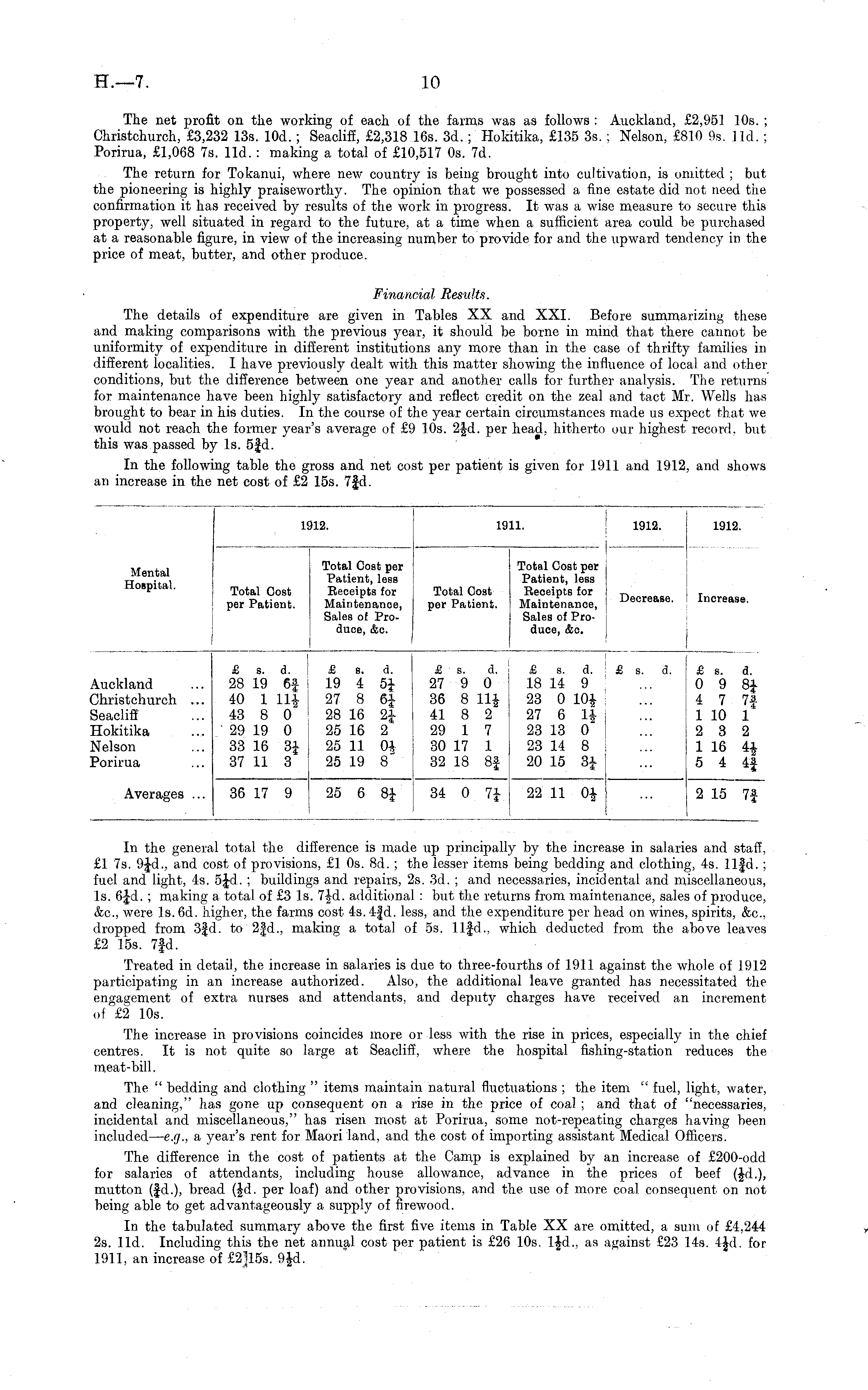 The net profit on the working of each of the farms was as follows : Auckland, £2,951 10s. ; Christchurch, £3,232 13s. lOd.; Seacliff, £2,318 16s. 3d.; Hokitika, £135 3s. ; Nelson, £810 9s. lid. ; Porirua, £1,068 7s. lid. : making a total of £10,517 os. 7d. The return for Tokanui, where new country is being brought into cultivation, is omitted ; but the pioneering is highly praiseworthy. The opinion that we possessed a fine estate did not need the confirmation it has received by results of the work in progress. It was a wise measure to secure this property, well situated in regard to the future, at a time when a sufficient area could be purchased at a reasonable figure, in view of the increasing number to provide for and the upward tendency in the price of meat, butter, and other produce. Financial Results. The details of expenditure are given in Tables XX and XXI. Before summarizing these and making comparisons with the previous year, it should be borne in mind that there cannot be uniformity of expenditure in different institutions any more than in the case of thrifty families in different localities. I have previously dealt with this matter showing the influence of local and other conditions, but the difference between one year and another calls for further analysis. The returns for maintenance have been highly satisfactory and reflect credit on the zeal and tact Mr. Wells has brought to bear in his duties. In the course of the year certain circumstances made us expect that we would not reach the former year's average of £9 10s. 2§d. per head, hitherto our highest record, but this was passed by Is. s|d. In the following table the gross and net cost per patient is given for 1911 and 1912, and shows an increase in the net cost of £2 15s. 7|d.