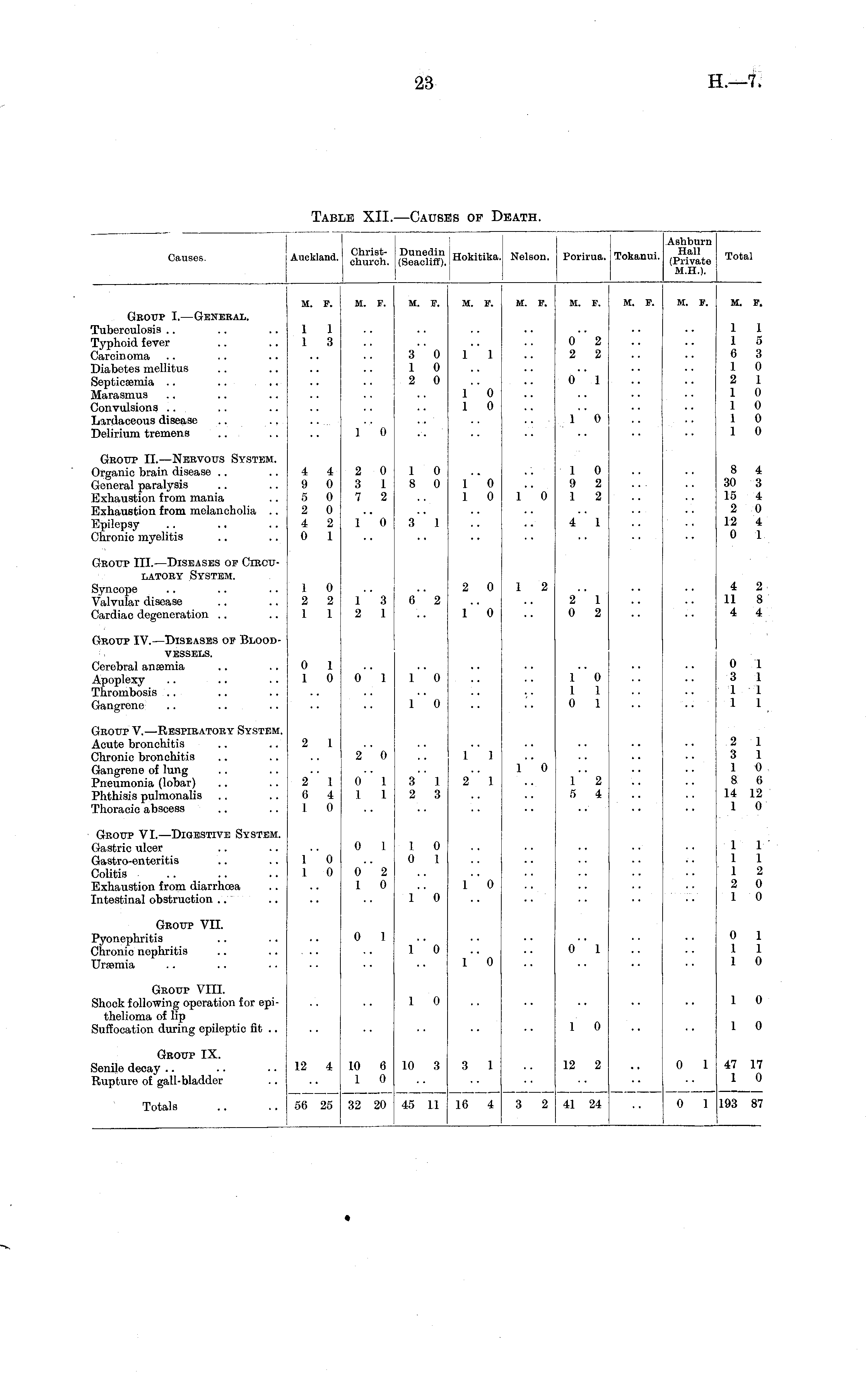 Causes. Auckland. Christ- Dunedin Hokitika church. (Seacliff). hokitika. Nelson. Porirua. Tokanui. Ashburn Hall (Private M.H.). Total M. P. M. P. M. P. M. P. M. P. M. P. M. P. M. P. M. P. Group I. —General. Tuberculosis Typhoid fever Carcinoma Diabetes mellitus Septicaemia .. .. Marasmus Convulsions .. Lardaceous disease .. ., Delirium tremens 1 1 1 3 3 0 1 0 2 0 1 1 0" 2 2 2 0 1 1 1 1 5 6 3 1 0 2 1 1 0 1 0 1 0 1 0 1 0 1 0 1 0 1 0 Group II. —Nervous System. Organic brain disease General paralysis Exhaustion from mania Exhaustion from melancholia .. Epilepsy Chronic myelitis 4 4 9 0 5 0 2 0 4 2 0 1 2 0 3 1 7 2 1 0 8 0 1 0 1 0 1" 0 1 0 9 2 1 2 8 4 30 3 15 4 2 0 12 4 0 1 l" 0 3 1 4 1 Group III.—Diseases of Circulatory System. 2 0 1 2 Syncope Valvular disease Cardiac degeneration 1 2 1 0 2 1 1 3 2 1 6" 2 2 1 0 2 4 11 4 2 8 4 1 0 Group IV. —Diseases of Bloodvessels. Cerebral anaemia Apoplexy Thrombosis 0 1 1 0 o" 1 1 0 1 0 1 1 0 1 0 1 3 1 11 1 1 Gangrene 1 0 Group V.—Respiratory System. Acute bronchitis Chronic bronchitis Gangrene of lung Pneumonia (lobar) Phthisis pulmonalis Thoracic abscess 2 1 2 1 6 4 1 0 2" 0 3" 1 2 3 1 1 2 1 1 0 2 1 3 1 1 0 8 6 14 12 1 0 0 1 1 1 1 2 5 4 Group VI.—Digestive System. Gastric ulcer Gastro-enteritis Colitis Exhaustion from diarrhoea Intestinal obstruction 1 0 1 0 0 1 0 2 1 0 1 0 0 1 1 1 1 1 1 2 2 0 1 0 1 0 1 0 Group VII. Pyonephritis Chronic nephritis Uraemia 0 1 1 0 0 1 0 1 1 1 1 0 l" 0 Group VIII. Shock following operation for epithelioma of lip Suffocation during epileptic fit .. 1 0 1 0 1 0 1 0 Group IX. Senile decay Rupture of gall-bladder 12 4 10 6 1 0 10 3 3 1 12 2 0 1 47 17 1 0 Totals 56 25 32 20 45 11 16 4 3 2 41 24 0 1 193 87