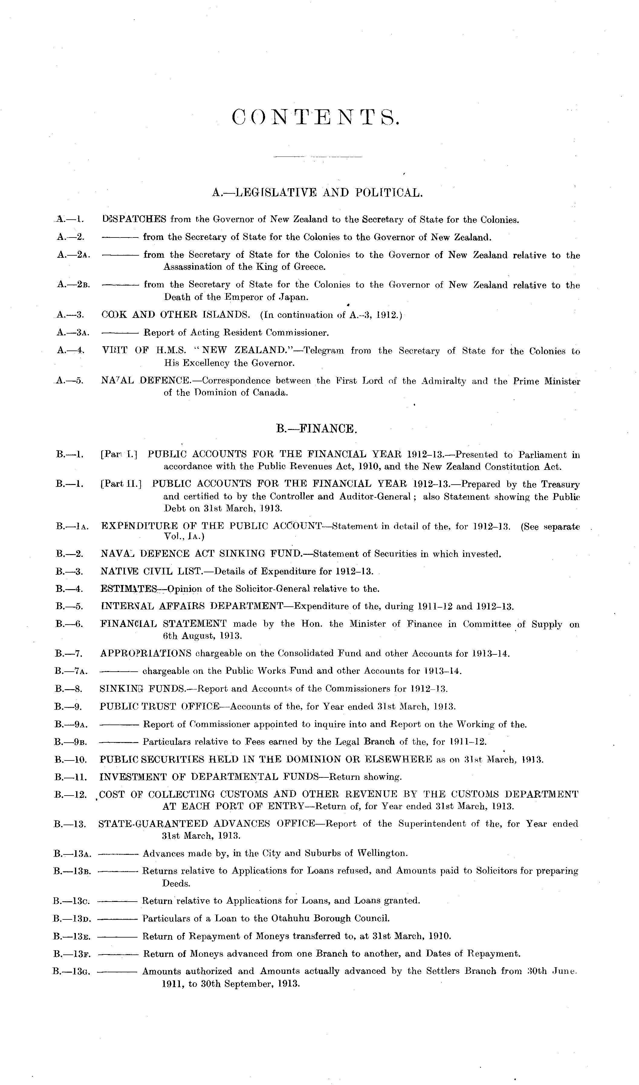A.—LEGISLATIVE AND POLITICAL. A. —I. lES PATCHES from the Governor of New Zealand to the Secretary of State for the Colonies. A.—2. from the Secretary of State for the Colonies to the Governor of New Zealand. A.—2a. from the Secretary of State for the Colonies to the Governor of New Zealand relative to the Assassination of the King of Greece. A.—2b. from the Secretary of State for the Colonies to the Governor of New Zealand relative to the Death of the Emperor of Japan. A.—3. COOK AND OTHER ISLANDS. (In continuation of A.-3, 1912.) A.—3a. Report of Acting Resident Commissioner. A.—4. VfilT OF H.M.S. "NEW ZEALAND."—Telegram from the Secretary of State for the Colonies to His Excellency the Governor. A.—s. NA'AL DEFENCE. —Correspondence between the First Lord of the Admiralty and the Prime Minister of the Dominion of Canada. B.—FINANCE. B.—l. [Pan 1.1 PUBLIC ACCOUNTS FOR THE FINANCIAL YEAR 1912-13.—Presented to Parliament in accordance with the Public Revenues Act, 1910, and the New Zealand Constitution Act. B.—l. [Part ll.] PUBLIC ACCOUNTS FOR THE FINANCIAL YEAR 1912-13.—Prepared by the Treasury and certified to by the Controller and Auditor-General ; also Statement showing the PublicDebt on 31st March, 1913. B.—lA. EXPENDITURE OF THE PUBLIC ACCOUNT—Statement in detail of the, for 1912-13. (See separate Vol., la.) 8.—2. NAVA:, DEFENCE ACT SINKING FUND.—Statement of Securities in which invested. 8.—3. NATIVE CIVIL LlST.—Details of Expenditure for 1912-13. B. —4. ESTIMATES —Opinion of the Solicitor-General relative to the. 8.—5. INTERNAL AFFAIRS DEPARTMENT—Expenditure of the, during 1911-12 and 1912-13. 8.—6. FINANCIAL STATEMENT made by the Hon. the Minister of Finance in Committee of Supply on bth August, 1913. 8.—7. APPROPRIATIONS chargeable on the Consolidated Fund and other Accounts for 1913-14. B. —7a. chargeable on the Public Works Fund and other Accounts for 1913-14. B.—B. SINKING! FUNDS.—Report and Accounts of the Commissioners for 1912-13. 8.—9. PUBLIC TRUST OFFlCE—Accounts of the, for Year ended 31st March, 1913. B.—9a. Report of Commissioner appointed to inquire into and Report on the Working of the. B.—9b. Particulars relative to Fees earned by the Legal Branch of the, for 1911-12. B.—lo. PUBLIC SECURITIES HELD IN THE DOMINION OR ELSEWHERE as on 31st March, 1913. B.—ll. INVESTMENT OF DEPARTMENTAL FUNDS—Return showing. 8.—12. COST OF COLLECTING CUSTOMS AND OTHER REVENUE BY THE CUSTOMS DEPARTMENT AT EACH PORT OF ENTRY—Return of, for Year ended 31st March, 1913. 8.—13. STATE-GUARANTEED ADVANCES OFFICE—Report of the Superintendent of the, for Year ended 31st March, 1913. 8.-—l3a. Advances made by, in the- City and Suburbs of Wellington. 8.—13b. Returns relative to Applications for Loans refused, and Amounts paid to Solicitors for preparing Deeds. 8.—13c. Return relative to Applications for Loans, and Loans granted. 8.—13d. Particulars of a Loan to the Otahuhu Borough Council. B. —13e. Return of Repayment of Moneys transferred to, at 31st March, 1910. 8.—13e. Return of Moneys advanced from one Branch to another, and Dates of Repayment. B. —13(3. Amounts authorized and Amounts actually advanced by the Settlers Branch from 30th June. 1911, to 30th September, 1913.