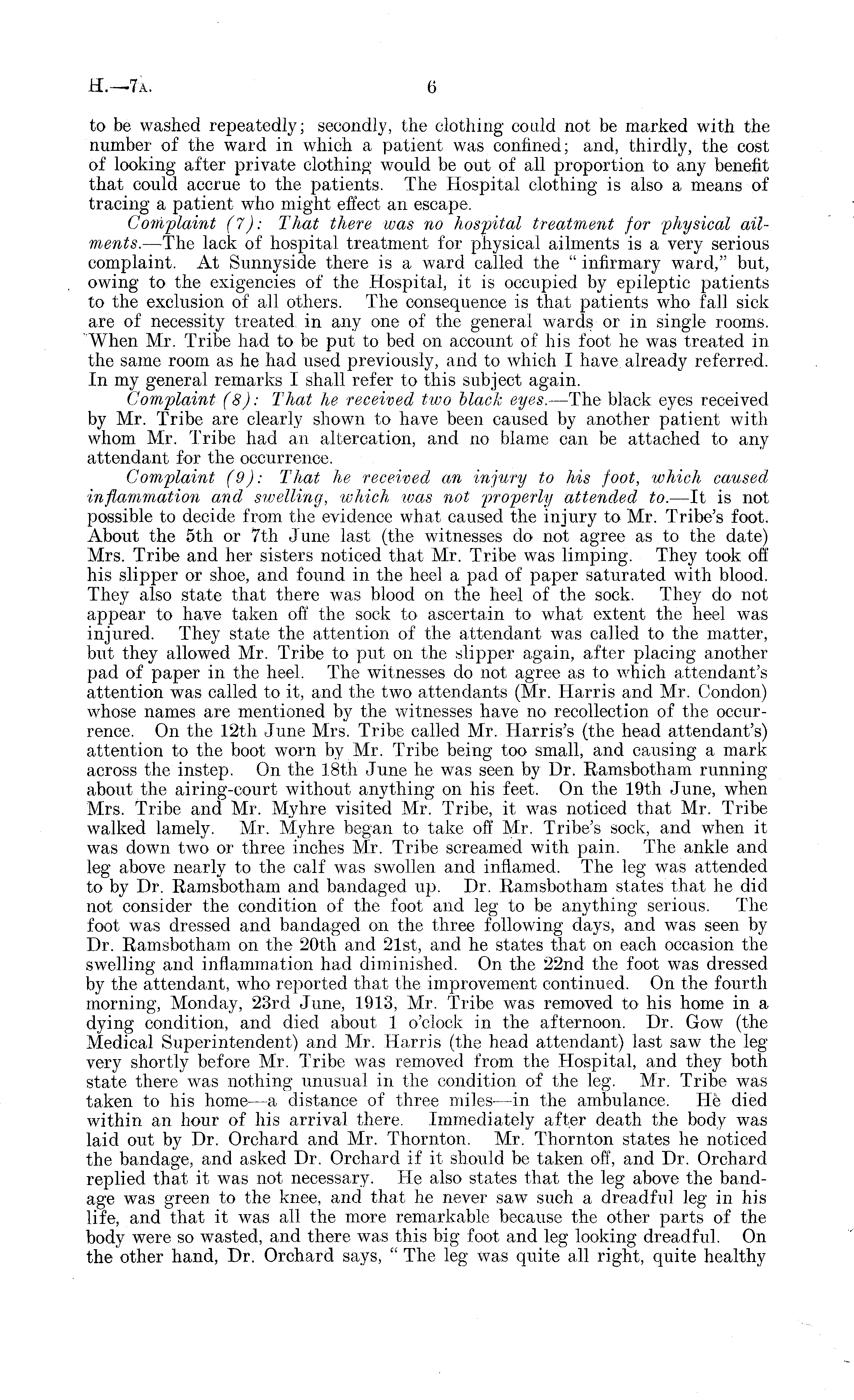 to be washed repeatedly; secondly, the clothing could not be marked with the number of the ward in which a patient was confined; and, thirdly, the cost of looking after private clothing would be out of all proportion to any benefit that could accrue to the patients. The Hospital clothing is also a means of tracing a patient who might effect an escape. Complaint (7): That there was no hospital treatment for physical ailments. —The lack of hospital treatment for physical ailments is a very serious complaint. At Sunnyside there is a ward called the " infirmary ward," but, owing to the exigencies of the Hospital, it is occupied by epileptic patients to the exclusion of all others. The consequence is that patients who fall sick are of necessity treated in any one of the general wards or in single rooms. When Mr. Tribe had to be put to bed on account of his foot he was treated in the same room as he had used previously, and to which I have already referred. In my general remarks I shall refer to this subject again. Complaint (8): That he received two black eyes. —The black eyes received by Mr. Tribe are clearly shown to have been caused by another patient with whom Mr. Tribe had an altercation, and no blame can be attached to any attendant for the occurrence. Complaint (9): That he received an injury to his foot, which caused inflammation and swelling, which was not 'properly attended to. —It is not possible to decide from the evidence what caused the injury to Mr. Tribe's foot. About the sth or 7th June last (the witnesses do not agree as to the date) Mrs. Tribe and her sisters noticed that Mr. Tribe was limping. They took off his slipper or shoe, and found in the heel a pad of paper saturated with blood. They also state that there was blood on the heel of the sock. They do not appear to have taken off the sock to ascertain to what extent the heel was injured. They state the attention of the attendant was called to the matter, but they allowed Mr. Tribe to put on the slipper again, after placing another pad of paper in the heel. The witnesses do not agree as to which attendant's attention was called to it, and the two attendants (Mr. Harris and Mr. Condon) whose names are mentioned by the witnesses have no recollection of the occurrence. On the 12th June Mrs. Tribe called Mr. Harris's (the head attendant's) attention to the boot worn by Mr. Tribe being too small, and causing a mark across the instep. On the 18th June he was seen by Dr. Ramsbotham running about the airing-court without anything on his feet. On the 19th June, when Mrs. Tribe and Mr. Myhre visited Mr. Tribe, it was noticed that Mr. Tribe walked lamely. Mr. Myhre began to take off Mr. Tribe's sock, and when it was down two or three inches Mr. Tribe screamed with pain. The ankle and leg above nearly to the calf was swollen and inflamed. The leg was attended to by Dr. Ramsbotham and bandaged up. Dr. Ramsbotham states that he did not consider the condition of the foot and leg to be anything serious. The foot was dressed and bandaged on the three following days, and was seen by Dr. Ramsbotham on the 20th and 21st, and he states that on each occasion the swelling and inflammation had diminished. On the 22nd the foot was dressed by the attendant, who reported that the improvement continued. On the fourth morning, Monday, 23rd June, 1913, Mr. Tribe was removed to his home in a dying condition, and died about 1 o'clock in the afternoon. Dr. Gow (the Medical Superintendent) and Mr. Harris (the head attendant) last saw the leg very shortly before Mr. Tribe was removed from the Hospital, and they both state there was nothing unusual in the condition of the leg. Mr. Tribe was taken to his home—a distance of three miles—in the ambulance. He died within an hour of his arrival there. Immediately after death the body was laid out by Dr. Orchard and Mr. Thornton. Mr. Thornton states he noticed the bandage, and asked Dr. Orchard if it should be taken off, and Dr. Orchard replied that it was not necessary. He also states that the leg above the bandage was green to the knee, and that he never saw such a dreadful leg in his life, and that it was all the more remarkable because the other parts of the body were so wasted, and there was this big foot and leg looking dreadful. On the other hand, Dr. Orchard says, " The leg was quite all right, quite healthy