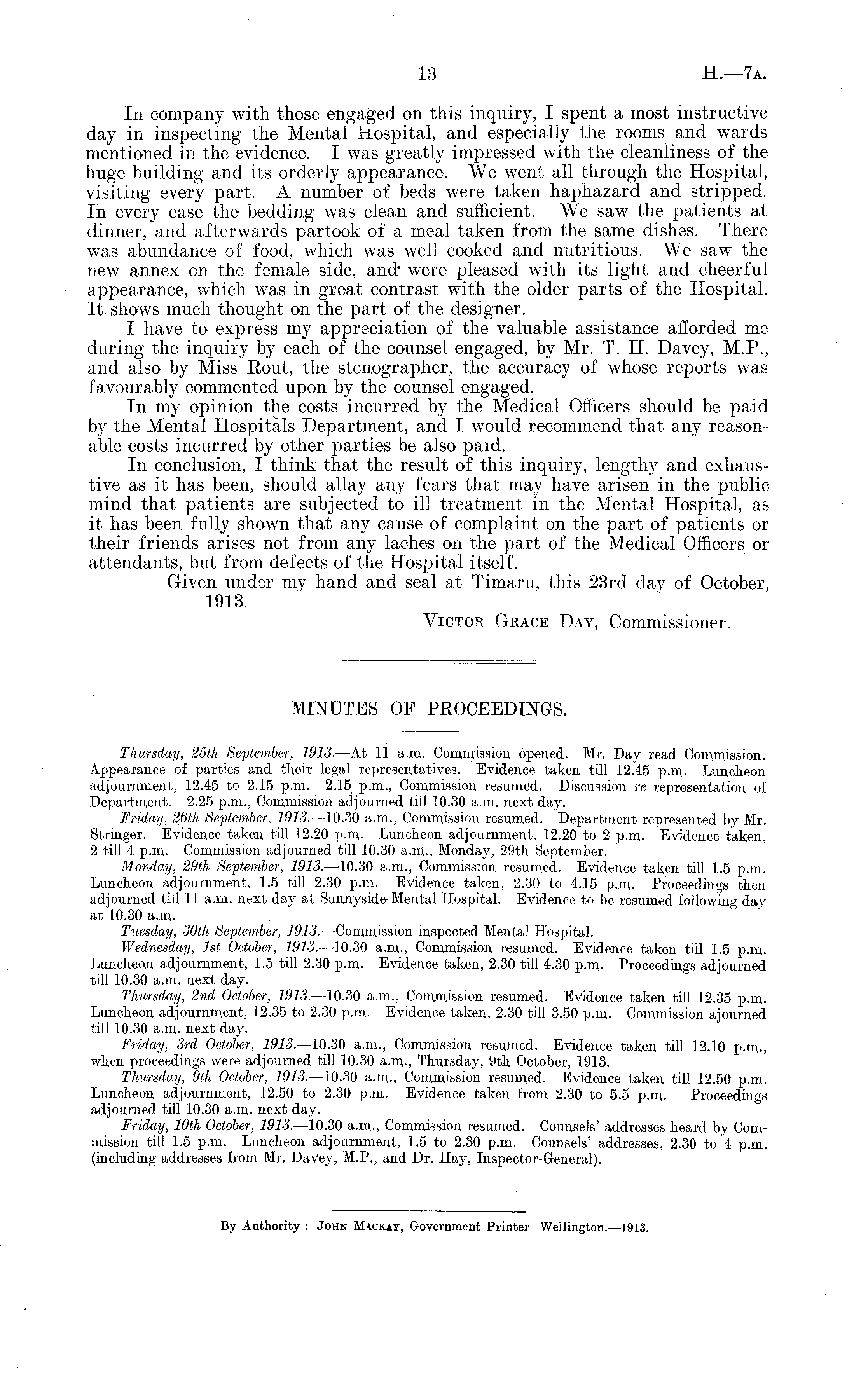 MINUTES OF PKOCEBDINGS. Thursday, 25th September, 1913. —At 11 a.m. Commission opened. Mr. Day read Commission. Appearance of parties and their legal representatives. Evidence taken till 12.45 p.m. Luncheon adjournment, 12.45 to 2.15 p.m. 2.15 p.m., Commission resumed. Discussion re representation of Department. 2.25 p.m., Commission adjourned till 10.30 a.m. next day. Friday, 26th September, 1913. —10.30 a.m., Commission resumed. Department represented by Mr. Stringer. Evidence taken till 12.20 p.m. Luncheon adjournment, 12.20 to 2 p.m. Evidence taken, 2 till 4 p.m. Commission adjourned till 10.30 a.m., Monday, 29th September. Monday, 29th September, 1913. —10.30 a.m., Commission resumed. Evidence taken till 1.5 p.m. Luncheon adjournment, 1.5 till 2.30 p.m. Evidence taken, 2.30 to 4.15 p.m. Proceedings then adjourned till 11 a.m. next day at Sunnyside-Mental Hospital. Evidence to be resumed following day at 10.30 a.m. Tuesday, 30th September, 1913. —Commission inspected Mental Hospital. Wednesday, Ist October, 1913. —10.30 a.m., Commission resumed. Evidence taken till 1.5 p.m. Luncheon adjournment, 1.5 till 2.30 p.m. Evidence taken, 2.30 till 4.30 p.m. Proceedings adjourned till 10.30 a.m. next day. Thursday, 2nd October, 1913. —10.30 a.m., Commission resumed. Evidence taken till 12.35 p.m. Luncheon adjournment, 12.35 to 2.30 p.m. Evidence taken, 2.30 till 3.50 p.m. Commission ajourned till 10.30 a.m. next day. Friday, 3rd October, 1913. —10.30 a.m., Commission resumed. Evidence taken till 12.10 p.m., when proceedings were adjourned till 10.30 a.m., Thursday, 9th October, 1913. Thursday, 9th October, 1913. —10.30 a.m., Commission resumed. Evidence taken till 12.50 p.m. Luncheon adjournment, 12.50 to 2.30 p.m. Evidence taken from 2.30 to 5.5 p.m. Proceedings adjourned till 10.30 a.m. next day. Friday, 10th October, 1913. —10.30 a.m., Commission resumed. Counsels' addresses heard by Commission till 1.5 p.m. Luncheon adjournment, 1.5 to 2.30 p.m. Counsels' addresses, 2.30 to 4 p.m. (including addresses from Mr. Davey, M.P., and Dr. Hay, Inspector-General).