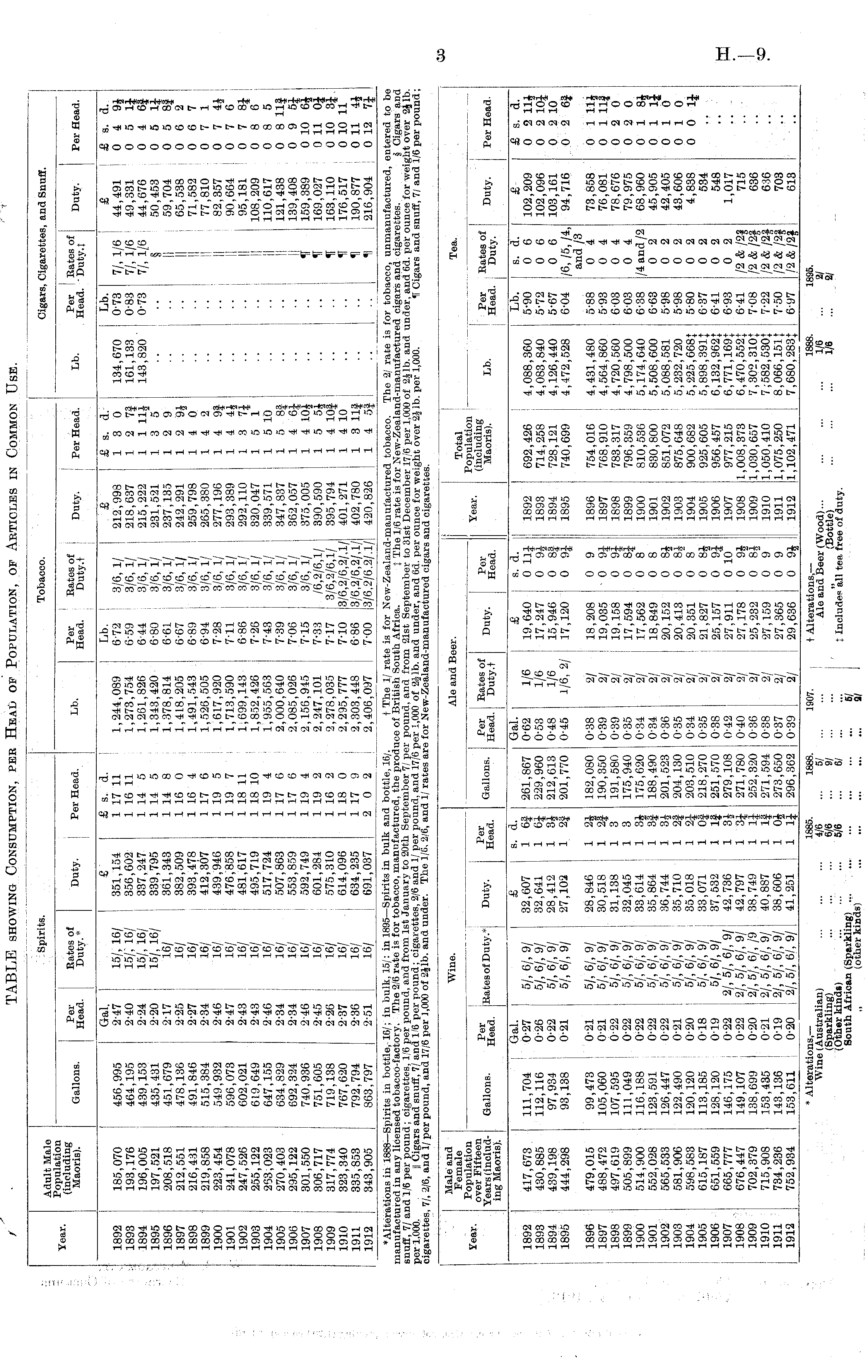 Male and Female Vnnr Population Iear - over Fifteen Years (including Maoris). Gallons. t? 61 ', Bates of Duty.* Wine. Duty. Per Head. Ale and Beer. Bates of Duty.t He^d. Year. Total Population I — (including Maoris). Lb. Per Head. Tea. Kates of Duty. Duty. Gallons. Per Head. Per Head. I 1892 1893 1894 1895 1896 1 1897 1898 1899 1900 1901 ! 1902 : 1903 1904 1905 1906 1907 1908 1909 1910 I 1911 1912 417,673 430,885 439,198 444,298 479,015 488,472 497,619 505, 899 514,900 552,028 565,533 581,906 598,583 615,187 651,559 665,777 676,447 702,379 715,908 734,236 752,934 111,704 ; 112,116 97,934 93,138 99,473 ' 105,060 107,595 111,049 116,188 123,591 126,447 122,490 120,120 113,185 128,120 146,175 149,107 138,699 I 153,435 143,136 153,611 Gal. j £ I 0-27 ! 5/, 6/, 9/ 32,607 0-26 5/, 6/, 9/ j 32,641 0-22 5/, 6/, 9/ 28,412 0-21 5/, 6/, 9/ ' 27,102 0-21 5/, 6/, 9/ 28,846 021 I 5/, 6/, 9/ 30,518 022 i 5/, 6/, 9/ I 31,138 0-22 5/, 6/, 9/ I 32,045 0-22 5/, 6/, 9/ 33,614 0-22 5/, 6/, 9/ 35,864 022 5/, 6/, 9/ 36,744 0-21 ! 5/, 6/, 9/ 35,710 0-20 5/, 6/, 9/ 35,018 0-18 5/, 6/, 9/ i 33,071 0-19 5/, 6/, 9/ ! 37,532 0-22 j 2/, 5/, 6/, 9/i 42,736 0-22 2/, 5/, 6/, 9/ I 42,797 0-20 ! 2/, 5/, 6/, /9 I 38,749 0-21 2/, 5/, 6/, 9/ { 40,887 0-19 2/, 5/, 6/, 9/ 38,606 0-20 i 2/, 5/, 6/, 9/ 41,251 s. d. 1 6| 1 6J 1 3J 1 21 1 2J 1 2| 1 3 1 3 1 3| 1 2| 1 2| 1 0| 1 1} 1 3i 1 1J 1 1| 1 0J 261,867 229,960 212,613 201,770 182,080 190,350 191,580 175,940 175,620 188,490 201,523 204,130 203,510 218,270 251,570 279,108 271,780 252,320 271,594 273,650 296,362 Gal. 0-62 0-53 0-48 0-45 0-38 0-39 0-39 035 0-34 0'34 036 0-35 0-34 0-35 038 0-42 0-40 036 0-38 0-37 0-39 1/6 19,640 1/6 I 17,247 1/6 J 15,946 1/6, 2/ ! 17,120 2/ j 18,208 2/ : 19,035 2/ : 19,158 2/ \ 17,594 2/ i 17,562 2/ i 18,849 2/ ! 20,152 2/ ! 20,413 2/ 20,351 2/ 21,827 2/ ' 25,157 2/ 27,911 2/ 27,178 2/ j 25,232 2/ 27,159 2/ ! 27,365 2/ J 29,636 s. d. 0 llj 0 9J 0 8| 0 9| 0 9 ' 0 9J 0 91 0 8i 0 8 0 8 0 8J 0 8£ 0 8 0 8J 0 9J 0 10 0 9J 0 8J 0 9 0 9 0 9% 1892 1893 1894 1895 1896 1897 1898 1899 1900 1901 1902 1903 1904 1905 1906 1907 1908 1909 1910 1911 1912 692,426 4,088,360 714,258 4,083,840 728,121 J 4,126,440 740,699 ! 4,472,528 754,016 '■ 4,431,480 768,910 4,564,860 783,317 4,720,560 796,359 4,798,500 810,536 : 5,174,640 830,800 : 5,508,600 851,072 : 5,088,581 875,648 5,232,720 900,682 5,225,6681 925,605 : 5,898,391} 956,457 ! 6,132,9621 977,215 J 6,771,1691 1,008,373 I 6,470,552+ 1,030,657 ! 7,302,3101 1,050,410 7,582, 530 J 1,075,250 8,066,151} 1,102,471 7,680,283} Lb. 5-90 5-72 5-67 6-04 5-88 5-93 6 03 6-03 6-38 6-63 5-98 5-98 5-80 637 6-41 6-93 6-41 7-08 7-22 7-50 6-97 s. d. 0 6 0 6 0 6 /6, /5, /4, and /3 0 4 0 4 0 4 0 4 /4 and /2 0 2 0 2 0 2 I 0 2 ! 0 2 0 2 0 2 /2 & m /2 & /2f /2 & /2f /2 & /2f /2 & /2f 102,209 102,096 103,161 94,716 73,858 76,081 78,676 79,975 68,960 45,905 42,405 43,606 4,838 534 548 1,017 715 636 636 703 613 £ s. d. 0 2 11J 0 2 10| 0 2 10 0 2 6} 0 1 llj 0 1 11| 0 2 0 0 2 0 0 1 8J 0 1 1J 0 10 0 10 0 0 1J