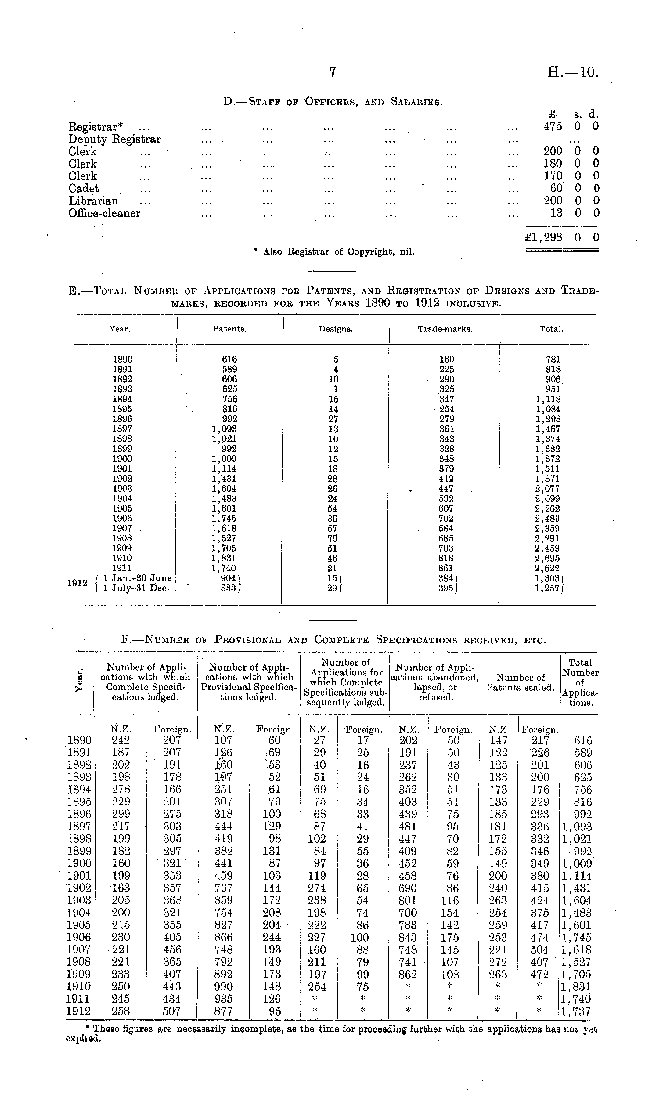 E.—Total Number of Applications for Patents, and Registration of Designs and Trademarks, recorded for the Years 1890 to 1912 inclusive.