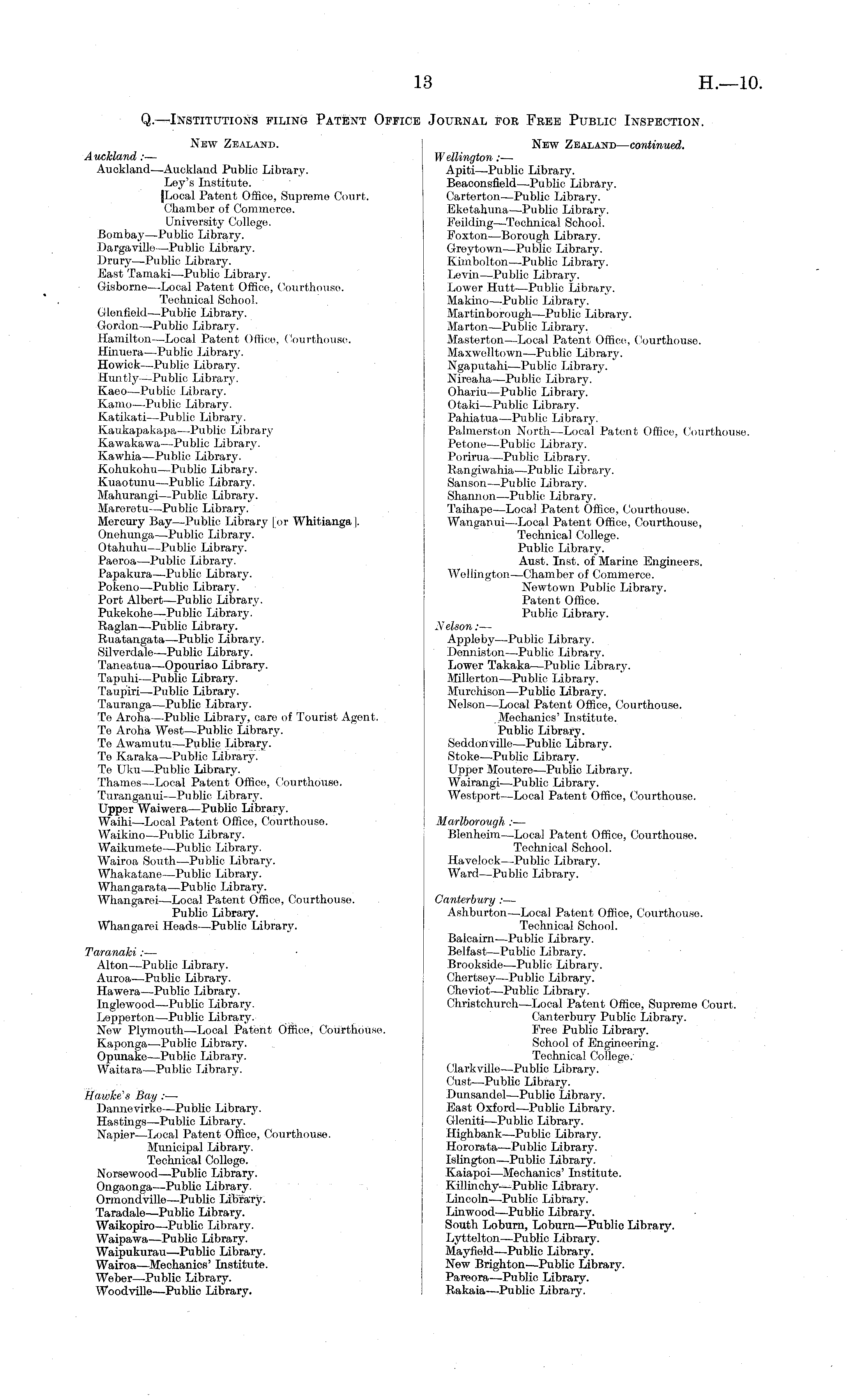 Q. —Institutions filing Patent Office Journal for Free Public Inspection. New Zealand. New Zealand— continued. Auckland : — Wellington : — Auckland—Auckland Public Library. Apiti—Public Library. Ley's Institute. Beaconsfield—Public Library. [Local Patent Office, Supreme Court. Carterton—Public Library. Chamber of Commerce. Eketahuna—Public Library. University College. Feilding—Technical School. Bombay—Public Library. Foxton—Borough Library. Dargaville—Public Library. Greytown—Public Library. Drury—Public Library. Kimbolton—Public Library. East Tamaki—Public Library. Levin—Public Library. Gisborne—Local Patent Office, Courthouse. Lower Hutt—Public Library. Technical School. Makino—Public Library. Glenfield—Public Library. Martinborough—Public Library. Gordon—Public Library. Marton—Public Library. Hamilton—Local Patent Office, Courthouse. Mastcrton—Local Patent Office;, Courthouse. Hinuora—Public Library. Maxwelltown—Public Library. Howick—Public Library. Ngaputahi—Public Library. Huntly—Public Library. Nireaha—Public Library. Kaeo—Public Library. Ohariu—Public Library. Kamo—Public Library. Otaki—Public Library. Katikati—Public Library. Pahiatua—Public Library. Kaukapakapa—Public Library Pahnerston North—Local Patent Office, Courthouse. Kawakawa—Public Library. Petone—Public Library. Kawhia—Public Library. Porirua—Public Library. Eohukohu—Public Library. Rangiwahia—Public Library. Kuaotunu—Public Library. Sanson—Public Library. Mahurangi—Public Library. Shannon—Public Library. Mareretu—Public Library. Taihape—Local Patent Office, Courthouse. Mercury Bay—Public Library [or Whitianga |. Wanganui—Local Patent Office, Courthouse, Onehunga—Public Library. Technical College. Otahuhu—Public Library. Public Library. Paeroa—Public Library. Aust. Inst, of Marine Engineers. Papakura—Public Library. Wellington—Chamber of Commerce. Pokeno—Public Library. Newtown Public Library. Port Albert—Public Library. Patent Office. Pukekohe—Public Library. Public Library. Raglan—Public Library. Nelson: — Ruatangata—Public Library. Appleby—Public Library. Silverdale—Public Library. Denniston—Public Library. Tancatua—Opouriao Library. Lower Takaka—Public Library. Tapuhi—Public Library. Millerton—Public Library. Taupiri—Public Library. Murchison—Public Library. Tauranga—Public Library. Nelson—Local Patent Office, Courthouse. Te Aroha—Public Library, care of Tourist Agent. Mechanics' Institute. Te Aroha West—Public Library. Public Library. Te Awamutu—Public Library. SeddoHville—Public Library. Te Karaka—Public Library. Stoke—Public Library. Te Uku—Public Library. Upper Moutere—Public Library. Thames—Local Patent Office, Courthouse. Wairangi—Public Library. Turanganui—Public Librarjr. Westport.—Local Patent Office, Courthouse. Upper Waiwera—Public Library. Waihi—Local Patent Office, Courthouse. Marlborough : — Waikino—Public Library. Blenheim—Local Patent Office, Courthouse. Waikumete—Public Library. Technical School. Wairoa South—Public Library. Havelock—Public Library. Whakatane—Public Library. Ward—Public Library. Whangarata—Public Library. Whangarei—Local Patent Office, Courthouse. Canterbury : — Public Library. Ashburton—Local Patent Office, Courthouse. Whangarei Heads—Public Library. Technical School. Balcairn—Public Library. Taranaki: — • Belfast—Public Library. Alton—Public Library. Brookside—Public Library. Auroa—Public Library. Chertsey—Public Library. Hawera—Public Library. Cheviot—Public Library. Inglewood—Public Library. Christchurch—Local Patent Office, Supreme Court. Lepperton—Public Library. Canterbury Public Library. New Plymouth—Local Patent Office, Courthouse. Free Public Library. Kaponga—Public Library. School of Engineering. Opunake—Public Library. Technical College. Waitara—Public Library. Clarkville—Public Library. Cust—Public Library. Hawke's Bay : — Dunsandel—Public Library. Dannovirke—Public Library. East Oxford—Public Library. Hastings—Public Library. Gleniti—Public Library. Napier—Local Patent Office, Courthouse. Highbank—Public Library. Municipal Library. Hororata—Public Library. Technical College. Islington—Public Library. Norsewood—Public Library. Kaiapoi—Mechanics' Institute. Ongaonga—Public Library. Killinchy—Public Library. Ormondville—Public Library. Lincoln'—Public Library. Taradale—Public Library. Linwood—Public Library. Waikopiro—-Public Library. South Loburn, Loburn—Public Library. Waipawa—Public Library. Lyttolton—Public Library. Waipukurau—Public Library. Mayfield—Public Library. Wairoa—Mechanics' Institute. New Brighton—Public Library. Weber—Public Library. Pareora—Public Library. Woodville—Public Library. Rakaia—Public Library.