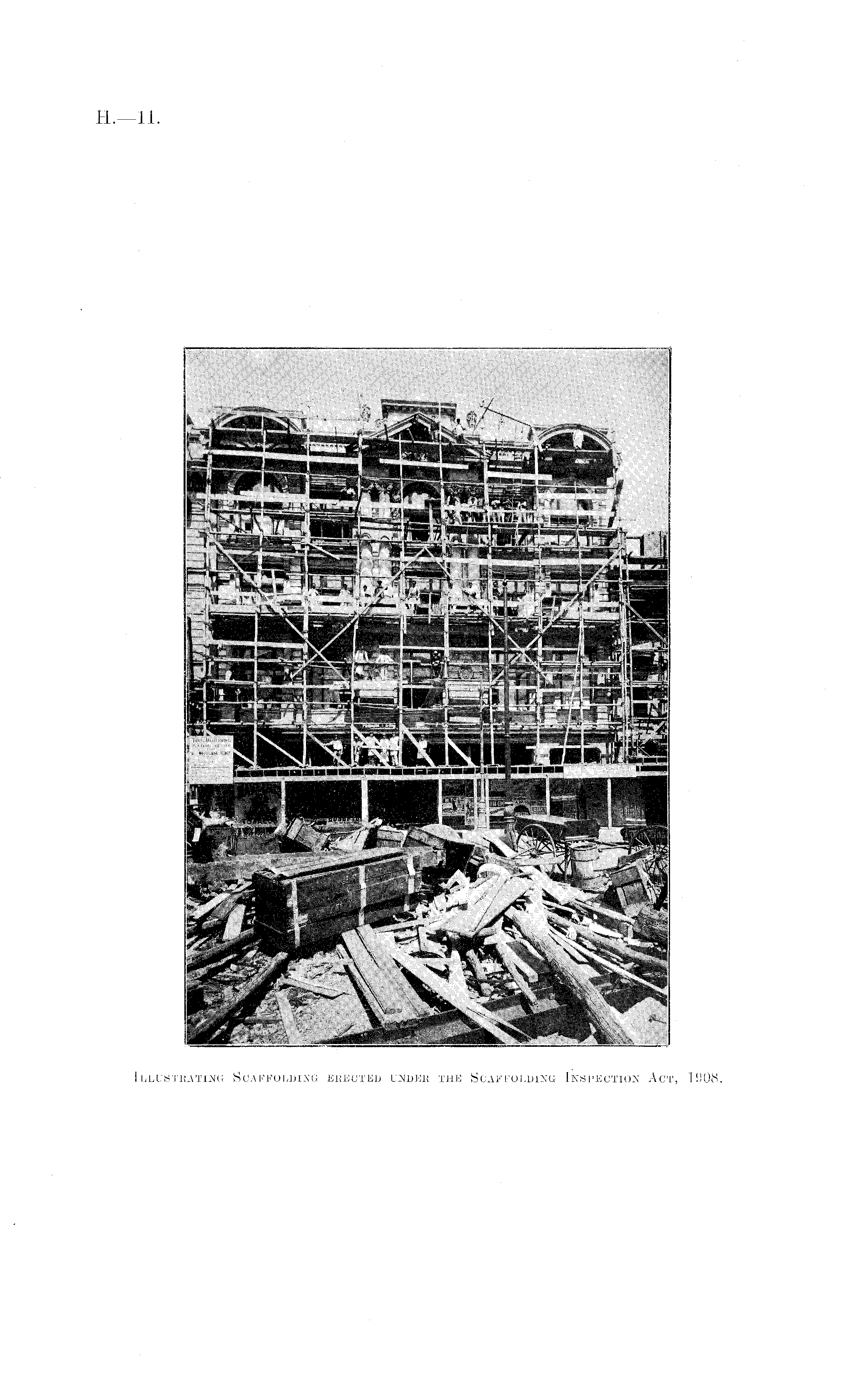 Illustrating Scaffolding errcted under the Scaffolding Inspection Act, 1908.