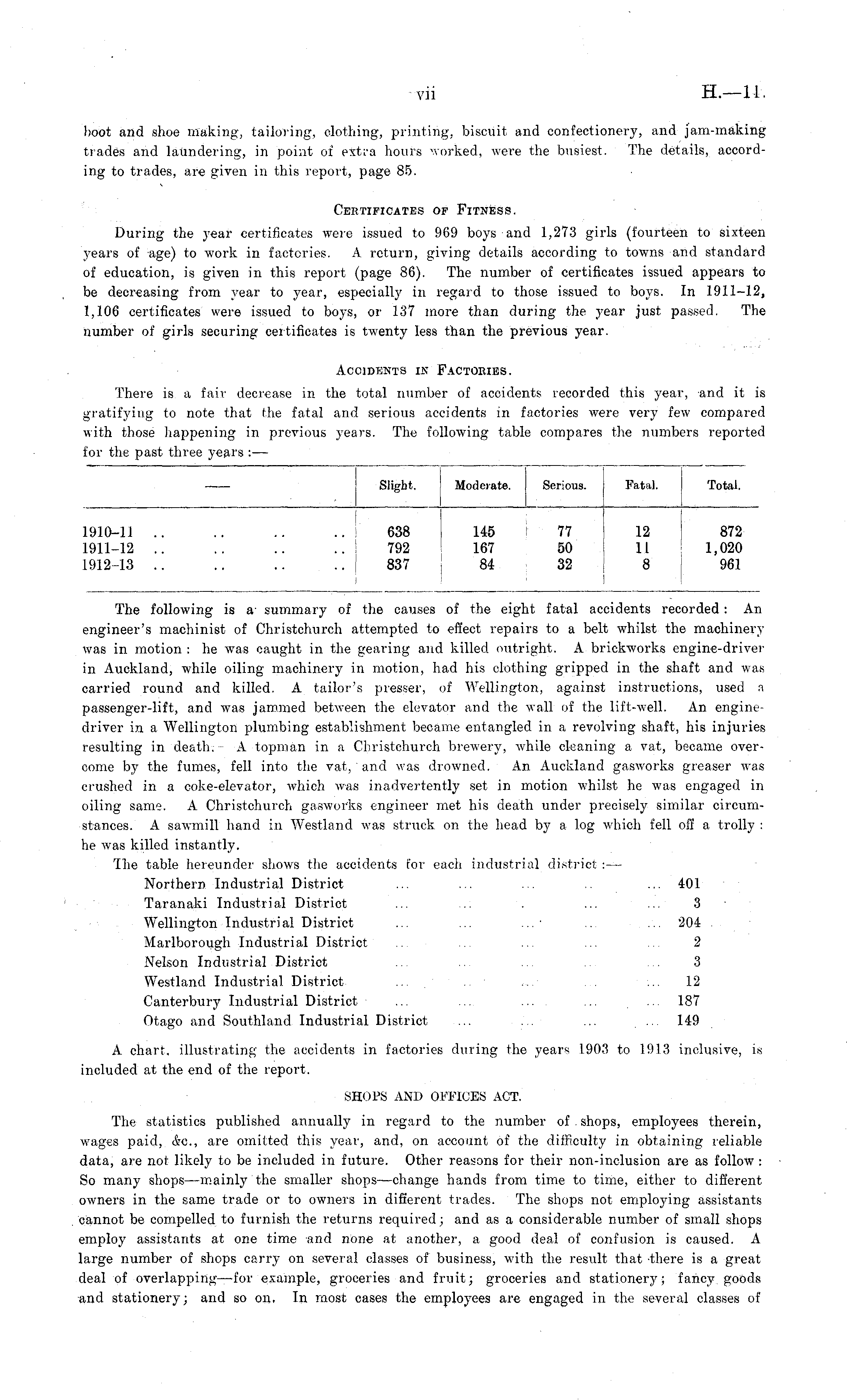 boot and shoe making, tailoring, clothing, printing, biscuit, and confectionery, and jam-making trades and laundering, in point of extra hours worked, were the busiest. The details, according to trades, are given in this report, page 85. Certificates of Fitness. During the year certificates were issued to 969 boys and 1,273 girls (fourteen to sixteen years of age) to work in factories. A return, giving details according to towns and standard of education, is given in this report (page 86). The number of certificates issued appears to be decreasing from year to year, especially in regard to those issued to boys. In 1911-12, 1,106 certificates were issued to boys, or 137 more than during the year just passed. The number of girls securing certificates is twenty less than the previous year. Accidents in Factories. There is a fair decrease in the total number of accidents recorded this year, and it is gratifying to note that the fatal and serious accidents in factories were very few compared with those happening in previous years. The following table compares the numbers reported for the past three years : —