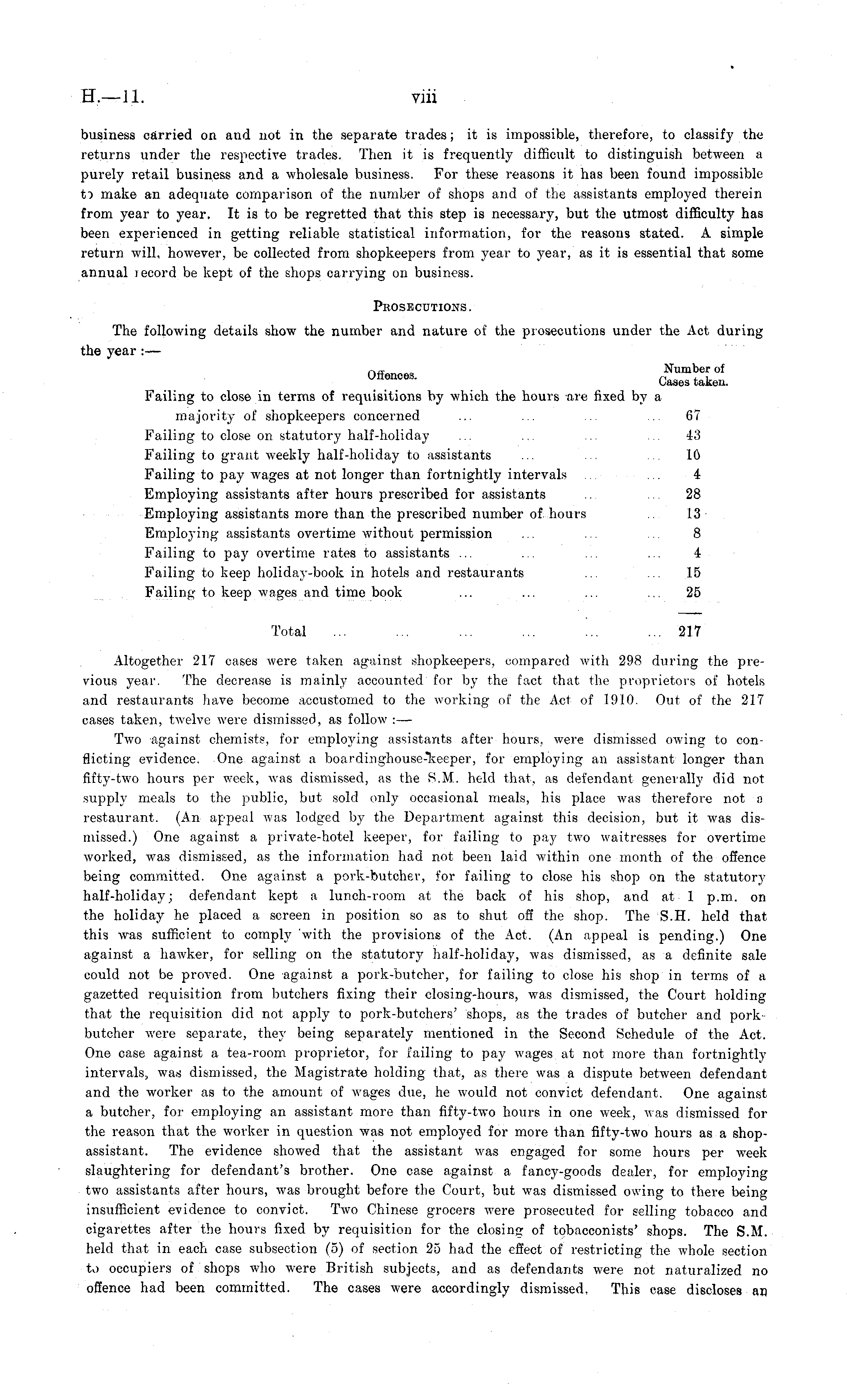 business carried on and not in the separate trades; it is impossible, therefore, to classify the returns under the respective trades. Then it is frequently difficult to distinguish between a purely retail business and a wholesale business. For these reasons it has been found impossible to make an adequate comparison of the number of shops and of the assistants employed therein from year to year. It is to be regretted that this step is necessary, but the utmost difficulty has been experienced in getting reliable statistical information, for the reasons stated. A simple return will, however, be collected from shopkeepers from year to year, as it is essential that some annual iecord be kept of the shops carrying on business. Prosecutions. The following details show the number and nature of the prosecutions under the Act during the year : — n «„ „ Number of offences - Cases taken. Failing to close in terms of requisitions by which the hours are fixed by a majority of shopkeepers concerned ... ... ... ... 67 Failing to close on statutory half-holiday ... ... ... ... 43 Failing to grant weekly half-holiday to assistants ... ... ... 10 Failing to pay wages at not longer than fortnightly intervals 4 Employing assistants after hours prescribed for assistants ... ... 28 Employing assistants more than the prescribed number of. hours ... 13 Employing assistants overtime wdthout permission ... ... ... 8 Failing to pay overtime rates to assistants ... ... ... ... 4 Failing to keep holiday-book in hotels and restaurants ... ... 15 Failing to keep wages and time book ... ... ... ... 25 Total ... ... ... ... ... ... 217 Altogether 217 cases were taken against shopkeepers, compared with 298 during the previous j'ear. The decrease is mainly accounted for by the fact that the proprietors of hotels and restaurants have become accustomed to the working of the Act of 1910. Out of the 217 cases taken, twelve were dismissed, as follow :— Two against chemists, for employing assistants after hours, were dismissed owing to conflicting evidence. One against a boardinghouse-"keeper, for employing an assistant longer than fifty-two hours per week, was dismissed, as the S.M. held that, as defendant generally did not supply meals to the public, but sold only occasional meals, his place was therefore not a restaurant. (An appeal was lodged by the Department against this decision, but it was dismissed.) One against a private-hotel keeper, for failing to pay two waitresses for overtime worked, was dismissed, as the information had not been laid within one month of the offence being committed. One against a pork-butcher, for failing to close his shop on the statutory half-holiday; defendant kept a lunch-room at the back of his shop, and at 1 p.m. on the holiday he placed a screen in position so as to shut off the shop. The S.H. held that this was sufficient to comply with the provisions of the Act. (An appeal is pending.) One against a hawker, for selling on the statutory half-holiday, was dismissed, as a definite sale could not be proved. One against a pork-butcher, for failing to close his shop in terms of a gazetted requisition from butchers fixing their closing-hours, was dismissed, the Court holding that the requisition did not apply to pork-butchers' shops, as the trades of butcher and porkbutcher were separate, they being separately mentioned in the Second Schedule of the Act. One case against a tea-room proprietor, for failing to pay wages at not more than fortnightly intervals, was dismissed, the Magistrate holding that, as there was a dispute between defendant and the worker as to the amount of wages due, he would not convict defendant. One against a butcher, for employing an assistant more than fifty-two hours in one week, was dismissed for the reason that the worker in question was not employed for more than fifty-two hours as a shopassistant. The evidence showed that the assistant was engaged for some hours per week slaughtering for defendant's brother. One case against a fancy-goods dealer, for employing two assistants after hours, was brought before the Court, but was dismissed owing to there being insufficient evidence to convict. Two Chinese grocers were prosecuted for selling tobacco and cigarettes after the hours fixed by requisition for the closing of tobacconists' shops. The S.M. held that in each case subsection (5) of section 25 had the effect of restricting the whole section to occupiers of shops who were British subjects, and as defendants were not naturalized no offence had been committed. The cases were accordingly dismissed. This case discloses an