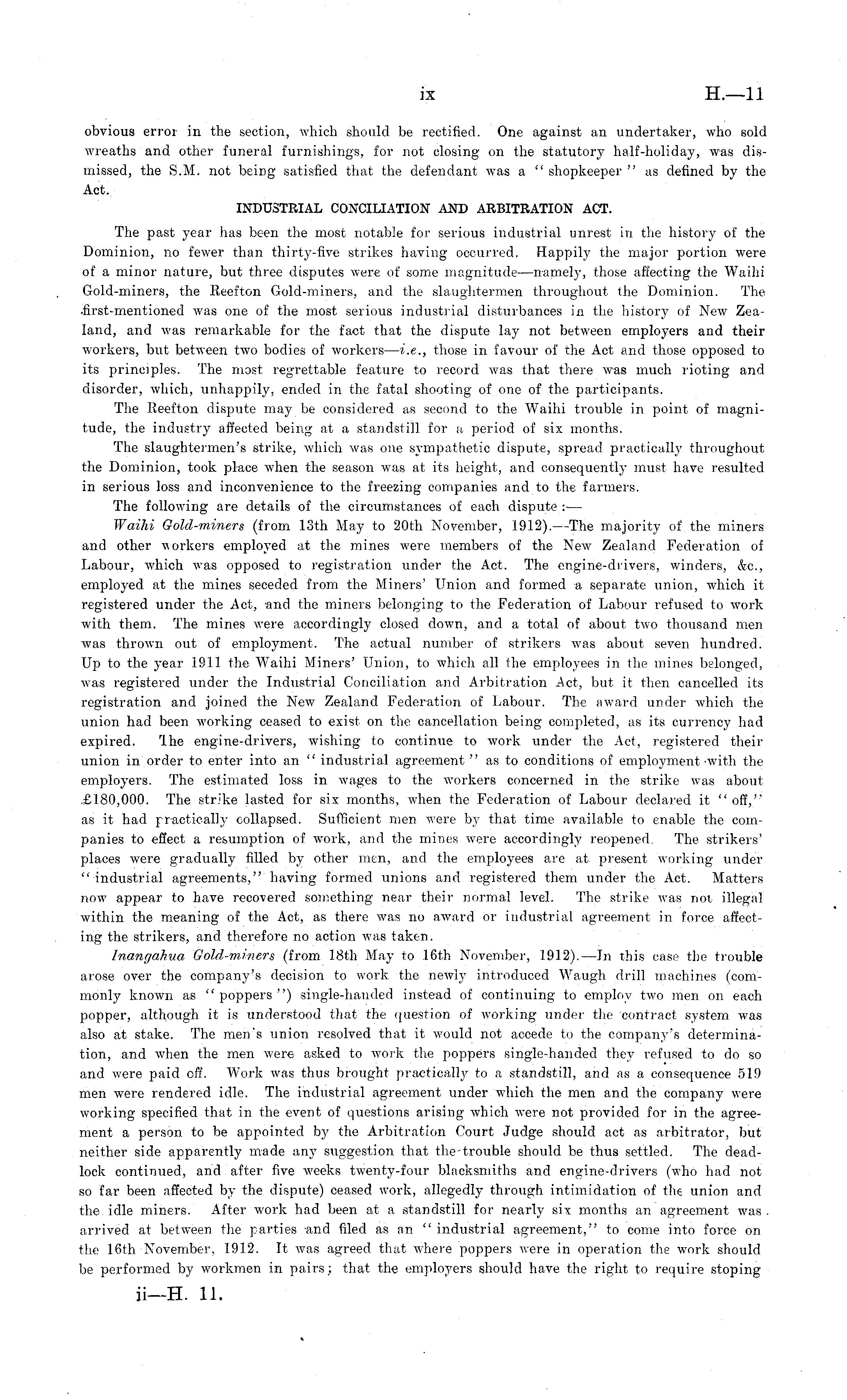 obvious error in the section, which should be rectified. One against an undertaker, who sold wreaths and other funeral furnishings, for not closing on the statutory half-holiday, was dismissed, the S.M. not being satisfied that the defendant was a " shopkeeper " as defined by the Act. INDUSTRIAL CONCILIATION AND ARBITRATION ACT. The past year has been the most notable for serious industrial unrest in the history of the Dominion, no fewer than thirty-five strikes having occurred. Happily the major portion were of a minor nature, but three disputes were of some magnitude—namely, those affecting the Waihi Gold-miners, the Reefton Gold-miners, and the slaughtermen throughout the Dominion. The •first-mentioned was one of the most serious industrial disturbances in the history of New Zealand, and was remarkable for the fact that the dispute lay not between employers and their workers, but between two bodies of workers — i.e., those in favour of the Act and those opposed to its principles. The most regrettable feature to record was that there was much rioting and disorder, which, unhappily, ended in the fatal shooting of one of the participants. The Reefton dispute may be considered as second to the Waihi trouble in point of magnitude, the industry affected being at a standstill for a period of six months. The slaughtermen's strike, which was one sympathetic dispute, spread practically throughout the Dominion, took place when the season was at its height, and consequently must have resulted in serious loss and inconvenience to the freezing companies and to the farmers. The following are details of the circumstances of each dispute : — Waihi Gold-miners (from 13th May to 20th November, 1912). —The majority of the miners and other workers employed at the mines were members of the New Zealand Federation of Labour, which was opposed to registration under the Act. The engine-drivers, winders, &c, employed at the mines seceded from the Miners' Union and formed a separate union, which it registered under the Act, and the miners belonging to the Federation of Labour refused to work with them. The mines were accordingly closed down, and a total of about two thousand men was thrown out of employment. The actual number of strikers was about seven hundred. Up to the year 1911 the Waihi Miners' Union, to which all the employees in the mines belonged, was registered under the Industrial Conciliation and Arbitration Act, but it then cancelled its registration and joined the New Zealand Federation of Labour. The award under which the union had been working ceased to exist, on the cancellation being completed, as its currency had expired. Ihe engine-drivers, wishing to continue to work under the Act, registered their union in order to enter into an " industrial agreement " as to conditions of employment with the employers. The estimated loss in wages to the workers concerned in the strike was about £180,000. The strike lasted for six months, when the Federation of Labour declared it "off,'' as it had practically collapsed. Sufficient men were by that time available to enable the companies to effect a resumption of work, and the mines were accordingly reopened. The strikers' places were gradually filled by other men, and the employees are at present working under " industrial agreements," having formed unions and registered them under the Act. Matters now appear to have recovered something near their normal level. The strike was not illegal within the meaning of the Act, as there was no award or industrial agreement in force affecting the strikers, and therefore no action was taken. Inangahua Gold-miners (from 18th May to 16th November, 1912). —In. this case the trouble arose over the company's decision to work the newly introduced Waugh drill machines (commonly known as "poppers") single-handed instead of continuing to employ two men on each popper, although it is understood that the question of working under the contract system was also at stake. The men's union resolved that it would not accede to the company's determination, and when the men were asked to work the poppers single-handed they refused to do so and were paid off. Work was thus brought practically to a standstill, and as a consequence 519 men were rendered idle. The industrial agreement under which the men and the company were working specified that in the event of questions arising which were not provided for in the agreement a person to be appointed by the Arbitration Court Judge should act as arbitrator, but neither side apparently made any suggestion that the trouble should be thus settled. The deadlock continued, and after five weeks twenty-four blacksmiths and engine-drivers (who had not so far been affected by the dispute) ceased work, allegedly through intimidation of the union and the idle miners. After work had been at a standstill for nearly six months an agreement was . arrived at between the parties and filed as an " industrial agreement," to come into force on the 16th November, 1912. It was agreed that where poppers were in operation the work should be performed by workmen in pairs; that the employers should have the right to require stoping