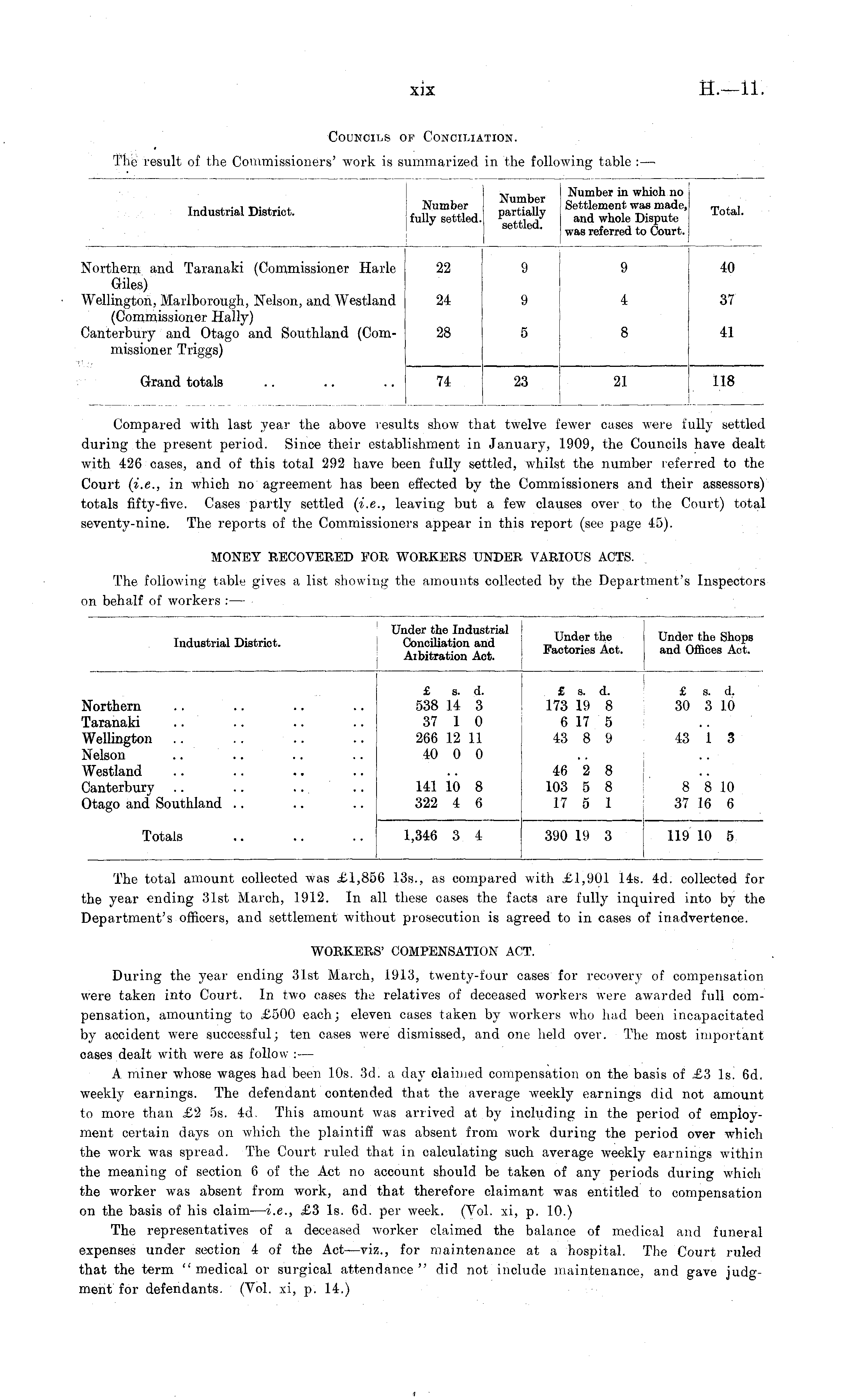 The total amount collected was £1,856 135., as compared with £1,901 14s. 4d. collected for the year ending 31st March, 1912. In all these cases the facts are fully inquired into by the Department's officers, and settlement without prosecution is agreed to in cases of inadvertence. WORKERS' COMPENSATION ACT. During the year ending 31st March, 1913, twenty-four cases for recovery of compensation were taken into Court. In two cases the relatives of deceased workers were awarded full compensation, amounting to £500 each; eleven cases taken by workers who had been incapacitated by accident were successful; ten cases were dismissed, and one held over. The most important cases dealt with were as follow :— A miner whose wages had been 10s. 3d. a day claimed compensation on the basis of £3 Is. 6d. weekly earnings. The defendant contended that the average weekly earnings did not amount to more than £2 ss. 4d. This amount was arrived at by including in the period of employment certain days on which the plaintiff was absent from work during the period over which the work was spread. The Court ruled that in calculating such average weekly earnings within the meaning of section 6 of the Act no account should be taken of any periods during which the worker was absent from work, and that therefore claimant was entitled to compensation on the basis of his claim— i.e., £3 Is. 6d. per week. (Vol. xi, p. 1.0.) The representatives of a deceased worker claimed the balance of medical and funeral expenses under section 4 of the Act—viz., for maintenance at a hospital. The Court ruled that the term "medical or surgical attendance" did not include maintenance, and gave judgment for defendants. (Vol. xi, p. 14.)