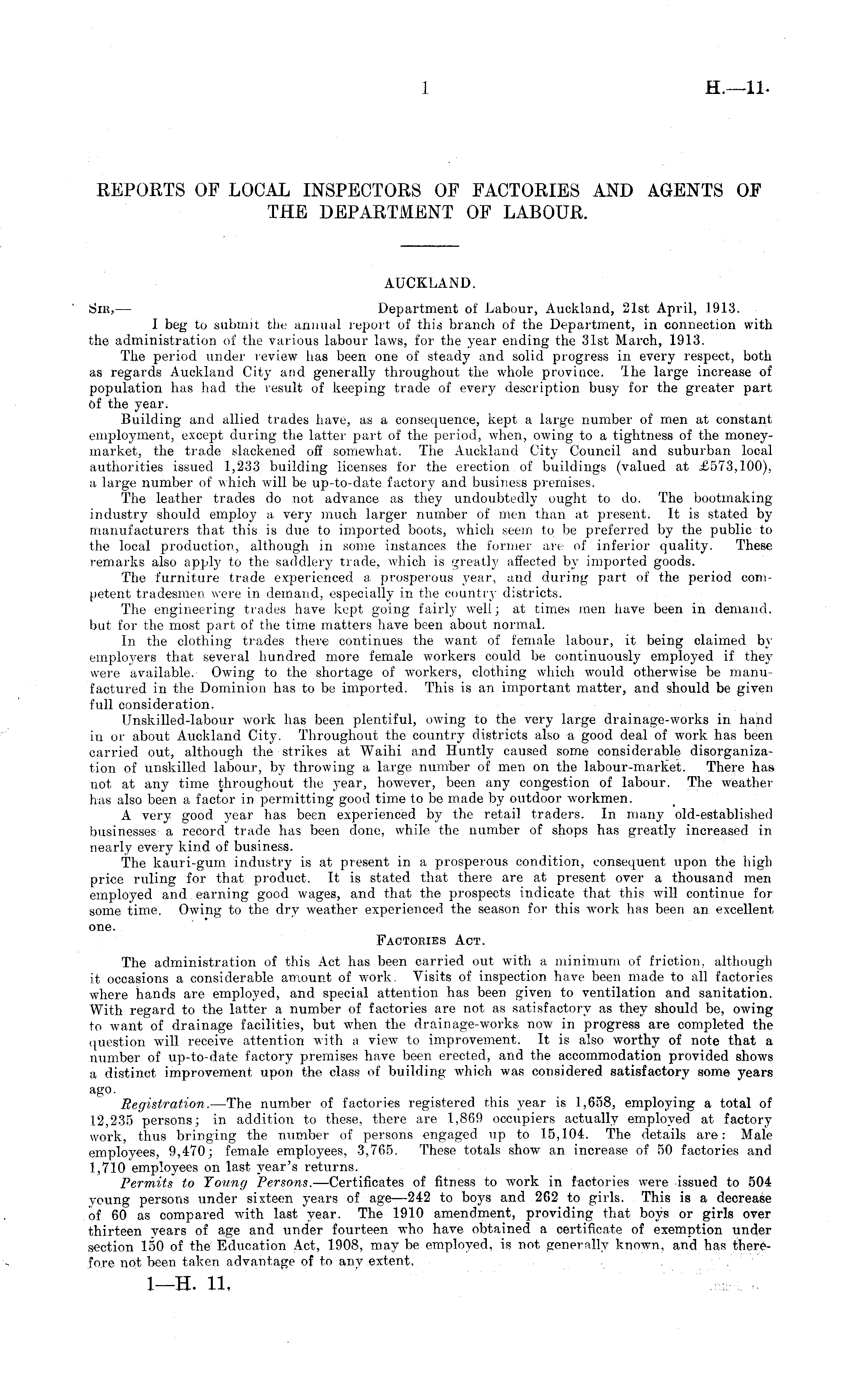 REPORTS OF LOCAL INSPECTORS OF FACTORIES AND AGENTS OF THE DEPARTMENT OF LABOUR. AUCKLAND. Sir, — Department of Labour, Auckland, 21st April, 1913. I beg to submit the annual report of this branch of the Department, in connection with the administration of the various labour laws, for the year ending the 31st March, 1913. The period under review has been one of steady and solid progress in every respect, both as regards Auckland City and generally throughout the whole province. The large increase of population has had the result of keeping trade of every description busy for the greater part Of the year. Building and allied trades have, as a consequence, kept a large number of men at constant employment, except during the latter part of the period, when, owing to a tightness of the moneymarket, the trade slackened off somewhat. The Auckland City Council and suburban local authorities issued 1,233 building licenses for the erection of buildings (valued at £573,100), a large number of which will be up-to-date factory and business premises. The leather trades do not advance as they undoubtedly ought to do. The bootmaking industry should employ a very much larger number of men than at present. It is stated by manufacturers that this is due to imported boots, which seem to be preferred by the public to the local production, although in some instances the former are of inferior quality. These remarks also apply to the saddlery trade, which is greatly affected by imported goods. The furniture trade experienced a prosperous year, and during part of the period competent tradesmen were in demand, especially in the country districts. The engineering trades have kept going fairly well; at times men have been in demand. but. for the most part of the time matters have been about normal. In the clothing trades there continues the want of female labour, it being claimed by employers that several hundred more female workers could be continuously employed if they were available. Owing to the shortage of workers, clothing which would otherwise be manufactured in the Dominion has to be imported. This is an important matter, and should be given full consideration. Unskilled-labour work has been plentiful, owing to the very large drainage-works in hand in or about Auckland City. Throughout the country districts also a good deal of work has been carried out, although the strikes at Waihi and Huntly caused some considerable disorganization of unskilled labour, by throwing a large number of men on the labour-market. There has not at any time throughout the year, however, been any congestion of labour. The weather has also been a factor in permitting good time to be made by outdoor workmen. A very good year has been experienced by the retail traders. In many old-established businesses a record trade has been done, while the number of shops has greatly increased in nearly every kind of business. The kauri-gum industry is at present in a prosperous condition, consequent upon the high price ruling for that product. It is stated that there are at present over a thousand men employed and earning good wages, and that the prospects indicate that this will continue for some time. Owing to the dry weather experienced the season for this work has been an excellent one. Factories Act. The administration of this Act has been carried out with a minimum of friction, although it occasions a considerable amount of work. Visits of inspection have been made to all factories where hands are employed, and special attention has been given to ventilation and sanitation. With regard to the latter a number of factories are not as satisfactory as they should be, owing to want of drainage facilities, but when the drainage-works now in progress are completed the question will receive attention with a view to improvement. It is also worthy of note that a number of up-to-date factory premises have been erected, and the accommodation provided shows a distinct improvement upon the class of building which was considered satisfactory some years ago. Registration. —The number of factories registered this year is 1,658, employing a total of 12,235 persons; in addition to these, there are 1,869 occupiers actually employed at factory work, thus bringing the number of persons engaged up to 1.5,104. The details are: Male employees, 9,470; female employees, 3,765. These totals show an increase of 50 factories and 1,710 employees on last year's returns. Permits to Young Persons.— Certificates of fitness to work in factories were issued to 504 young persons under sixteen years of age—242 to boys and 262 to girls. This is a decrease of 60 as compared with last year. The 1910 amendment, providing that boys or girls over thirteen years of age and under fourteen who have obtained a certificate of exemption under section 150 of the Education Act, 1908, may be employed. is not generally known, and has therefore not been taken advantage of to any extent.