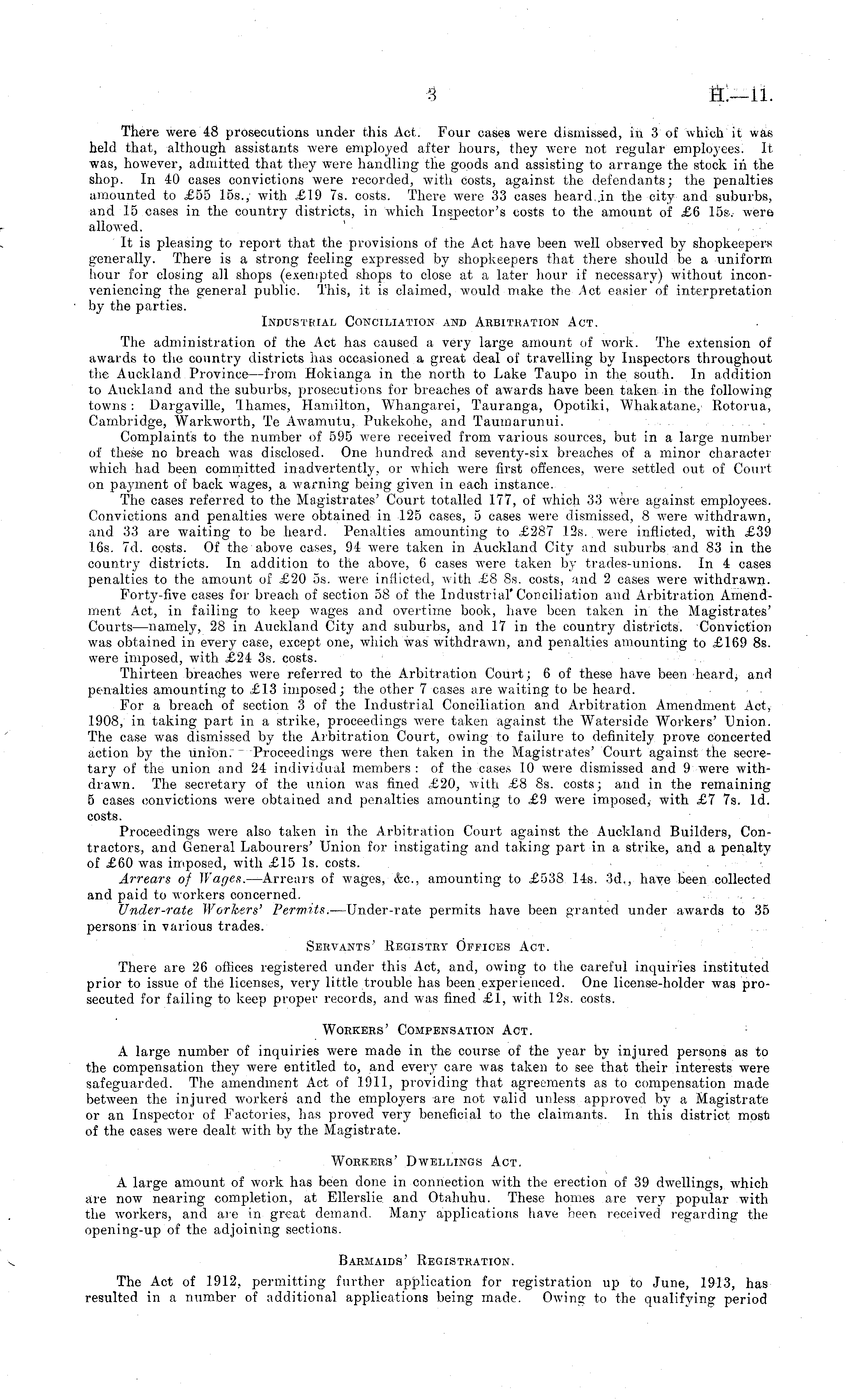 There were 48 prosecutions under this Act. Four cases were dismissed, in 3of which it was held that, although assistants were employed after hours, they were not regular employees. It was, however, admitted that they were handling the goods and assisting to arrange the stock in the shop. In 40 cases convictions were recorded, with costs, against the defendants; the penalties amounted to £55 155., with £19 7s. costs. There were 33 cases heard..in the city and suburbs, and 15 cases in the country districts, in which Inspector's costs to the amount of £6 15s. were allowed. It is pleasing to report that the provisions of the Act have been well observed by shopkeepers generally. There is a strong feeling expressed by shopkeepers that there should be a uniform hour for closing all shops (exempted shops to close at a later hour if necessary) without inconveniencing the general public. This, it is claimed, would make the Act easier of interpretation by the parties. Industrial Conciliation and Arbitration Act. The administration of the Act has caused a very large amount of work. The extension of awards to the country districts has occasioned a great deal of travelling by Inspectors throughout the Auckland Province—from Hokianga in the north to Lake Taupo in the south. In addition to Auckland and the suburbs, prosecutions for breaches of awards have been taken in the following towns : Dargaville, Thames, Hamilton, Whangarei, Tauranga, Opotiki, Whakatane, Rotorua, Cambridge, Warkworth, Te Awamutu, Pukekohe, and Taumarunui. Complaints to the number of 595 were received from various sources, but in a large number of these no breach was disclosed. One hundred and seventy-six breaches of a minor character which had been committed inadvertently, or which were first offences, were settled out of Court on paj'ment of back wages, a warning being given in each instance. The cases referred to the Magistrates' Court totalled 177, of which 33 were against employees. Convictions and penalties were obtained in 125 cases, 5 cases were dismissed, 8 were withdrawn, and 33 are waiting to be heard. Penalties amounting to £287 12s. were inflicted, with £39 16s. 7d. costs. Of the above cases, 94 were taken in Auckland City and suburbs and 83 in the country districts. In addition to the above, 6 cases were taken by trades-unions. In 4 cases penalties to the amount of £20 ss. were inflicted, with £8 Bs. costs, and 2 cases were withdrawn. Forty-five cases for breach of section 58 of the Industrial' Conciliation and Arbitration Amendment Act, in failing to keep wages and overtime book, have been taken in the Magistrates' Courts —namely, 28 in Auckland City and suburbs, and 17 in the country districts. Conviction was obtained in every case, except one, which was withdrawn, and penalties amounting to £169 Bs. were imposed, with £24 3s. costs. Thirteen breaches were referred to the Arbitration Court; 6of these have been heard; and penalties amounting to £13 imposed; the other 7 cases are waiting to be heard. For a breach of section 3 of the Industrial Conciliation and Arbitration Amendment Act, 1908, in taking part in a strike, proceedings were taken against the Waterside Workers' Union. The case was dismissed by the Arbitration Court, owing to failure to definitely prove concerted action by the Union. Proceedings were then taken in the Magistrates' Court against the secretary of the union and 24 individual members : of the cases 10 were dismissed and 9 were withdrawn. The secretary of the union was fined £20, with £8 Bs. costs; and in the remaining 5 cases convictions were obtained and penalties amounting to £9 were imposed, with £7 7s. Id. costs. Proceedings were also taken in the Arbitration Court against the Auckland Builders, Contractors, and General Labourers' Union for instigating and taking part in a strike, and a penalty of £60 was imposed, with £15 Is. costs. Arrears of Wages. —Arrears of wages, &c, amounting to £538 14s. 3d., have been collected and paid to workers concerned. Under-rate Workers' Permits. —Under-rate permits have been granted under awards to 35 persons in various trades. Servants' Registry Offices Act. There are 26 offices registered under this Act, and, owing to the careful inquiries instituted prior to issue of the licenses, very little trouble has been experienced. One license-holder was prosecuted for failing to keep proper records, and was fined £1, with 12s. costs. Workers' Compensation Act. A large number of inquiries were made in the course of the year by injured persons as to the compensation they were entitled to, and every care was taken to see that their interests were safeguarded. The amendment Act of 1911, providing that agreements as to compensation made between the injured workers and the employers are not valid unless approved by a Magistrate or an Inspector of Factories, has proved very beneficial to the claimants. In this district most of the cases were dealt with by the Magistrate. Workers' Dwellings Act. A large amount of work has been done in connection with the erection of 39 dwellings, which are now nearing completion, at Ellerslie. and Otahuhu. These homes are very popular with the workers, and are in great demand. Many applications have boon received regarding the opening-up of the adjoining sections. Barmaids' Registration. The Act of 1912, permitting further application for registration up to June, 1913, has resulted in a number of additional applications being made. Owing to the qualifying period