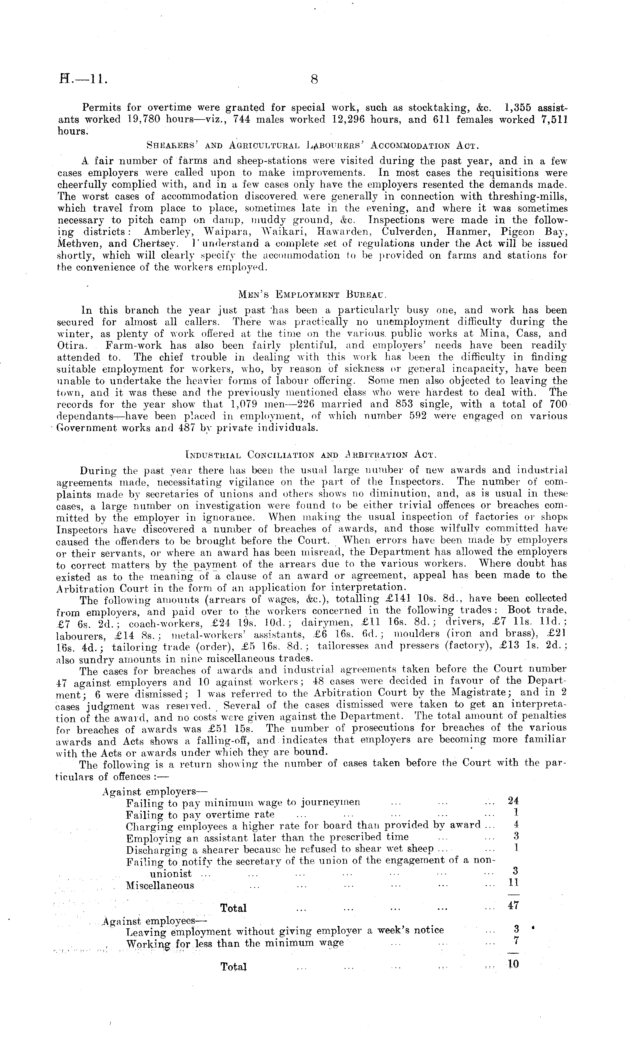 Permits for overtime were granted for special work, such as stocktaking, &c. 1,355 assistants worked 19,780 hours —viz., 744 males worked 12,296 hours, and 611 females worked 7,511 hours. Shearers' and Agricultural Labourers' Accommodation Act. A fair number of farms and sheep-stations were visited during the past year, and in a few cases employers were called upon to make improvements. In most cases the requisitions were cheerfully complied with, and in a few cases only have the employers resented the demands made. The worst cases of accommodation discovered, were generally in connection with threshing-mills, which travel from place to place, sometimes late in the evening, and where it was sometimes necessary to pitch camp on damp, muddy ground, &c. Inspections were made in the following districts: Amberley, Waipara, Waikari, Hawarden, Culverden, Hanmer, Pigeon Bay, Methven, and Chertsey. I'understand a complete set of regulations under the Act will be issued shortly, which will clearly specify the accommodation to be provided on farms and stations for the convenience of the workers employed, Men's Employment Bureau. In this branch the year just past 'has been a particularly busy one, and work has been secured for almost all callers. There was practically no unemployment difficulty during the winter, as plenty of work offered at the time on the various, public works at Mina, Cass, and Otira. Farm-work has also been fairly plentiful, and employers' needs have been readily attended to. The chief trouble in dealing with this work has been the difficulty in finding suitable employment for workers, who, by reason of sickness or general incapacity, have been unable to undertake the heavier forms of labour offering. Some men also objected to leaving the town, and it was these and the previously mentioned class who were hardest to deal with. The records for the year show that 1,079 men —226 married and 853 single, with a total of 700 dependants—have been placed in employment, of which number 592 were engaged on various Government works and 487 by private individuals. Industrial Conciliation and Arbitration Act. During the past year there has been the usual large number of new awards and industrial agreements made, necessitating vigilance on the part of the Inspectors. The number of complaints made by secretaries of unions and others shows no diminution, and, as is usual in these cases, a large number on investigation were found to be either trivial offences or breaches committed by the employer in ignorance. When making the usual inspection of factories or shops Inspectors have discovered a number of breaches of awards, and those wilfully committed have caused the offenders to be brought before the Court. When errors have been, made by employers or their servants, or where an award has been misread, the Department has allowed the employers to correct matters by the payment of the arrears due to the various workers. Where doubt has existed as to the meaning of a clause of an award or agreement, appeal has been made to the Arbitration Court in the form of an application for interpretation. The following amounts (arrears of wages, (fee.), totalling £141 10s. Bd., have been collected from employers, and paid over to the workers concerned in the following trades : Boot trade, £7 6s. 2d.'; coach-workers, £24 19s. lOd. ; dairymen, £11 16s. Bd.; drivers, £7 lis. lid.; labourers, £14 Bs.; metal-workers' assistants, £6 16s. 6d.; moulders (iron and brass), £21 1.65. 4d.; tailoring trade (order), £5 16s. Bd. ; tailoresses and pressors (factory), £13 is. 2d.; also sundry amounts in nine miscellaneous trades. The cases for breaches of awards and industrial agreements taken before the Court number 47 against employers and 10 against workers; 48 cases were decided in favour of the Department; 6 were dismissed; 1 was referred to the Arbitration Court by the Magistrate; and in 2 cases judgment was reserved. Several of the cases dismissed were taken to get an interpretation of the award, and no costs were given against the Department. The total amount of penalties for breaches of awards was £51 15s. The number of prosecutions for breaches of the various awards and Acts shows a falliug-off, and indicates that employers are becoming more familiar with the Acts or awards under which they are bound. The following is a return showing the number of cases taken before the Court with the particulars of offences: — Against employers — Failing to pay minimum wage to journeymen ... ... ... 24 Failing to pay overtime rate ... ... ■■• ••• ■•■ 1 Charging employees a higher rate for board than provided by award ... 4 Employing an assistant later than the prescribed time ... ... 3 Discharging a shearer because he refused to shear wet sheep ... ... 1 Failing to notify the secretary of the union of the engagement of a nonunionist ... ... ■•• -■■ ■•• ••- ■•■ ° Miscellaneous ... •-■ -•■ ••• ■•• ... 11 Total ... ••■ •-■ ••• ••• 47 .Against employees — Leaving employment without giving employer a week's notice ... 3 ' Working for less than the minimum wage ... ■•■ ••■ ' Total ... ... ... ..- •-■ 10