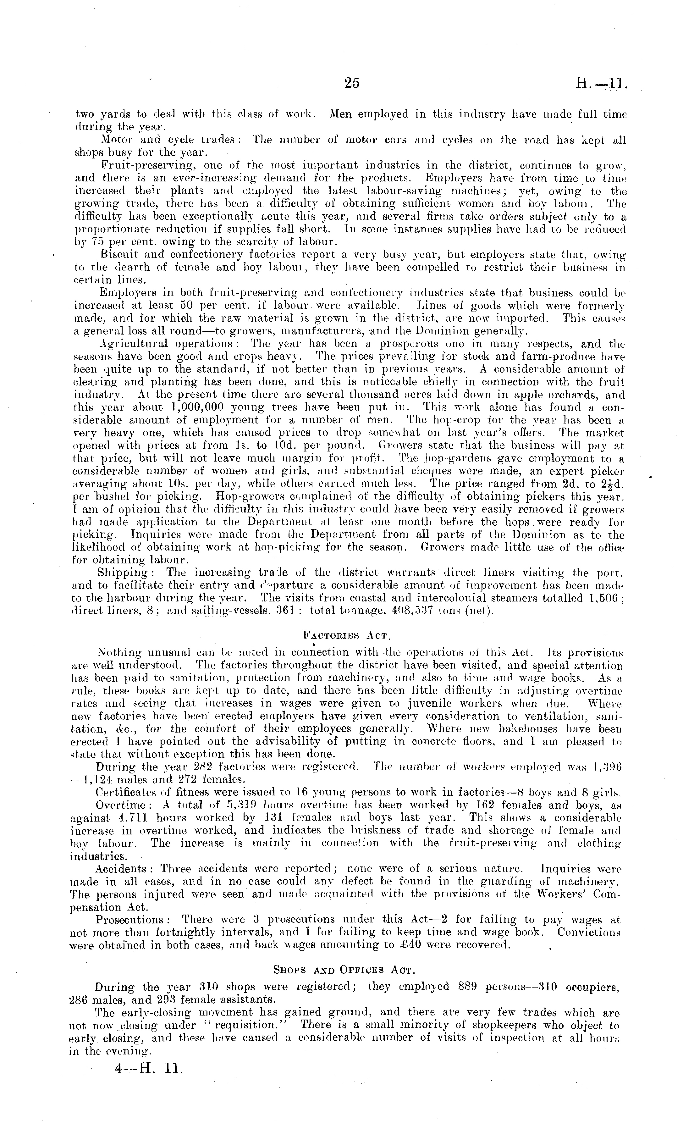 two yards to deal with this class of work. Men. employed in this industry have made full time during the year. Motor and cycle trades : The number of motor cars and cycles on the road has kept all shops busy for the year. Fruit-preserving, one of the most important industries in the district, continues to grow, and there is an ever-increasing demand for the products. Employers have from time to time increased their plants and employed the latest labour-saving machines; yet, owing to the growing trade, there has been a difficulty of obtaining sufficient women and boy laboui . The difficulty has been exceptionally acute this year, and several firms take orders subject only to a proportionate reduction if supplies fall short. In some instances supplies have had to be reduced by 75 per cent, owing to the scarcity of labour. Biscuit and confectionery factories report a very busy year, but employers state that, owing to the dearth of female and boy labour, they have been compelled to restrict their business in certain lines. Employers in both fruit-preserving and confectionery industries state that business could be increased at least 50 per cent, if labour were available. Lines of goods which were formerly made, and for which the raw material is grown in the district, are now imported. This causes a general loss all round —to growers, manufacturers, and the Dominion generally. Agricultural operations : The year has been a prosperous one in many respects, and the seasons have been good and crops heavy. The prices prevailing for stock and farm-produce have been quite up to the standard, if not better than in previous years. A considerable amount of clearing and planting has been done, and this is noticeable chiefly in connection with the fruit industry. At the present time there are several thousand acres laid down in apple orchards, and this year about 1,000,000 young trees have been put in. This work alone has found a considerable amount of employment for a number of men. The hop-crop for the year has been a very heavy one, which has caused juices to drop somewhat on last year's offers. The market opened with prices at from Is. to lOd. per pound. Growers state that the business will pay at that price, but will not leave much margin for profit. The hop-gardens gave employment to a considerable number of women and girls, and substantial cheques were made, an expert picker averaging about 10s. per day, while others earned much less. The price ranged from 2d. to 2Jd. per bushel for picking. Hop-growers complained of the difficulty of obtaining pickers this year. I am of opinion that the difficulty in this industry could have been very easily removed if growers had made application to the Department at least one month before the hops were ready for picking. Inquiries were made from the Department from all parts of the Dominion as to the likelihood of obtaining work at hop-picking for the season. Growers made little use of the office for obtaining labour. Shipping: The increasing trale of the district warrants direct liners visiting the port, and to facilitate their entry and departure a considerable amount of improvement has been made to the harbour during the year. The visits from coastal and intercolonial steamers totalled 1,506 ; direct liners, 8; and sailing-vessels. 361 : total tonnage, 408,537 tons (net); Factories Act. Nothing unusual can be noted in connection with the operations of this Act. Its provisions are well understood. The factories throughout the district have been visited, and special attention has been paid to sanitation, protection from machinery, and also to time and wage books. As a rule, these books are kept up to date, and there has been little difficulty in adjusting overtime rates and seeing that increases in wages were given to juvenile workers when due. Where new factories have been erected employers have given every consideration to ventilation, sanitation, &c, for the comfort of their employees generally. Where new bakehouses have been erected I have pointed out the advisability of putting in concrete floors, and I am pleased to state that without exception this has been done. During the year 282 factories were registered. The number of workers employed was 1,396 -1,124 males and 272 females. Certificates of fitness were issued to 16 young persons to work in factories —8 boys and 8 girls. Overtime: A total of 5,319 hours overtime has been worked by 162 females and boys, as against 4,711 hours worked by 131 females and boys last year. This shows a considerable increase in overtime worked, and indicates the briskness of trade and shortage of female and boy labour. The increase is mainly in connection with the fruit-preserving and clothing industries. Accidents: Three accidents were reported; none were of a serious nature. Inquiries were made in all cases, and in no case could any defect be found in the guarding of machinery. The persons injured were seen and made acquainted with the provisions of the Workers' Compensation Act. Prosecutions : There were 3 prosecutions under this Act —2 for failing to pay wages at not more than fortnightly intervals, and 1 for failing to keep time and wage book. Convictions were obtained in both cases, and back wages amounting to £40 were recovered. Shops and Offices Act. During the year 310 shops were registered; they employed 889 persons —310 occupiers, 286 males, and 293 female assistants. The early-closing movement has gained ground, and there are very few trades which are not now closing under " requisition." There is a small minority of shopkeepers who object to early closing, and these have caused a considerable number of visits of inspection at all hours in the evening.