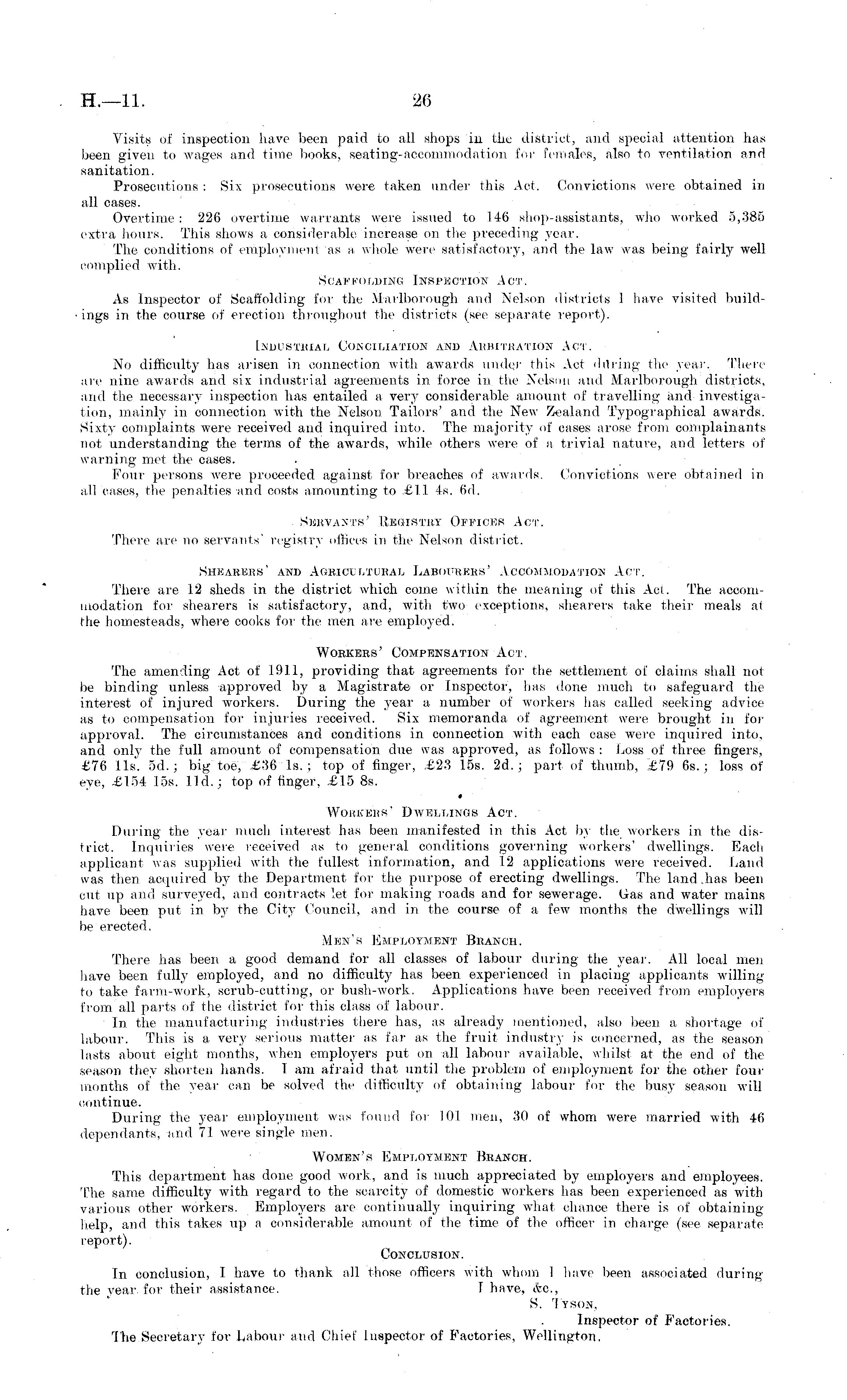 Visits of inspection have boon paid to all shops in the district, and special attention has been given to wages and time books, seating-accommodation for females, also to ventilation and sanitation. Prosecutions: Six prosecutions were taken under this Act. Convictions were obtained in all cases. Overtime: 226 overtime warrants were issued to 146 shop-assistants, who worked 5,385 extra hours. This shows a considerable increase on the preceding year. The conditions of employment as a whole were satisfactory, and tht< law was being fairly well complied with. Scaffolding Inspection Act. As Inspector of Scaffolding for the Marlborough and Nelson districts 1 have visited buildings in the course of erection throughout the districts (see separate report). Industrial Conciliation and Arbitration Act. No difficulty has arisen in connection with awards under this Act during the year. There an- nine awards and six industrial agreements in force in the Nelson and Marlborough districts, and the necessary inspection lias entailed a very considerable amount of travelling and investigation, mainly in connection with the Nelson Tailors' and the New Zealand Typographical awards. Sixty complaints were received and inquired into. The majority of cases arose from complainants not understanding the terms of the awards, while others were of a trivial nature, and letters of warning met the cases. Four persons were proceeded against for breaches of awards. Convictions were obtained in all cases, the penalties and costs amounting to £1.1. 4s. 6d. Servants' Registry Offices Act. There arc no servants' registry offices in the Nelson district. Shearers' and Agricultural Labourers' Accommodation Act. There are 12 sheds in the district which come within the meaning of this Acl. The accommodation for shearers is satisfactory, and, with two exceptions, shearers take their meals at the homesteads, where cooks for the men are employed. Workers' Compensation Act. The amending Act of 1911, providing that agreements for the settlement of claims shall not be binding unless approved by a Magistrate or Inspector, has done much to safeguard the interest of injured workers. During the .year a number of workers has called see;king advice as to compensation for injuries received. Six memoranda of agreement were brought in for approval. The circumstances and conditions in connection with each case were inquired into, and only the full amount of compensation due was approved, as follows : boss of three fingers, £76 Us. 5d.; big toe, £36 Is.; top of finger, £23 15s. 2d.; part of thumb, £79 65.; loss of eve, £154 15s. Ud.; top of finger, £15 Bs. Workers' Dwellings Act. During the year much interest has been manifested in this Act by the, workers in the district. Inquiries were received as to general conditions governing workers' dwellings. Each applicant was supplied with the fullest information, and 12 applications were received. Land was then acquired by the Department for the purpose of erecting dwellings. The land has been cut up and surveyed, and contracts let for making roads and for sewerage. Gas and water mains have been put in by the City Council, and in the course of a few months the dwellings will be erected. Men's Employment Branch. There lias been a good demand for all classes of labour during the year. All local men have been fully employed, and no difficulty has been experienced in placing applicants willing to take farm-work, scrub-cutting, or bush-work. Applications have been received from employers from all parts of the district for this class of labour. In the manufacturing industries there has, as already mentioned, also been a shortage of labour. This is a very serious matter as far as the fruit industry is concerned, as the season lasts about eight months, when employers put on all labour available, whilst at the end of the season they shorten hands. I am afraid that until the problem of employment for the other four months of the year can be solved the difficulty of obtaining labour for the busy season will continue. During the year employment was round for 101 men, 30 of whom were married with 46 dependants, and 71 were single men. Women's Employment Branch. This department has done good work, and is much appreciated by employers and employees. The same difficulty with regard to the scarcity of domestic workers has been experienced as with various other workers. Employers are continually inquiring what chance there is of obtaining help, and this takes up a considerable amount of the time of the officer in charge (see separate report). Conclusion. In conclusion, I have to thank all those officers with whom 1 have been associated during the year for their assistance. ] have, &c, S. Tyson, Inspector of Factories. The Secretary for Labour and Chief Inspector of Factories, Wellington,