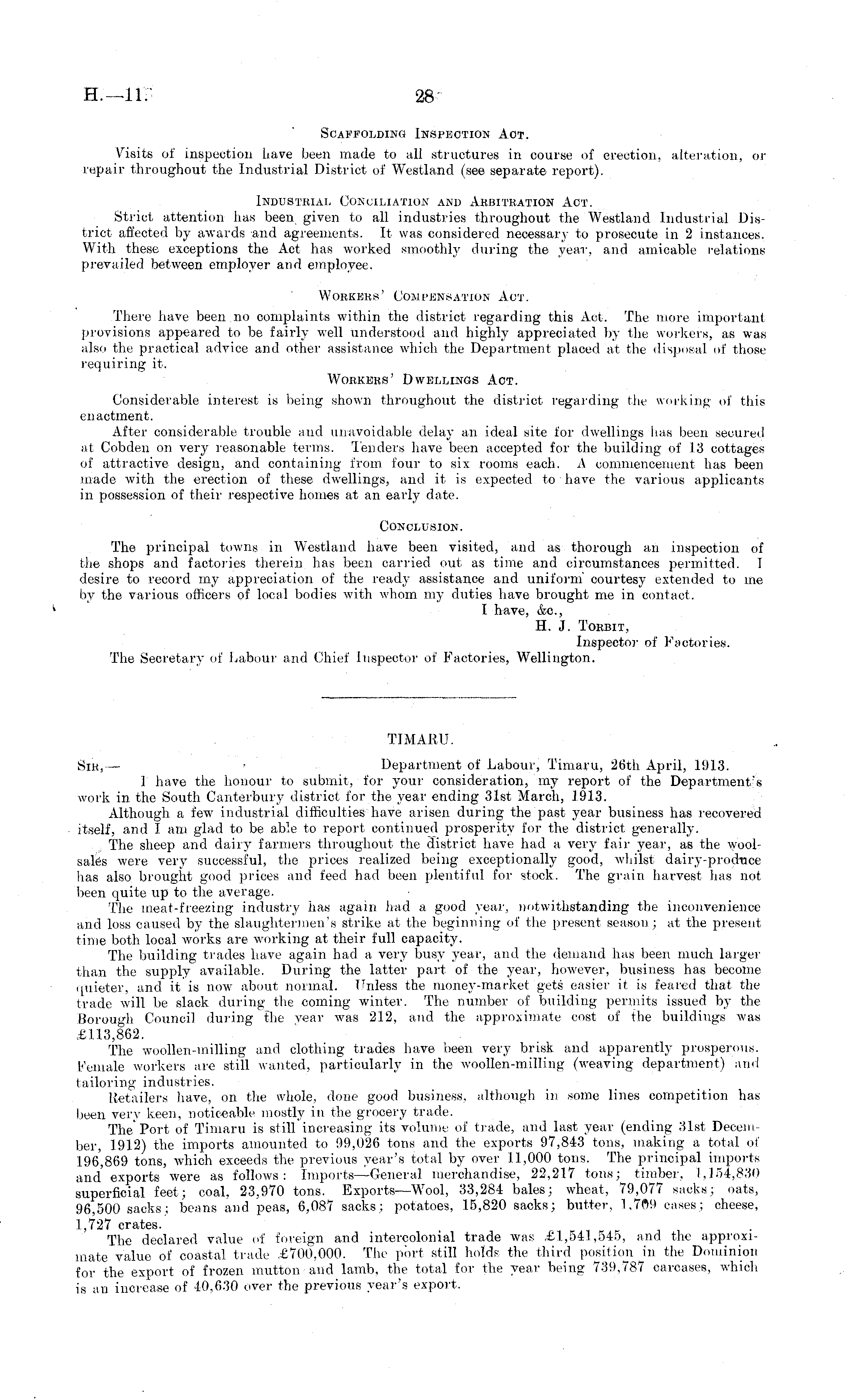 Scaffolding Inspection Act. Visits of inspection have been made to all structures in course of erection, alteration, or repair throughout the Industrial District of Westland (see separate report). Industrial Conciliation and Arbitration Act. Strict, attention has been given to all industries throughout the Westland Industrial District affected by awards and agreements. It was considered necessary to prosecute in 2 instances. With these exceptions the Act has worked smoothly during the year, and amicable relations prevailed between employer and employee. Workers' Compensation Act. There have been no complaints within the district regarding this Act. The more important provisions appeared to be fairly well understood and highly appreciated by the workers, as was also the practical advice and other assistance which the Department placed at the disposal of those requiring it. Workers' Dwellings Act. Considerable interest is being shown throughout the district regarding the working of this enactment. After considerable trouble and unavoidable delay an ideal site for dwellings has been secured at Cobden on very reasonable terms. Tenders have been accepted for the building of 13 cottages of attractive design, and containing from four to six rooms each. A commencement has been made with the erection of these dwellings, and it is expected to have the various applicants in possession of their respective homes at an early date. Conclusion. The principal towns in Westland have been visited, and as thorough an inspection of the shops and factories therein has been carried out as time and circumstances permitted. I desire to record my appreciation of the ready assistance and uniform courtesy extended to me by the various officers of local bodies with whom my duties have brought me in contact. I have, &c, H. J. T orbit, Inspector of Factories. The Secretary of Labour and Chief Inspector of Factories, Wellington. TIMARU. Sir, — Department of Labour, Timaru, 26th April, 1913. 1 have the honour to submit, for your consideration, my report of the Department's work in the South Canterbury district for the year ending 31st March, 1913. Although a few industrial difficulties have arisen during the past year business has recovered itself, and I am glad to be able to report continued prosperity for the district generally. The sheep and dairy farmers throughout the district have had a very fair year, as the woolsales were very successful, the prices realized being exceptionally good, whilst dairy-produce has also brought good prices and feed had been plentiful for stock. The grain harvest has not been quite up to the average. The meat-freezing industry has again had a good year, notwithstanding the inconvenience and loss caused by the slaughtermen's strike at the beginning of the present season; at the present time both local works are working at their full capacity. The building trades have again had a very busy year, and the demand has been much larger than the supply available. During the latter part of the year, however, business has become quieter, and it is now about normal. Unless the money-market gets easier it is feared that the trade will be slack during the coining winter. The number of building permits issued by the Borough Council during the year was 212, and the approximate cost of the buildings was £1.13,862. The woollen-milling and clothing trades have been very brisk and apparently prosperous. Female workers arc still wanted, particularly in the woollen-milling (weaving department) ami tailoring industries. Retailers have, on the whole, done good business, although in some lines competition has been very keen, noticeable mostly in. the grocery trade. The' Port of Timaru is still"increasing its volume of trade, and last year (ending 31st Decern ber, 1912) the imports amounted to 99,026 tons and the exports 97,843 tons, making a total of 196,869 tons, which exceeds the previous year's total by over 1.1,000 tons. The principal imports and' exports were as follows: Imports —General merchandise, 22,217 tons; timber, 1,154,830 superficial feet; coal, 23,970 tons. Exports—Wool, 33,284 bales; wheat, 79,077 sacks; oats, 96,500 sacks; beans and peas, 6,087 sacks; potatoes, 15,820 sacks; butter. 1,709 cases; cheese, 1,727 crates. The declared value of foreign and intercolonial trade was £1,541,545, and the approximate value of coastal trade £700,000. The port still holds the third position in the Dominion for the export of frozen mutton and lamb, the total for the year being 739,787 carcases, which is an increase of 40,630 over the previous year's export.
