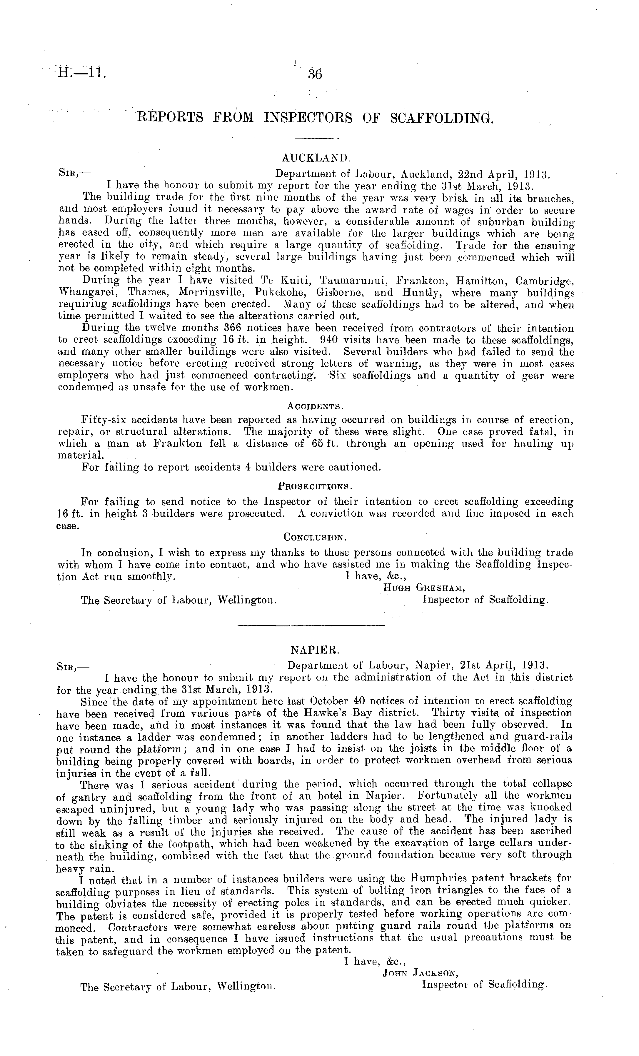 REPORTS PROM INSPECTORS OF SCAFFOLDING. AUCKLAND. Sir, — Department of Labour, Auckland, 22nd April, 1913. I have the honour to submit my report for the year ending the 31st March, 1913. The building trade for the first nine months of the year was very brisk in all its branches, and most employers found it necessary to pay above the award rate of wages in order to secure hands. During the latter three months, however, a considerable amount of suburban buildinghas eased off, consequently more men are available for the larger buildings which are being erected in the city, and which require a large quantity of scaffolding. Trade for the ensuing year is likely to remain steady, several large buildings having just been commenced which will not be completed within eight months. During the year I have visited Te Kuiti, Tauinarunui, Frankton, Hamilton, Cambridge, Whangarei, Thames, Morrinsville, Pukekohe, Gisborne, and Huntly, where many buildings requiring scaffoldings have been erected. Many of these scaffoldings had to be altered, and when time permitted I waited to see the alterations carried out. During the twelve months 366 notices have been received from contractors of their intention to erect scaffoldings exceeding 16 ft. in height. 940 visits have been made to these scaffoldings, and many other smaller buildings were also visited. Several builders who had failed to send the necessary notice before erecting received strong letters of warning, as they were in most cases employers who had just commenced contracting. Six scaffoldings and a quantity of gear were condemned as unsafe for the use of workmen. Accidents. Fifty-six accidents have been reported as having occurred on buildings in course of erection, repair, or structural alterations. The majority of these were, slight. One case proved fatal, in which a man at Frankton fell a distance of 65 ft. through an opening used for hauling up material. For failing to report accidents 4 builders were cautioned. Prosecutions. For failing to send notice to the Inspector of their intention to erect scaffolding exceeding 16 ft. in height 3 builders were prosecuted. A conviction was recorded and fine imposed in each case. Conclusion. In conclusion, I wish to express my thanks to those persons connected with the building trade with whom I have come into contact, and who have assisted me in making the Scaffolding Inspection Act run smoothly. I have, &c, Hugh Gresham, The Secretary of Labour, Wellington. Inspector of Scaffolding. NAPIER. Sir, — Department of Labour, Napier, 21st April, 1913. I have the honour to submit my report on the administration of the Act in this district for the year ending the 31st March, 1913. Since the date of my appointment here last October 40 notices of intention to erect scaffolding have been received from various parts of the Hawke's Bay district. Thirty visits of inspection have been made, and in most instances it was found that the law had been fully observed. In one instance a ladder was condemned; in another ladders had to be lengthened and guard-rails put round the platform; and in one case I had to insist on the joists in the middle floor of a building being properly covered with boards, in order to protect workmen overhead from serious injuries in the event of a fall. There was 1 serious accident'during the period, which occurred through the total collapse of gantry and scaffolding from the front of an hotel in Napier. Fortunately all the workmen escaped uninjured, but a young lady who was passing along the street at the time was knocked down by the falling timber and seriously injured on the body and head. The injured lady is still weak as a result of the injuries she received. The cause of the accident has been ascribed to the sinking of the footpath, which had been weakened by the excavation of large cellars underneath the building, combined with the fact that the ground foundation became very soft through heavy rain. I noted that in a number of instances builders were using the Humphries patent brackets for scaffolding purposes in lieu of standards. This system of bolting iron triangles to the face of a building obviates the necessity of erecting poles in standards, and can be erected much quicker. The patent is considered safe, provided it is properly tested before working operations are commenced. Contractors were somewhat careless about putting guard rails round the platforms on this patent, and in consequence I have issued instructions that the usual precautions must be taken to safeguard the workmen employed on the patent. I have, &c, John Jackson, The Secretary of Labour, Wellington. Inspector of Scaffolding.