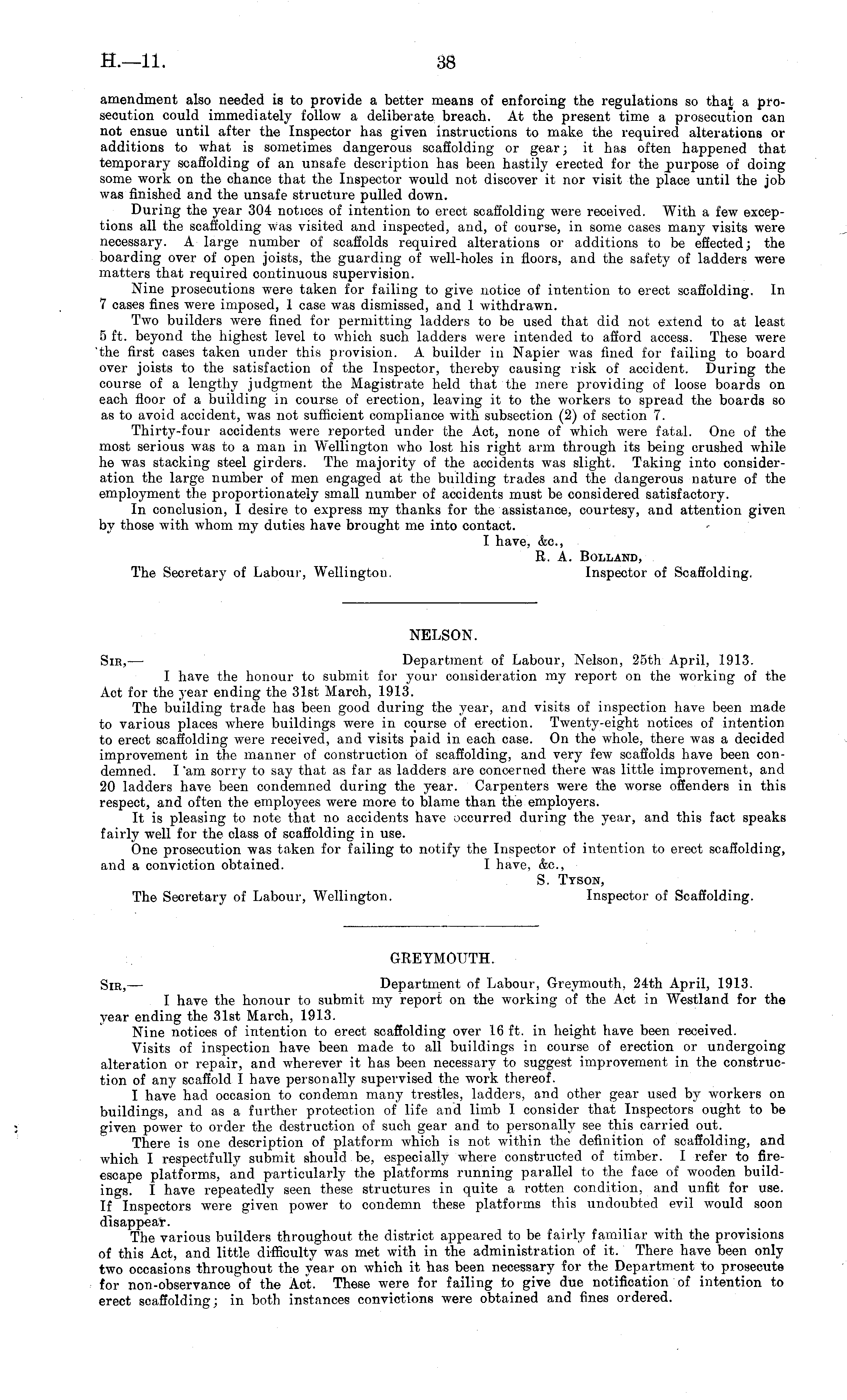 amendment also needed is to provide a better means of enforcing the regulations so that a prosecution could immediately follow a deliberate breach. At the present time a prosecution can not ensue until after the Inspector has given instructions to make the required alterations or additions to what is sometimes dangerous scaffolding or gear; it has often happened that temporary scaffolding of an unsafe description has been hastily erected for the purpose of doing some work on the chance that the Inspector would not discover it nor visit the place until the job was finished and the unsafe structure pulled down. During the year 304 notices of intention to erect scaffolding were received. With a few exceptions all the scaffolding was visited and inspected, and, of course, in some cases many visits were necessary. A large number of scaffolds required alterations or additions to be effected; the boarding over of open joists, the guarding of well-holes in floors, and the safety of ladders were matters that required continuous supervision. Nine prosecutions were taken for failing to give notice of intention to erect scaffolding. In 7 cases fines were imposed, 1 case was dismissed, and 1 withdrawn. Two builders were fined for permitting ladders to be used that did not extend to at least 5 ft. beyond the highest level to which such ladders were intended to afford access. These were the first cases taken under this provision. A builder in Napier was fined for failing to board over joists to the satisfaction of the Inspector, thereby causing risk of accident. During the course of a lengthy judgment the Magistrate held that the mere providing of loose boards on each floor of a building in course of erection, leaving it to the workers to spread the boards so as to avoid accident, was not sufficient compliance with subsection (2) of section 7. Thirty-four accidents were reported under the Act, none of which were fatal. One of the most serious was to a man in Wellington who lost his right arm through its being crushed while he was stacking steel girders. The majority of the accidents was slight. Taking into consideration the large number of men engaged at the building trades and the dangerous nature of the employment the proportionately small number of accidents must be considered satisfactory. In conclusion, I desire to express my thanks for the assistance, courtesy, and attention given by those with whom my duties have brought me into contact. I have, &c, R. A. Bolland, The Secretary of Labour, Wellington. Inspector of Scaffolding. NELSON. Sir, — Department of Labour, Nelson, 25th April, 1913. I have the honour to submit for your consideration my report on the working of the Act for the year ending the 31st March, 1913. The building trade has been good during the year, and visits of inspection have been made to various places where buildings were in course of erection. Twenty-eight notices of intention to erect scaffolding were received, and visits paid in each case. On the whole, there was a decided improvement in the manner of construction of scaffolding, and very few scaffolds have been condemned. I 'am sorry to say that as far as ladders are concerned there was little improvement, and 20 ladders have been condemned during the year. Carpenters were the worse offenders in this respect, and often the employees were more to blame than the employers. It is pleasing to note that no accidents have occurred during the year, and this fact speaks fairly well for the class of scaffolding in use. One prosecution was taken for failing to notify the Inspector of intention to erect scaffolding, and a conviction obtained. I have, &c, S. Tyson, The Secretary of Labour, Wellington. Inspector of Scaffolding. GREYMOUTH. Sir, — Department of Labour, Greymouth, 24th April, 1913. I have the honour to submit my report on the working of the Act in Westland for the year ending the 31st March, 1913. Nine notices of intention to erect scaffolding over 16 ft. in height have been received. Visits of inspection have been made to all buildings in course of erection or undergoing alteration or repair, and wherever it has been necessary to suggest improvement in the construction of any scaffold I have personally supervised the work thereof. I have had occasion to condemn many trestles, ladders, and other gear used by workers on buildings, and as a further protection of life and limb I consider that Inspectors ought to be given power to order the destruction of such gear and to personally see this carried out. There is one description of platform which is not within the definition of scaffolding, and which I respectfully submit should be, especially where constructed of timber. I refer to fireescape platforms, and particularly the platforms running parallel to the face of wooden buildings. I have repeatedly seen these structures in quite a rotten condition, and unfit for use. If Inspectors were given power to condemn these platforms this undoubted evil would soon disappear. The various builders throughout the district appeared to be fairly familiar with the provisions of this Act, and little difficulty was met with in the administration of it. There have been only two occasions throughout the year on which it has been necessary for the Department to prosecute for non-observance of the Aot. These were for failing to give due notification of intention to erect scaffolding; in both instances convictions were obtained and fines ordered.