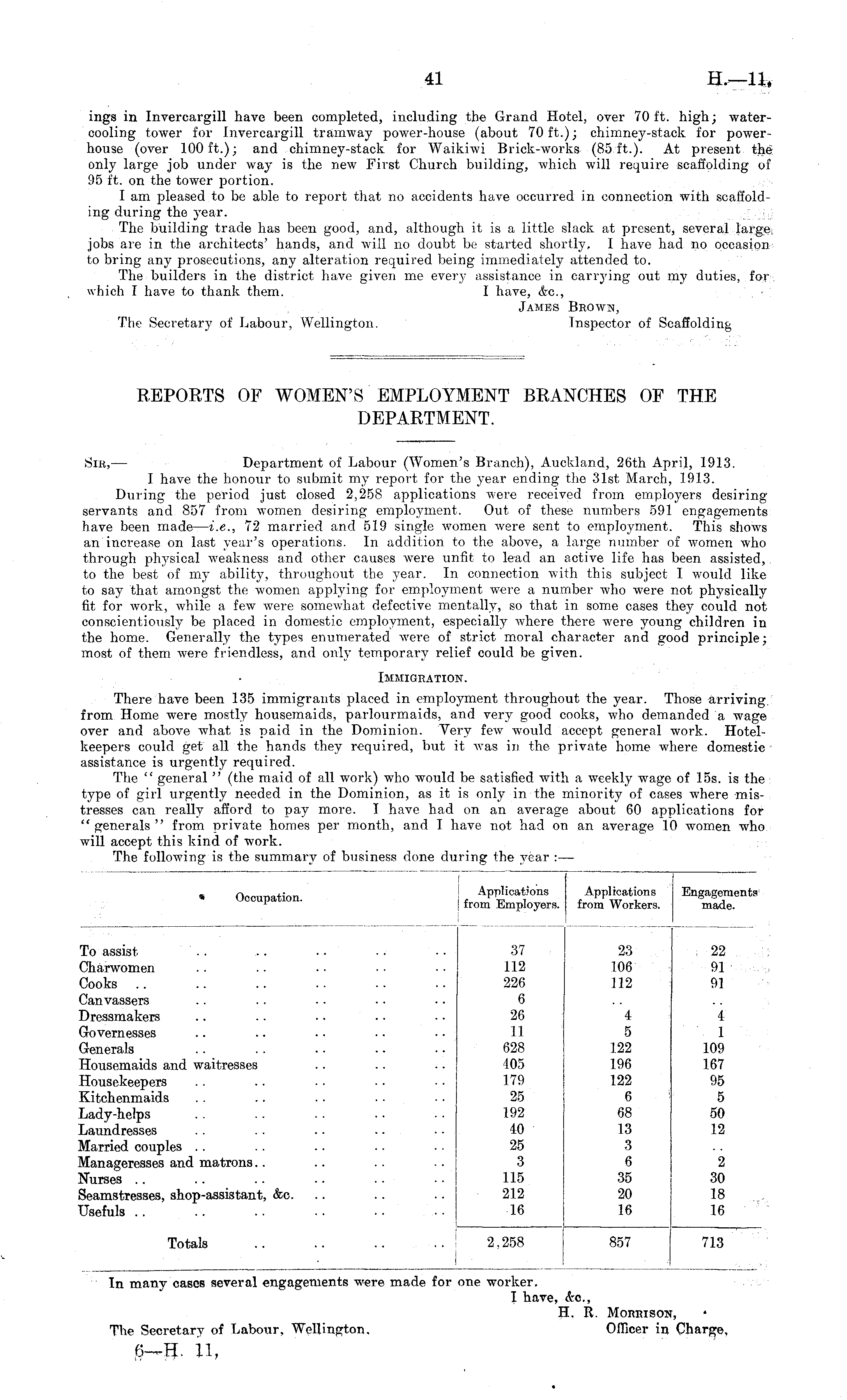 ings in Invercargill have been completed, including the Grand Hotel, over 70 ft. high; watercooling tower for Invercargill tramway power-house (about 70 ft.); chimney-stack for powerhouse (over 100 ft.); and chimney-stack for Waikiwi Brick-works (85 ft.). At present the" only large job under way is the new First Church building, which will require scaffolding of 95 ft. on the tower portion. I am pleased to be able to report that no accidents have occurred in connection with scaffolding during the year. The building trade has been good, and, although it is a little slack at present, several large, jobs are in the architects' hands, and will no doubt be started shortly, I have had no occasion to bring any prosecutions, any alteration required being immediately attended to. The builders in the district have given me every assistance in carrying out my duties, for . which I have to thank them. I have, &c, • James Brown, The Secretary of Labour, Wellington. Inspector of Scaffolding REPORTS OF WOMEN'S EMPLOYMENT BRANCHES OF THE DEPARTMENT. Sir, — Department of Labour (Women's Branch), Auckland, 26th April, 1913. I have the honour to submit my report for the year ending the 31st March, 1913. During the period just closed 2,258 applications were received from employers desiring servants and 857 from women desiring employment. Out of these numbers 591 engagements have been made — i.e., 72 married and 519 single women were sent to employment. This shows an increase on last year's operations. In addition to the above, a large number of women who through physical weakness and other causes were unfit to lead an active life has been assisted, to the best of my ability, throughout the year. In connection with this subject I would like to say that amongst the women applying for employment were a number who were not physically fit for work, while a few were somewhat defective mentally, so that in some cases they could not conscientiously be placed in domestic employment, especially where there were young children in the home. Generally the types enumerated were of strict moral character and good principle; most of them were friendless, and only temporary relief could be given. Immigration. There have been 135 immigrants placed in employment throughout the year. Those arriving, from Home were mostly housemaids, parlourmaids, and very good cooks, who demanded a wage over and above what is paid in the Dominion. Very few would accept general work. Hotelkeepers could get all the hands they required, but it was in the private home where domestic assistance is urgently required. The " general " (the maid of all work) who would be satisfied with a weekly wage of 15s. is the type of girl urgently needed in the Dominion, as it is only in the minority of cases where mistresses can really afford to pay more. I have had on an average about 60 applications for "generals" from private homes per month, and I have not had on an average 10 women who will accept this kind of work. The following is the summary of business done during the year :—