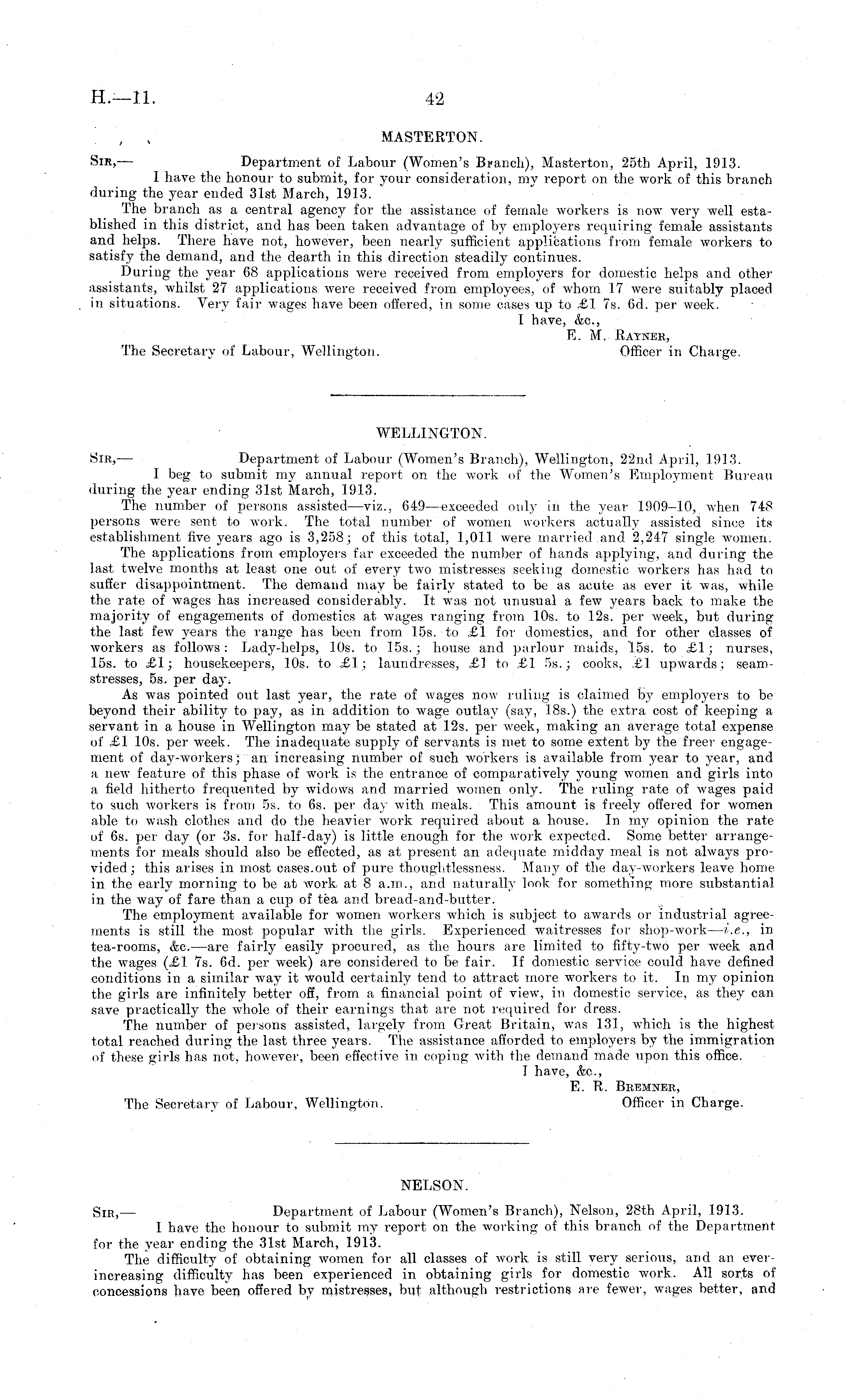 , , MASTERTON. Sir, — Department of Labour (Women's Branch), Masterton, 25th April, 1913. 1 have the honour to submit, for your consideration, my report on the work of this branch during the year ended 31st March, 1913. The branch as a central agency for the assistance of female workers is now very well established in this district, and has been taken advantage of by employers requiring female assistants and helps. There have not, however, been nearly sufficient applications from female workers to satisfy the demand, and the dearth in this direction steadily continues. During the year 68 applications were received from employers for domestic helps and other assistants, whilst 27 applications were received from employees, of whom 17 were suitably placed in situations. Very fair wages have been offered, in some cases up to £1 7s. 6d. per week. I have, <fee, E. M. Ratner, The Secretary of Labour, Wellington. Officer in Charge. WELLINGTON. Sir, — Department of Labour (Women's Branch), Wellington, 22nd April, 1913. I beg to submit my annual report on the work of the Women's Employment Bureau during the year ending 31st March, 1913. The number of persons assisted —viz., 649—exceeded only in the year 1909-10, when 748 persons were sent to work. The total number of women workers actually assisted since its establishment five years ago is 3,258; of this total, 1,011 were married and 2,247 single women. The applications from employers far exceeded the number of hands applying, and during the last twelve months at least one out of every two mistresses seeking domestic workers has had to suffer disappointment, The demand may be fairly stated to be as acute as ever it was, while the rate of wages has increased considerably. It was not unusual a few years back to make the majority of engagements of domestics at wages ranging from 10s. to 12s. per week, but during the last few years the range has been from 15s. to £1 for domestics, and for other classes of workers as follows: Lady-helps, 10s. to 155.; house and parlour maids, 15s. to £1; nurses, 15s. to £1; housekeepers, 10s. to £1; laundresses, £1 to £1 55.; cooks, £1 upwards; seamstresses, ss. per day. As was pointed out last year, the rate of wages now ruling is claimed by employers to be beyond their ability to pay, as in addition to wage outlay (say, 1.85.) the extra cost of keeping a servant in a house in AVellington may be stated at 12s. per week, making an average total expense of £1 10s. per week. The inadequate supply of servants is met to some extent by the freer engagement of day-workers; an increasing number of such workers is available from to year, and a new feature of this phase of work is the entrance of comparatively young women and girls into a field hitherto frequented by widows and married women only. The ruling rate of wages paid to such workers is from ss. to 6s. per day with meals. This amount is freely offered for women able to wash clothes and do the heavier work required about a house. In my opinion the rate of 6s. per day (or 3s. for half-day) is little enough for the work expected. Some better arrangements for meals should also be effected, as at present an adequate midday meal is not always provided; this arises in most cases.out of pure thoughtlessness. Many of the day-workers leave home in the early morning to be at work at 8 a.m., and naturally look for something more substantial in the way of fare than a cup of tea and bread-and-butter. The employment available for women workers which is subject to awards or industrial agreements is still the most popular with the girls. Experienced waitresses for shop-work— i.e., in tea-rooms, <fee. —are fairly easily procured, as the hours are limited to fifty-two per week and the wages (£1 7s. 6d. per week) are considered to be fair. If domestic service could have defined conditions in a similar way it would certainly tend to attract more workers to it. In my opinion the girls are infinitely better off, from a financial point of view, in domestic service, as they can save practically the whole of their earnings that are not required for dress. The number of persons assisted, largely from Great Britain, was 131, which is the highest total reached during the last three years. The assistance afforded to employers by the immigration of these girls has not, however, been effective in coping with the demand made upon this office. I have, &c, E. R. Bremner, The Secretary of Labour, Wellington. Officer in Charge. NELSON. Sir, — Department of Labour (Women's Branch), Nelson, 28th April, 1913. I have the honour to submit my report on the working of this branch of the Department for the year ending the 31st March, 1913. The difficulty of obtaining women for all classes of work is still very serious, and an everincreasing difficulty has been experienced in obtaining girls for domestic work. All sorts of concessions have been offered by mistresses, but although restrictions are fewer, wages better, and