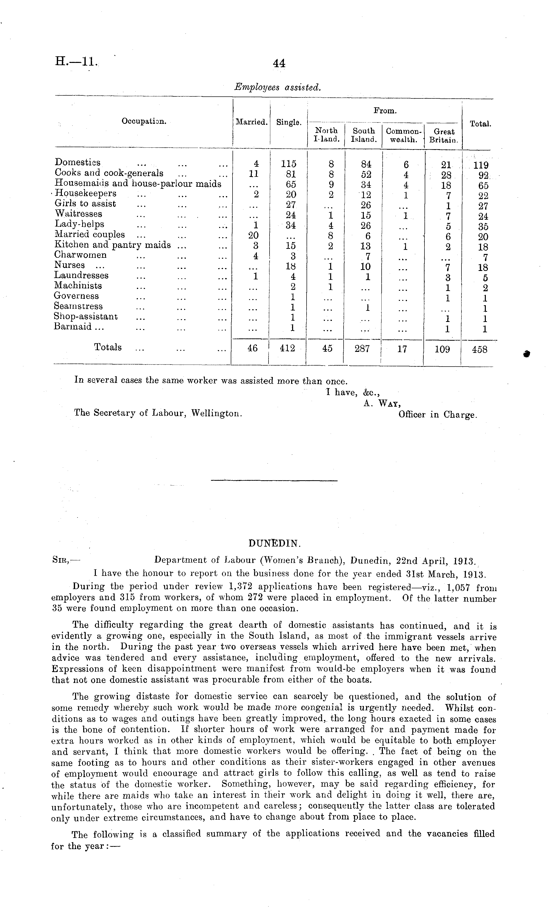 DUNEDIN. Sir, — Department of Labour (Women's Branch), Dunedin, 22nd April, 1913. I have the honour to report on the business done for the year ended 31st March, 1913. During the period under review 1,372 applications have been registered—viz., 1,057 from employers and 315 from workers, of whom 272 were placed in employment. Of the latter number 35 were found employment on more than one occasion. The difficulty regarding the great dearth of domestic assistants has continued, and it is evidently a growing one, especially in the South Island, as most of the immigrant vessels arrive in the north. During the past year two overseas vessels which arrived here have been met, when advice was tendered and every assistance, including employment, offered to the new arrivals. Expressions of keen disappointment were manifest from would-be employers when it was found that not one domestic assistant was procurable from either of the boats. The growing distaste for domestic service can scarcely be questioned, and the solution of some remedy whereby such work would be made more congenial is urgently needed. Whilst conditions as to wages and outings have been greatly improved,, the long hours exacted in some cases is the bone of contention. If shorter hours of work were arranged for and payment made for extra hours worked as in other kinds of employment, which would be equitable to both employer and servant, I think that more domestic workers would be offering. The fact of being on the same footing as to hours and other conditions as their sister-workers engaged in other avenues of employment would encourage and attract girls to follow this calling, as well as tend to raise the status of the domestic worker. Something, however, may be said regarding efficiency, for while there are maids who take an interest in their work and delight in doing it well, there are, unfortunately, those who are incompetent and careless; consequently the latter class are tolerated only under extreme circumstances, and have to change about from place to place. The following is a classified summary of the applications received and the vacancies filled for the year : —