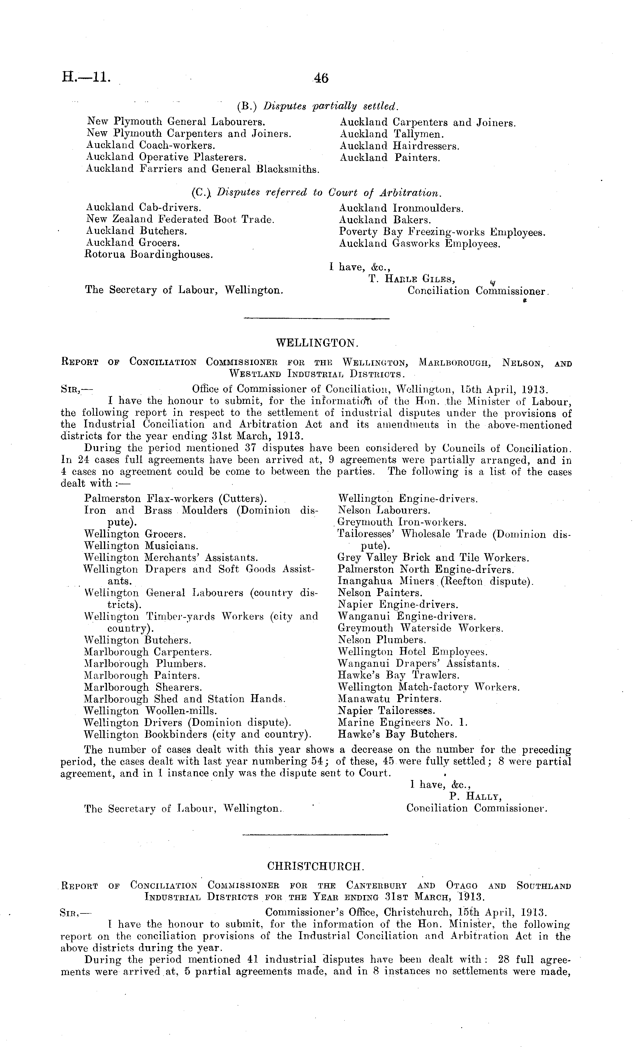 (B.) Disputes partially settled. New Plymouth General Labourers. Auckland Carpenters and Joiners. New Plymouth Carpenters and Joiners. Auckland Tallymen. Auckland Coach-workers. Auckland Hairdressers. Auckland Operative Plasterers. Auckland Painters. Auckland Farriers and General Blacksmiths. (C.) Disputes referred to Court of Arbitration. Auckland Cab-drivers. Auckland Ironmoulders. New Zealand Federated Boot Trade. Auckland Bakers. Auckland Butchers. Poverty Bay Freezing-works Employees. Auckland Grocers. Auckland Gasworks Employees. Rotorua Boardinghouses. I have, &c, T. Harle Giles, The Secretary of Labour, Wellington. Conciliation Commissioner WELLINGTON. Report of Conciliation Commissioner for the Wellington, Marlborough, Nelson, and Westland Industrial Districts. Sir, — Office of Commissioner of Conciliation, Wellington, 15th April, 1913. I have the honour to submit, for the information of the Hon. the Minister of Labour, the following report in respect to the settlement of industrial disputes under the provisions of the Industrial Conciliation and Arbitration Act and its amendments in the above-mentioned districts for the year ending 31st March, 1913. During the period mentioned 37 disputes have been considered by Councils of Conciliation. In 24 cases full agreements have been arrived at, 9 agreements were partially arranged, and in 4 cases no agreement could be come to between the parties. The following is a list of the cases dealt with :— Palmerston Flax-workers (Cutters). Wellington Engine-drivers. Iron and Brass Moulders (Dominion dis- Nelson Labourers. pute). . Greymouth Iron-workers. Wellington Grocers. Tailoresses' Wholesale Trade (Dominion disWellington Musicians. pute). Wellington Merchants' Assistants. Grey Valley Brick and Tile Workers. Wellington Drapers and Soft Goods Assist- Palmerston North Engine-drivers. ants. Inangahua Miners (Reefton dispute). Wellington General Labourers (country dis- Nelson Painters. tricts). Napier Engine-drivers. Wellington Timber-yards Workers (city and Wanganui Engine-drivers. country). Greymouth Waterside Workers. Wellington Butchers. Nelson Plumbers. Marlborough Carpenters. Wellington Hotel Employees. Marlborough Plumbers. Wanganui Drapers' Assistants. Marlborough Painters. Hawke's Bay Trawlers. Marlborough Shearers. Wellington Match-factory Workers. Marlborough Shed and Station Hands. Manawatu Printers. Wellington Woollen-mills. Napier Tailoresses. Wellington Drivers (Dominion dispute). Marine Engineers No. 1. Wellington Bookbinders (city and country). Hawke's Bay Butchers. The number of cases dealt with this year shows a decrease on the number for the preceding period, the cases dealt with last year numbering 54; of these, 45 were fully settled; 8 were partial agreement, and in 1 instance only was the dispute sent to Court. I have, (fee, P. Hally, The Secretary of Labour, Wellington. Conciliation Commissioner. CHRISTCHURCH. Report of Conciliation Commissioner for the Canterbury and Otago and Southland Industrial Districts for the Tear ending 31st March, 1913. Sir, — Commissioner's Office, Christchurch, 15th April, 1913. 1 have the honour to submit, for the information of the Hon. Minister, the following report on the conciliation provisions of the Industrial Conciliation and Arbitration Act in the above districts during the year. During the period mentioned 41 industrial disputes have been dealt with : 28 full agreements were arrived.at, 5 partial agreements made, and in 8 instances no settlements were made,