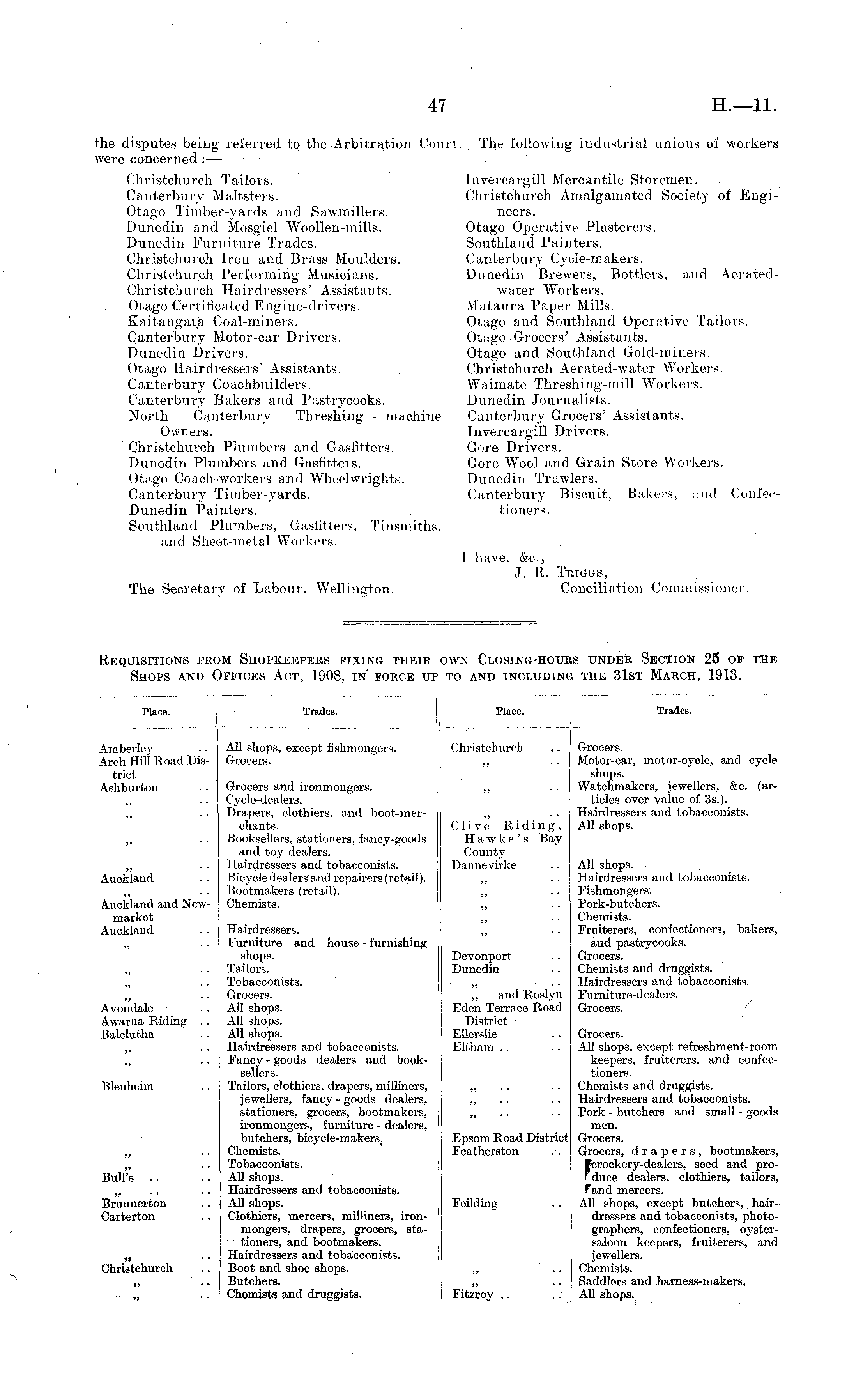the disputes being referred to the Arbitration Court. The following industrial unions of workers were concerned : — Christchurch Tailors. Invercargill Mercantile Storemen. Canterbury Maltsters. Christchurch Amalgamated Society of EngiOtago Timber-yards and Sawmillers. neers. Dunedin and Mosgiel Woollen-mills. Otago Operative Plasterers. Dunedin Furniture Trades. Southland Painters. Christchurch Iron and Brass Moulders. Canterbury Cycle-makers. Christchurch Performing Musicians. Dunedin Brewers, Bottlers, and AeratedChristchurch Hairdressers' Assistants. water Workers. Otago Certificated Engine-drivers. Mataura Paper Mills. Kaitangata Coal-miners. Otago and Southland Operative Tailors. Canterbury Motor-car Drivers. Otago Grocers' Assistants. Dunedin Drivers. Otago and Southland Gold-miners. Otago Hairdressers' Assistants. Christchurch Aerated-water Workers. Canterbury Coachbuilders. Waimate Threshing-mill Workers. Canterbury Bakers and Pastrycooks. Dunedin Journalists. North Canterbury Threshing - machine Canterbury Grocers' Assistants. Owners. Invercargill Drivers. Christchurch Plumbers and Gasfitters. Gore Drivers. Dunedin Plumbers and Gasfitters. Gore Wool and Grain Store Workers. Otago Coach-workers and Wheelwrights. Dunedin Trawlers. Canterbury Timber-yards. Canterbury Biscuit. Bakers, and ConfecDunedin Painters. tioners. Southland Plumbers, Gasfitters, Tinsmiths, and Sheet-metal Workers. I have, &c, J. R. Triggs, The Secretary of Labour, Wellington. Conciliation Commissioner.