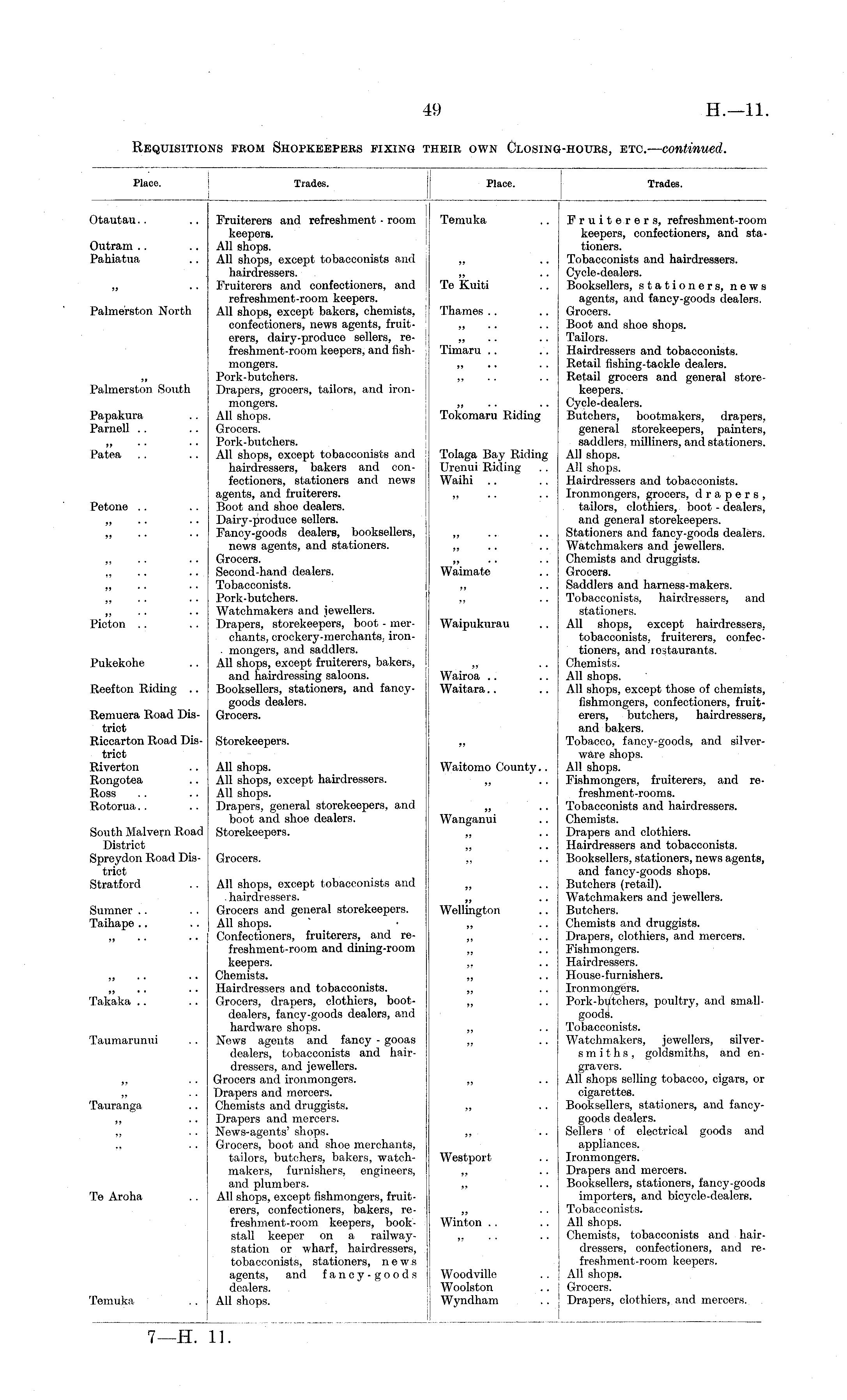 Place. Trades. Place. Trades. Otautau.. Outram Pahiatua Palmerston North Palmerston South Papakura Parnell Patea Petone Picton Fruiterers and refreshment - room keepers. All shops. All shops, except tobacconists and hairdressers. Fruiterers and confectioners, and refreshment-room keepers. All shops, except bakers, chemists, confectioners, news agents, fruiterers, dairy-produce sellers, re-freshment-room keepers, and fishmongers. Pork-butchers. Drapers, grocers, tailors, and ironmongers. All shops. Grocers. Pork-butchers. All shops, except tobacconists and I hairdressers, bakers and confectioners, stationers and news agents, and fruiterers. Boot and shoe dealers. Dairy-produce sellers. Fancy-goods dealers, booksellers, news agents, and stationers. Grocers. Second-hand dealers. Tobacconists. Pork-butchers. Watchmakers and jewellers. Drapers, storekeepers, boot - merchants, crockery-merchants, iron- . mongers, and saddlers. All shops, except fruiterers, bakers, and hairdressing saloons. Booksellers, stationers, and fancygoods dealers. Grocers. Temuka Te Kuiti Thames Timaru Tokomaru Riding Tolaga Bay Riding Urenui Riding Waihi Waimate Waipukurau Fruiterers, refreshment-room keepers, confectioners, and stationers. Tobacconists and hairdressers. Cycle-dealers. Booksellers, stationers, news agents, and fancy-goods dealers. Grocers. Boot and shoe shops. Tailors. Hairdressers and tobacconists. Retail fishing-tackle dealers. Retail grocers and general storekeepers. Cycle-dealers. Butchers, bootmakers, drapers, general storekeepers, painters, saddlers, milliners, and stationers. All shops. All shops. Hairdressers and tobacconists. Ironmongers, grocers, drapers, tailors, clothiers, boot - dealers, and general storekeepers. Stationers and fancy-goods dealers. Watchmakers and jewellers. Chemists and druggists. Grocers. Saddlers and harness-makers. Tobacconists, hairdressers, and stationers. All shops, except hairdressers, tobacconists, fruiterers, confectioners, and lo^taurants. Chemists. All shops. All shops, except those of chemists, fishmongers, confectioners, fruiterers, butchers, hairdressers, and bakers. Tobacco, fancy-goods, and silverware shops. All shops. Fishmongers, fruiterers, and re-freshment-rooms. Tobacconists and hairdressers. Chemists. Drapers and clothiers. Hairdressers and tobacconists. Booksellers, stationers, news agents, and fancy-goods shops. Butchers (retail). Watchmakers and jewellers. Butchers. Chemists and druggists. Drapers, clothiers, and mercers. Fishmongers. Hairdressers. House-furnishers. Ironmongers. Pork-batchers, poultry, and smallgoods. Tobacconists. Watchmakers, jewellers, silversmiths, goldsmiths, and enPukekohe Wairoa Waitara Reefton Riding .. Remuera Road District Riccarton Road District Riverton Rongotea Ross Rotorua Storekeepers. All shops. All shops, except hairdressers. All shops. Drapers, general storekeepers, and boot and shoe dealers. Storekeepers. Waitomo County.. », • ■ Wanganui South Malvern Road District Spreydon Road District Stratford Grocers. Sumner Taihape .. Takaka Taumarunui All shops, except tobacconists and hairdressers. Grocers and general storekeepers. All shops. Confectioners, fruiterers, and re-freshment-room and dining-room keepers. Chemists. Hairdressers and tobacconists. Grocers, drapers, clothiers, bootdealers, fancy-goods dealers, and hardware shops. News agents and fancy - gooas dealers, tobacconists and hairdressers, and jewellers. Grocers and ironmongers. Drapers and mercers. Chemists and druggists. Drapers and mercers. News-agents' shops. Grocers, boot and shoe merchants, tailors, butchers, bakers, watchmakers, furnishers, engineers, and plumbers. All shops, except fishmongers, fruiterers, confectioners, bakers, re-freshment-room keepers, bookstall keeper on a railwaystation or wharf, hairdressers, tobacconists, stationers, news agents, and fancy-goods dealers. All shops. Wellington gravers. All shops selling tobacco, cigars, or cigarettes. Booksellers, stationers, and fancygoods dealers. Sellers of electrical goods and appliances. Ironmongers. Drapers and mercers. Booksellers, stationers, fancy-goods importers, and bicycle-dealers. Tobacconists. All shops. Chemists, tobacconists and hairdressers, confectioners, and re-freshment-room keepers. All shops. Grocers. Drapers, clothiers, and mercers. Tauranga Westport Te Aroha Winton Temuka Woodville Woolston Wyndham