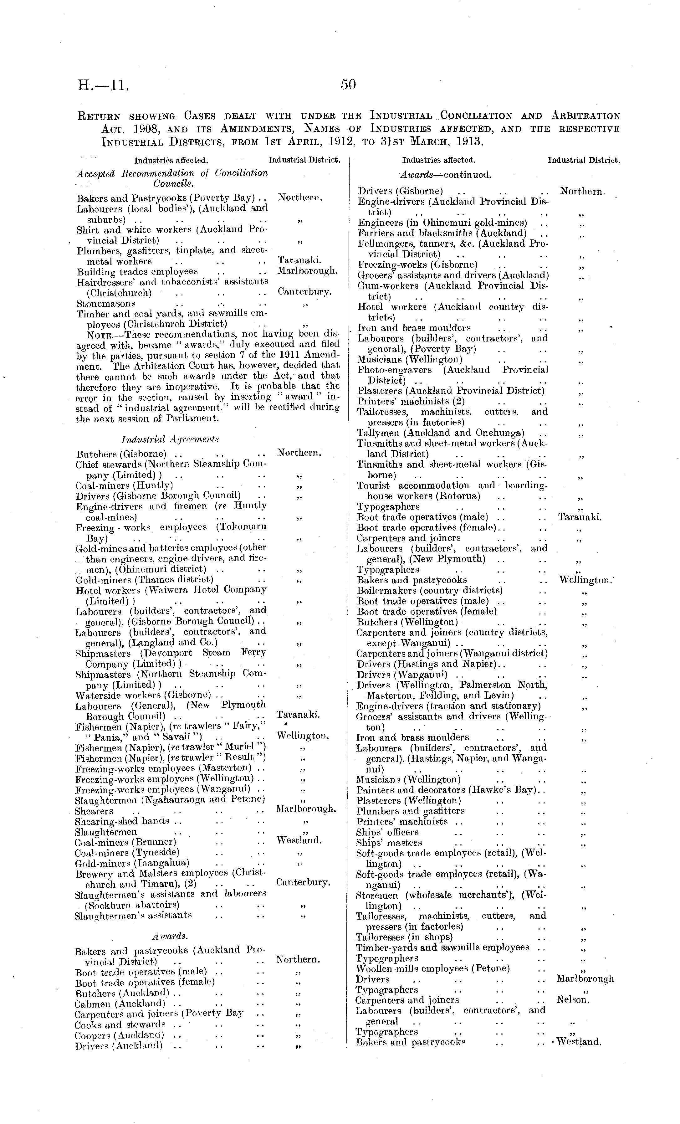 Return showing Cases dealt with under the Industrial Conciliation and Arbitration Act, 1908, and its Amendments, Names of Industries affected, and the respective Industrial Districts, from Ist April, 1912. to 31st March, 1913. Industries affected. Industrial District. Industries affected. Industrial District. Accepted Recommendation of Conciliation Awards —continued. Councils. , ,„ . _ . XT ~ Drivers (Gisborne) .. .. .. Northern. Bakers and Pastrycooks (Poverty Bay) Northern. Engine-drivers (Auckland Provincial DisLabourers (local bodies ), (Aucktand and tiict) suburbs) . . .. .. • • " Engineers (in Ohinemuri gold-mines) Shirt and white workers (Auckland Pro- Farriers and blacksmiths (Auckland) vincial District) . . .... „ Fellmongers, tanners, &c. (Auckland ProPlumbers, gasfitters, tinplate, and sheet- vincial District) metal workers . . .. laranala. Freezing-works (Gisborne) Building trades employees .. Marlborough. (< roc e rs 'assistants and drivers (Auckland) Hairdressers and tobacconists assistants Gum-workers (Auckland Provincial Dis(Chnstchurch) .. .. .. Canterbury. trict j Stonemasons .. .-. .. „ Hotel worker ' s (Auckland country di'sTimber and coal yards, and sawmills em- tricts) ployees (Christchurch District) .. „ . Iron and brass moulders '.[ '.[ "„ NOTB-These recommendations, not having been dis- Labourers (bui lders', contractors', and agreed with, became awards, drdy executed and filed general), (Poverty Bay) .. by the parties, pursuant to section ,of the 1911 Amend- M^sioia J (We i Ul U on ) ' ment. The Arbitration Court has, however decided that ph > B (Auoklar , d Provincial there cannot be such awards under the Act, and that District) therefore they are inoperative. It is probable that the p, asterers ' (Auokland provincial' District)' " error in the section, caused by inserting award in- tMnters > macnmist , s (2 ) stead of "industrial agreement, will be rectified during TailoresseS; machinists, cutters, and the next session of Parliament. pressers (in factories) . , , Tallymen (Auckland and Onehunga) Industrial Agreements Tinsmiths and sheet-metal workers (AuckButohers (Gisborne) .. .. .. Northern. land District) Chief stewards (Northern Steamship Com- Tinsmiths and sheet-metal workers (Gispany (Limited) ) .. ■ ■ • • ~ borne) .. .. .. .. ~ Coal-miners (Huntly) .. • • „ Tourist accommodation and boardingDrivers (Gisborne Borough Council) .. „ house workers (Rotorua) .. .. ~ Engine-drivers and firemen (re Huntly Typographers .. . . .. „ coal-mines) .. . . • • „ Boot trade operatives (male) .. .. Taranaki. Freezing - works employees (Tokomaru Boot trade operatives (female).. .. „ Bay) .. ■ • ■ • • • „ Carpenters and joiners .. . . „ Gold-mines and batteries employees (other Labourers (builders', contractors', and than engineers, engine-drivers, and fire- general), (New Plymouth) .. .. „ . men), (Ohinemuri district) .. .. „ Typographers .. .. .. „ Gold-miners (Thames district) .. „ Bakers and pastrycooks .. .. Wellington. Hotel workers (Waiwera Hotel Company Boilermakers (country districts) .. „ (Limited) ) . . .. • • „ Boot trade operatives (male) . . .. „ Labourers (builders', contractors', and Boot trade operatives (female) general), (Gisborne Borough Council) .. „ Butchers (Wellington) Labourers (builders', contractors', and Carpenters and joiners (country districts, general), (Langland and Co.) .. „ except Wanganui) .. .. .. „ Shipmasters (Devonport Steam Ferry Carpenters and joiners (Wanganui district) ~ Company (Limited) ) .. .. „ Drivers (Hastings and Napier).. .. ~ Shipmasters (Northern Steamship Com- Drivers (Wanganui) pany (Limited) ) . . •. • • „ Drivers (Wellington, Palmerston North, Waterside workers (Gisborne) . . .. „ Masterton, Feilding, and Levin) .. „ Labourers (General), (New Plymouth Engine-drivers (traction and stationary) Borough Council) . . .. •. Taranaki. Grocers' assistants and drivers (WellingFishermen (Napier), (re trawlers " Fairy," • t on ) " Pania," and " Savaii") .. .. Wellington. Iron and brass moulders Fishermen (Napier), (re trawler " Muriel ") ~ Labourers (builders', contractors', and Fishermen (Napier), (re trawler " Result ") „ general), (Hastings, Napier, and Wanga-Freezing-works employees (Masterton) .. ~ , m i) Freezing-works employees (Wellington) .. „ Musicians (Wellington) Freezing-works employees (Wanganui) .. ~ Painters and decorators (Hawke's Bay).. „ Slaughtermen (Ngahauranga and Petone) „ Plasterers (Wellington) .. Shearers . ... ■ • • • Marlborough. plumbers and gasfitters Shearing-shed hands .. . . ' .. ~ Printers' machinists Slaughtermen . . . • ■ • „ Ships' officers . . . . .. „ Coal-miners (Brunner) .. . . Westland. Ships' masters Coal-miners (Tyneside) .. .. „ Soft-goods trade employees (retail), (Wel-Gold-miners (Inangahua) .. .. ~ lington) .. Brewery and Malsters employees (Christ- Soft-goods trade employees (retail), (Wachurch and Timaru), (2) .. .. Canterbury. nganui) .. .. .. Slaughtermen's assistants and labourers Storemen (wholesale merchants'), (Wel(Sockburn abattoirs) .. .. „ lington) .. .. .. .. ~ Slaughtermen's assistants .. .. „ Tailoresses, machinists, cutters, and pressers (in factories) .. .. ~ Awards. Tailoresses (in shops) Bakers and pastrycooks (Auckland Pro- Timber-yards and sawmills employees .. vincial District)" Northern. Typographers ••,_•' Boot trade operatives (male) . . .. „ Woollen-mills employees (Petone) .. Boot trade operatives (female) .. „ Drivers Marlborough Butchers (Auckland) „ Typographers Cabmen (Auckland) „ Carpenters and joiners .. . .. Nelson. Carpenters and joiners (Poverty Bay .. „ Labourers (builders, contractors, and Cooks and stewards .. .. . • „ general Coopers (Auckland) „ Typographers „ Drivers (Auckland) .. .. .. „ Bakers and pastrycooks .. .. -Westland.