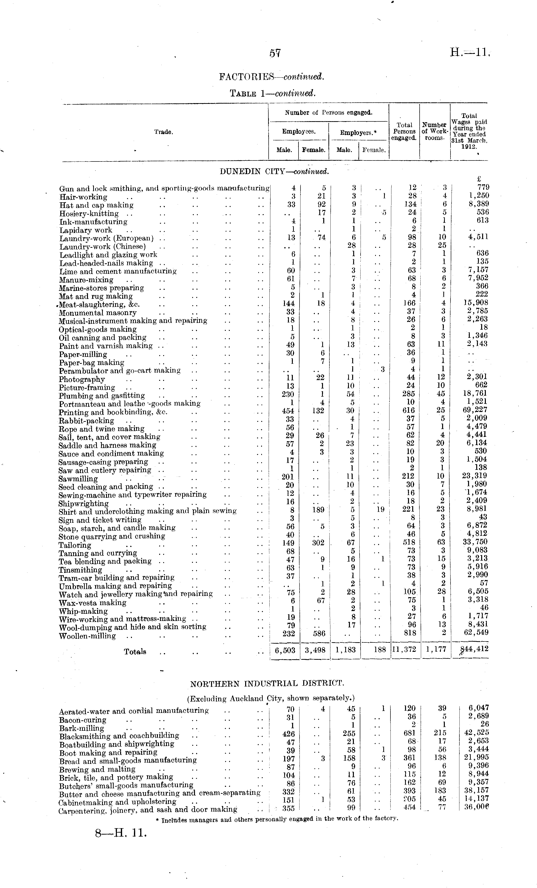 Trade. Number of Persons engaged. Total i Tutal Numl > et lKr?hf Employees. Employers.' Porsoia of Workengaged, rooms, Mich, Male. Female. Male. Female. '_ DUNEDIN CITY— continued. mtinued. Gun and lock smithing, and sporting-goods manufacturing 4 5 Hair-working .. .. •. ■ ■ • ■ 3 2.1 Hat and cap making .. .. .. .. 33 92 Hosiery-knitting .. .. . . ... .. .. 17 [nk-manufacturing .. ■. .. . ■ 4 1 Lapidary work . . . . ■ • ■ • • • 1 Laundry-work (.European) ■• ■• ■• ■• 13 74 Laundry-work (Chinese) Leadlight and glazing work . . . . . . 6 Lead-headed-nails making . . ... . . .. 1 Lime and cement manufacturing .. .. . . 60 Manure-mixing .. .. . • • • ■ ■ 61 .. Marine-stores preparing .. .. .. .. 5 Mat and rug making .. . . . . . . 2 1 Meat-slaughtering, &o. .. .. .. .. 144 1.8 Monumental masonry .. .. . ■ • • 33 Musical-instrument making and 7'epairing .. .. 18 Optical-goods making .. .. .. .. 1 Oil canning and packing . . .. .. . . 5 Paint and varnish making . . .. . . . . 49 1 Paper-milling .. .. • • ■ • ■ ■ 30 6 Paper-bag making ■ ■ ■ ■ • ■ • • 1 7 Perambulator and go-cart making Photography .. ■. ■ • ■ ■ • • 11 22 Picture-framing .. • • ■ ■ • ■ ■ • 13 Plumbing and gasfitting .. .. .. ■ . 230 [ 1 Portmanteau and leathe -goods making . . . . 1 4 Printing and bookbinding, &c. .. .. . . 454 132 Rabbit-packing .. . . • ■ ■ ■ • • 33 Rope and twine making . . .. .. .. 56 Sail, tent, and cover making .. .. .. I 29 26 1 Saddle and harness making .. . . .. 57 2 Sauce and condiment making .. .. .. 4 3 Sausage-casing preparing . . .. ■ • ■ ■ 17 Saw and cutlery repairing . . .. •. • . ! 1 Sawmilling . . • • • • . • ■ .. 201 Seed cleaning and packing . . .. .. .. I 20 Sewing-machine and typewriter repairing .. . . j 12 Shipwrighting . . • ■ ■ • ■ ■ ■ • 1 16 Shirt and underclothing making and plain sewing . . | 8 189 Sign and ticket writing .. . . . • ■ ■ j 3 Soap, starch, and candle making .. .. .. I 56 5 Stone quarrying and crushing . . .. .. 40 Tailoring 1« 302 Tanning and currying .. .. . . •. 68 Tea blending and packing .. .. . . .. 47 9 Tinsmithing .. • ■ • ■ • • ■ ■ j 63 1 : Tram-car building and repairing .. .. .. I 37 Umbrella making and repairing .. .. .. . .. 1 Watch and jewellery making "and repairing .. ._. I 75 Wax-vesta making •. ■ • ■ ■ • • | 6 67 Whip-making .. .. ■ • • • • • 1 ■ ■ ] Wire-working and mattress-making . . .. .. 19 • • j Wool-dumping and hide and skin sorting .. .. ; 79 Woollen-milling .. .. .. •• ..232 586 ! Totals .. .. .. .. I 6,503 3,498 5 21 92 17 1 74 3 3 9 2 1 l s 6 28 1 j 1 ! 3 7' 3 1 j 4 j 8 1 3 ! 13 1 I 11 10 54 5 30 4 . 1 7 23 3 2 1 11 10 4 2 5 5 3 6 67 5 16 9 1 2 28 2 2 ! 8 17 1 "5 \ 5 I 1 ' 19 j 1 I - ■ I ; .12 28 134 24 6 2 : 98 28 7 2 63 68 8: 4 166 37 26 2 ! 8 63 36 9 4 I 44 24 285 I 10 616 37 57 62 82 10 19 2 212 30 16 18 221 8 64 46 518 73 73 73 38 4 105 75 3 27 96 818 £ 3 J 779 4 1,250 6 8,389 5 536 1 613 I 10 4,511 25 1 636 1 135 3 7,157 6 7,952 2 366 I 222 4 15,908 3 2,785 6 2,263 1 18 3 1,346 11 2,143 I 1 1 12 2,301 10 662 45 18,761 4 ; 1,521 25 69,227 5 2,009 1 4,479 4 4,441 20 6,134 3 530 3 ! 1,504 1 138 10 23,319 7 1,980 5 1,674 2 2,409 23 8,981 3 43 3 6,872 5 4,812 63 33,750 3 9,083 15 3,213 9 I 5,916 3 I 2,990 2 57 28 6,505 1 3,318 1 46 6 1,717 13 ! 8,431 2 i 62,549 1 1 1,183 188 11,372 1,177 $44,412 1 NORTHERN INDUSTRIAL DISTR] rer. (Excluding Auckland City, shown sepai Aerated-water and cordial manufacturing .. .. 70 4 Bacon-curing .. • • ■ ■ • • • • 31 Bark-milling .. ■ ■ • •. • • • • I 1 Blacksmithing and coachbuilding .. . . .. ! 426 Boatbuilding and shipwrighting .. .. ... 47 j Boot making and repairing .. • • • • ! 39 j Bread and small-goods manufacturing .. .. j 197 i 3 Brewing and malting .. • • ■ ■ ■ ■ ; 87 Brick, tile, and pottery making .. .. • • 104 j Butchers' small-goods manufacturing .. . . .86 Butter and cheese manufacturing and cream-separating 332 Oabinetmaking and upholstering .. .. • • 151 , I Carpentering, joinery, and sash and door making .. j ■ 355 I rately.) 45 5 1 255 21 58 158 9 11 76 61 53 99 1 1 3' ! 120 36 2 681 68 98 361 96 115 j 162 393 j ?05 ! 454 I 39 I 6,047 5 2,689 1 26 215 42,525 17 ! 2,653 56 i 3,444 138 21,995 6 9,396 12 I 8,944 69 I 9,357 183 I 38,157 45 14,137 77 36,006 6.047 2,689 26 42,525 2,663 3,444 21,995 9,396 8,944 9,357 38,157 14,137 36,006 It \ j v* 4 *-' *-' * Includes managers aud others personally engaged in th ie work of the factoi the facto] ry.