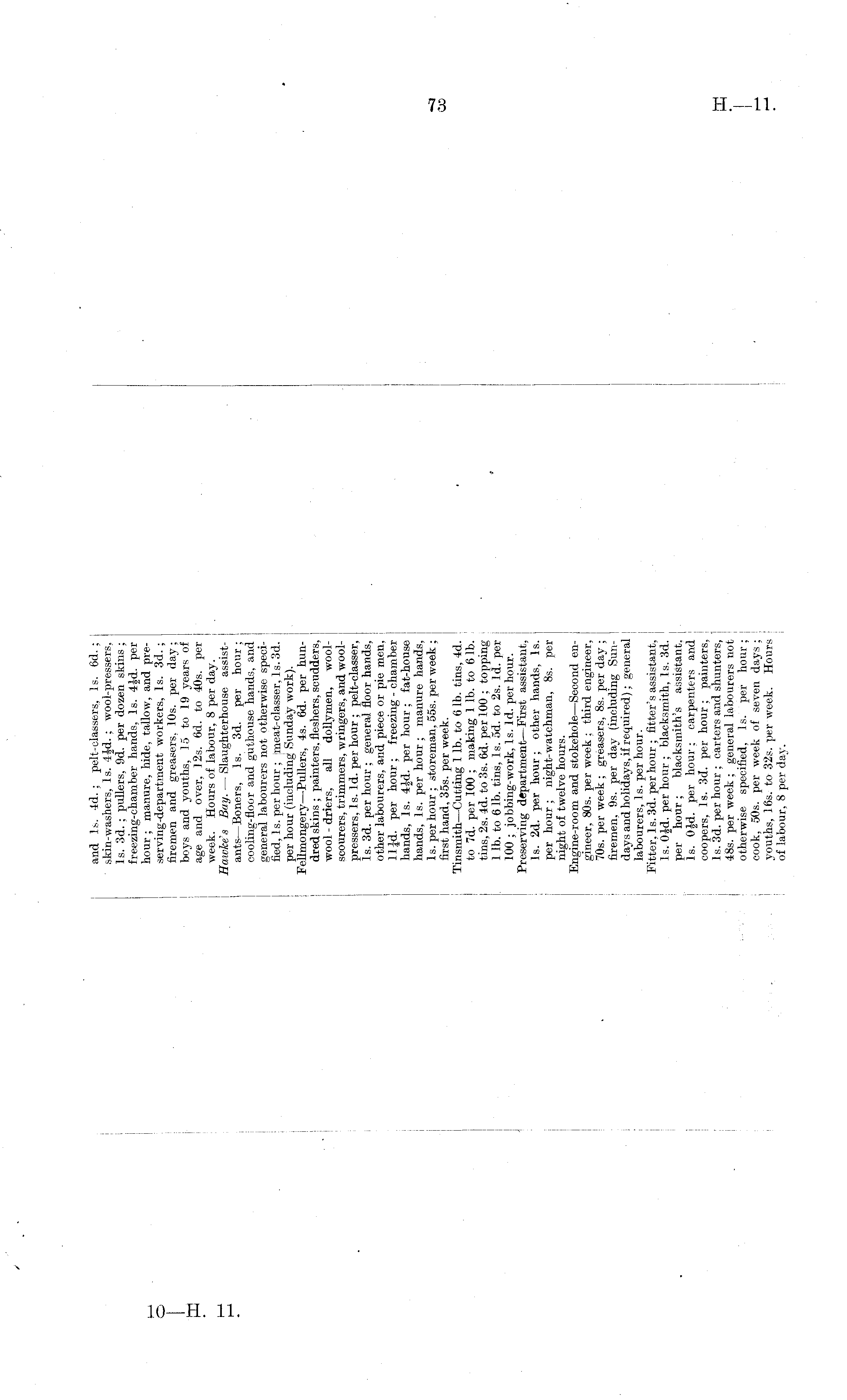 and ls>. 4d. ; pelt-ulassers, Is. 6d.; skin-washers, Is. 4Jd. ; wool-pressers. Is. 3d. ; pullers, 9d. per dozen skins; freezing-chamber hands, Is. 4Jd. per hour ; manure, hide, tallow, and pre-serving-department workers, Is. 3d. ; firemen and greasers. 10s. per day; boys and youths, 15 to 19 years of age and over, 12s. 6d. to 40s. per week. Hours of labour, 8 per day. Hawke's Bay. — Slaughterhouse, assistants—Boners, Is. 3d. per hour; cooling-floor and guthouse hands, and general labourers not otherwise specified, Is. per hour ; meat-classer, Is. 3d. per hour (including Sunday work). Fellmongery—Pullers, 4s. 6d. per hundred skins ; painters, fleshers, scudders, wool - driers, all dollymen, woolscourers, trimmers, wringers, and woolpressers, Is. Id. per hour ; pelt-classer, Is. 3d. per hour ; general, floor hands, other labourers, and piece or pie men, per hour ; freezing - chamber hands, Is. 4Jd. per hour; fat-house hands, Is. per hour; manure hands, Is. per hour ; storeman, 555. per week ; first hand, 355. per week. Tinsmith— Cutting 1 lb. to 6 lb. tins, 4d. to 7d. per 100 ; making 1 lb. to 6 lb. tins, 2s. 4d. to 3s. 6d. per 100 ; topping 1 lb. to 6 lb. tins, Is. sd. to 2s. Id. per 100 ; jobbing-work, Is. Id. per hour. Preserving department— First assistant, Is. 2d. per hour; other hands, Is. per hour; night-watchman, Bs. per night of twelve hours. Engine-room and stokehole— Second engineer, 80s. per week ; third engineer, 70s. per week ; greasers, Bs. per day ; firemen, 9s. per day (including Sundays and holidays, if required); general labourers, Is. per hour. Fitter, Is. 3d. per hour ; fitter's assistant, Is. o|d. per hour ; blacksmith, Is. 3d. per hour; blacksmith's assistant, Is. OJd. per hour; carpenters and coopers, Is. 3d. per hour ; painters. Is. 3d. per hour ; carters and shunters, 48s. per week ; general labourers not otherwise specified, Is. per hour; cook, 50s. per week of seven days ; youths, 16s. to 325. per week. Hours of labour, 8 per day.