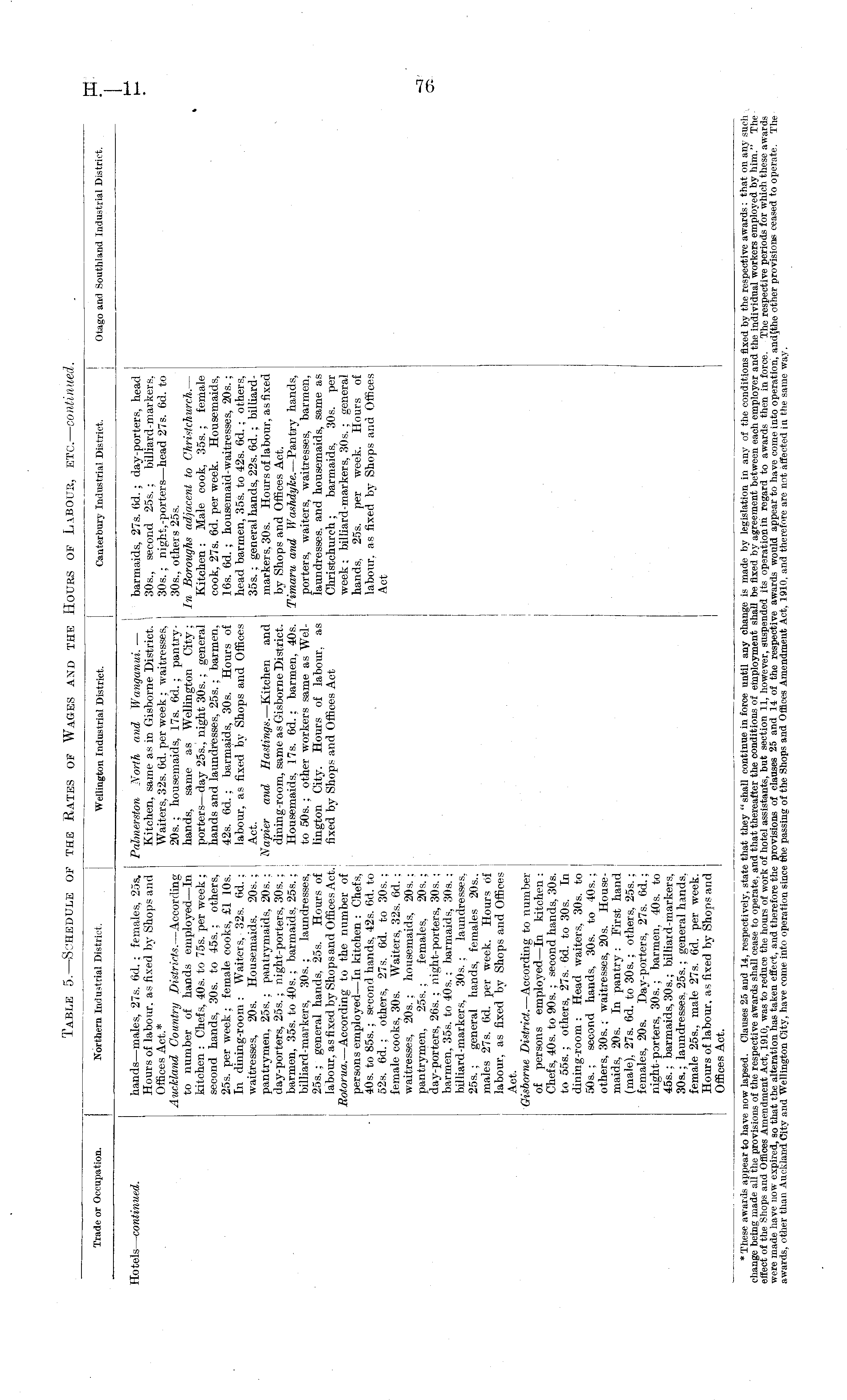 Trade or Occupation. Northern Industrial District. WeUington Industrial District. Canterbury Industrial District. Otago and Southland Industrial District. Hotels — continued. hands —males, 27s. 6d.; females, 25s. Hours of labour, as fixed by Shops and Offices Act.* Auckland Country Districts. —According to number of hands employed — In kitchen : Chefs, 40s. to 75s. per week ; second hands, 30s. to 45s. ; others, 25s. per week; female cooks, £1 10s. In dining-room : AVaiters, 32s. fid. ; waitresses, 20s. Housemaids, 20s.; pantrymen, 25s. ; pantrymaids, 20s. ; day-porters, 25s. ; night-porters, 30s. ; barmen, 35s. to 40s. ; barmaids, 25s. ; billiard-markers, 30s. ; laundresses, 25s. ; general hands, 25s. Hours of labour, as fixed by Shops and Offices Act. Rotorua. —According to the number of persons employed — In kitchen : Chefs, 40s. to 85s. : second hands, 42s. 6d. to 52s. 6d. ; others, 27s. 6d. to 30s. ; female cooks, 30s. Waiters, 32s. 6d. ; waitresses, 20s. ; housemaids, 20s. ; pantrymen, 25s. ; females, 20s. ; day-porters, 26s. ; night-porters, 30 s. ; barmen, 35s. to 40s. : barmaids, 30s. : billiard-markers, 30s. ; laundresses, 25s. ; general hands, females 20s.. males 27s. 6d. per week. Hours Of labour, as fixed by Shops and Offices Act. Gisborne District. —According to number of persons employed —In kitchen : Chefs, 40s. to 90s. ; second hands, 30s. to 55s. ; others, 27s. 6d. to 30s. In dining-room : Head waiters, 30s. to 50s. ; second hands, 30s. to 40s.; others, 30s.; waitresses, 20s. Housemaids, 20s. In pantry: First hand (male), 27s. 6d. to 30s. ; others, 25s.; females, 20s. Day-porters, 27s. 6d.; night-porters, 30s. ; barmen, 40s. to 45s.; barmaids, 30 s.; billiard-markers, 30s.; laundresses, 25s.; general hands, female 25s., male 27s. 6d. per week. Hours of labour, as fixed by Shops and Offices Act. Palmerston North and Wanganui. — j Kitchen, same as in Gisborne District, i Waiters, 32s. 6d. per week ; waitresses, 20s. ; housemaids, 17s. 6d. ; pantryhands, same as Wellington City; porters —day 25s., night 30s. ; general hands and laundresses, 25s. ; barmen, 42s. 6d. ; barmaids, 30s. Hours of labour, as fixed bv Shops and Offices Act. Xapier and Hastings. —Kitchen and dining-room, same as Gisborne District. Housemaids, 17s. 6d. ; barmen, 40s. to 50s. ; other workers same as Wellington City. Hours of labour, as fixed by Shops and Offices Act 1 i barmaids, 27 s. 6d.; day-porters, head 30s., second 25s.; bUliard-markers, 30s.; night,-porters —head 27s. 6d. to 30s., others 25s. In Boroughs adjacent to Christchurch. — Kitchen : Male cook, 35s. ; female cook, 27s. 6d. per week. Housemaids, 16s. 6d. ; housemaid-waitresses, 20s. ; head barmen, 35s. to 42s. 6d. ; others, 35s. ; general hands, 22s. 6d. ; billiardmarkers, 30s. Hours of labour, as fixed by Shops and Offices Act. Timaru and Washdyke. —Pantry hands, porters, waiters, waitresses, barmen, laundresses, and housemaids, same as Christchurch; barmaids, 30 s. per week : billiard-markers, 30s. ; general hands, 25s. per week. Hours of labour, as fixed bv Shops and Offices Act * These awards appear to have now lapsed. Clauses 25 and 14, respectively, state that they " shall continue in force until any change is made by legislation in any of the conditions fixed by the respective awards: that on any such change being made all the provisions of the respective awards shall cease to operate, and that thereafter the conditions of employment shall be fixed by agreement between each employer and the individual workers employed by him." The effect of the Shops and Offices Amendment Act, 1910, was to reduce the hours of work of hotel assistants, but section 11, however, suspended its operation in regard to awards then in force. The respective periods for which these awards were made have now expired, so that the alteration has taken effect, and therefore the provisions of clauses 25 and 14 of the respective awards would appear to have come into operation, other provisions ceased to operate. The awards, other than Auckland City and Wellington City, have come into operation since the passing of the Shops and Offices Amendment Act, 1910, and therefore are not affected in the same way.