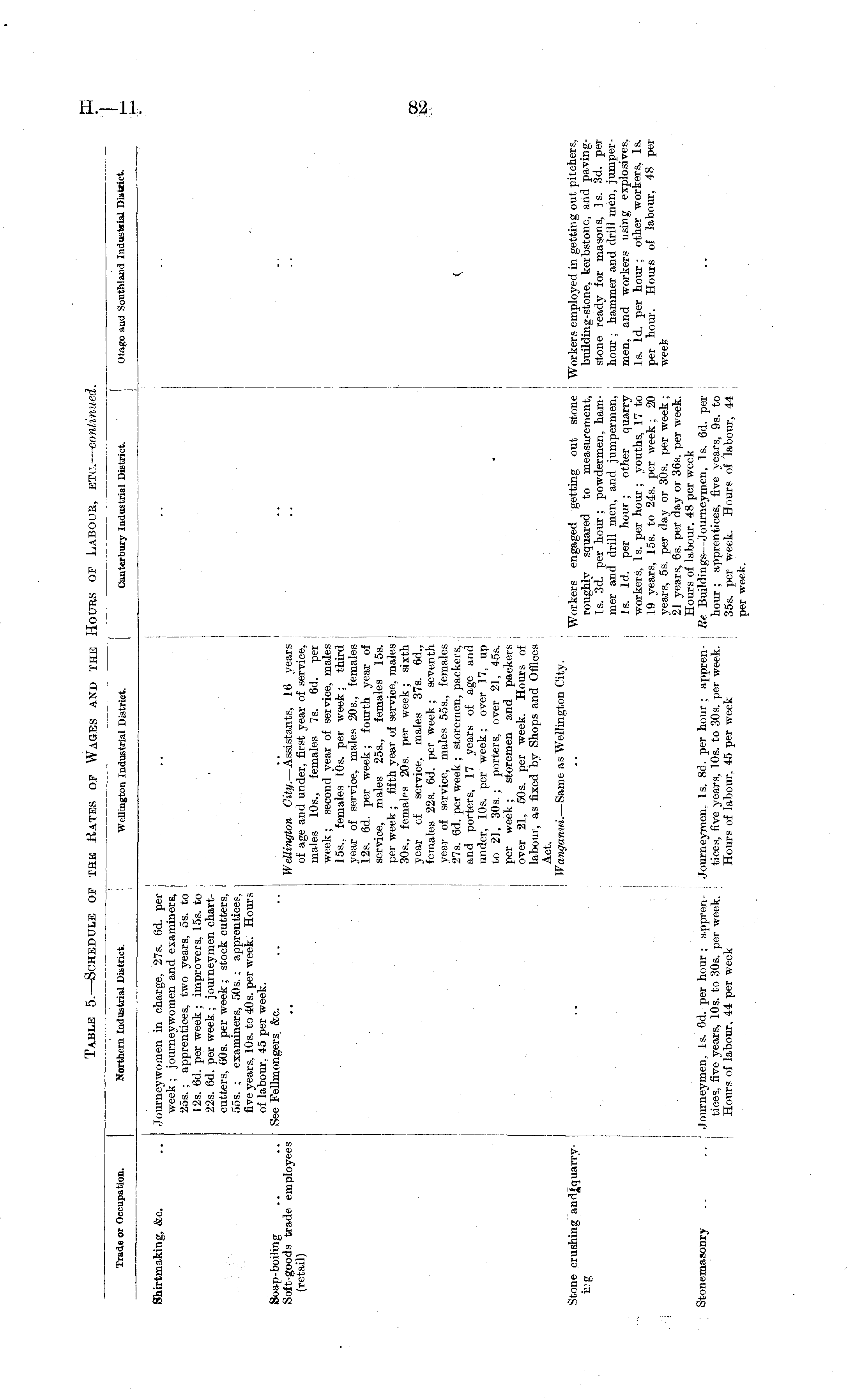 Trade or Occupation. Northern Industrial District. Wellington Industrial District. Canterbury Industrial District. Otago and Southland Industrial District. 1 i Shirtmaking, &c. Journeywomen in charge, 27s. 6d. per ... week ; journeywomen and examiners, 25s. ; apprentices, two years, 5s. to 12s. 6d. per week ; improvers, 15s. to 22s. 6d. per week ; journeymen chartcutters, 60s. per week; stock cutters, 55s. ; examiners, 50s. ; apprentices, five years, 10s. to 40s. per week. Hours of labour, 45 per week. See Fellmongers, tfce. .... Wellington City. —Assistants, 16 years of age and under, first year of service, : males 10s., females 7s. 6d. per i week ; second year of service, males 15s., females 1.0s. per week: third year of service, males 20s., females 12s. 6d. per week; fourth year of service, males 25s., females 15s. per week ; fifth year of service, males 30s., females 20s. per week; sixth year cf service, males 37s. 6d., females 22s. 6d. per week ; seventh year of service, males 55s., females 27s. 6d. per week ; storemen, packers, and porters, 17 years of age and j under, 10s. per week; over 17, up to 21, 30 s. ; porters, over 21, 45s. per week; storemen and packers over 21, 50s. per week. Hours of labour, as fixed by Shops and Offices Act. Wanganui. —Same as Wellington City. Workers engaged getting out stone roughly squared to measurement, Is. 3d. per hour; powdermen, hammer and drill men, and jumpermen, Is. Id. per hour; other quarry workers, Is. per hour; youths, 17 to i 19 years, 15s. to 24s. per week; 20 j years, 5s. per day or 30s. per week ; j 21 years, 6s. per day or 36s. per week. Hours of labour. 48 per week Journeymen, Is. 6d. per hour; appren- '■ Journeymen, Is. 8d. per hour; appren- j Re Buildings! —Journeymen, Is. 6d. per tices, five years, 10s. to 30s. per week. tices, five years, 10s. to 30s. per week, j hour : apprentices, five years, 9s. to Hours of labour, 44 per week Hours of labour, 45 per week 35s. per week. Hours of labour, 44 per week. i Workers employed in getting out pitchers, building-stone, kerbstone, and pavingstone ready for masons. Is. 3d. per hour ; hammer and drill men, jumpermen, and workers using explosives. Is. Id. per hour: other workers. Is. per hour. Hours of labour. 48 per week Soap-boiling Soft-goods trade employees (retail) Stone crushing andjquarryfcg Stonemasonry I