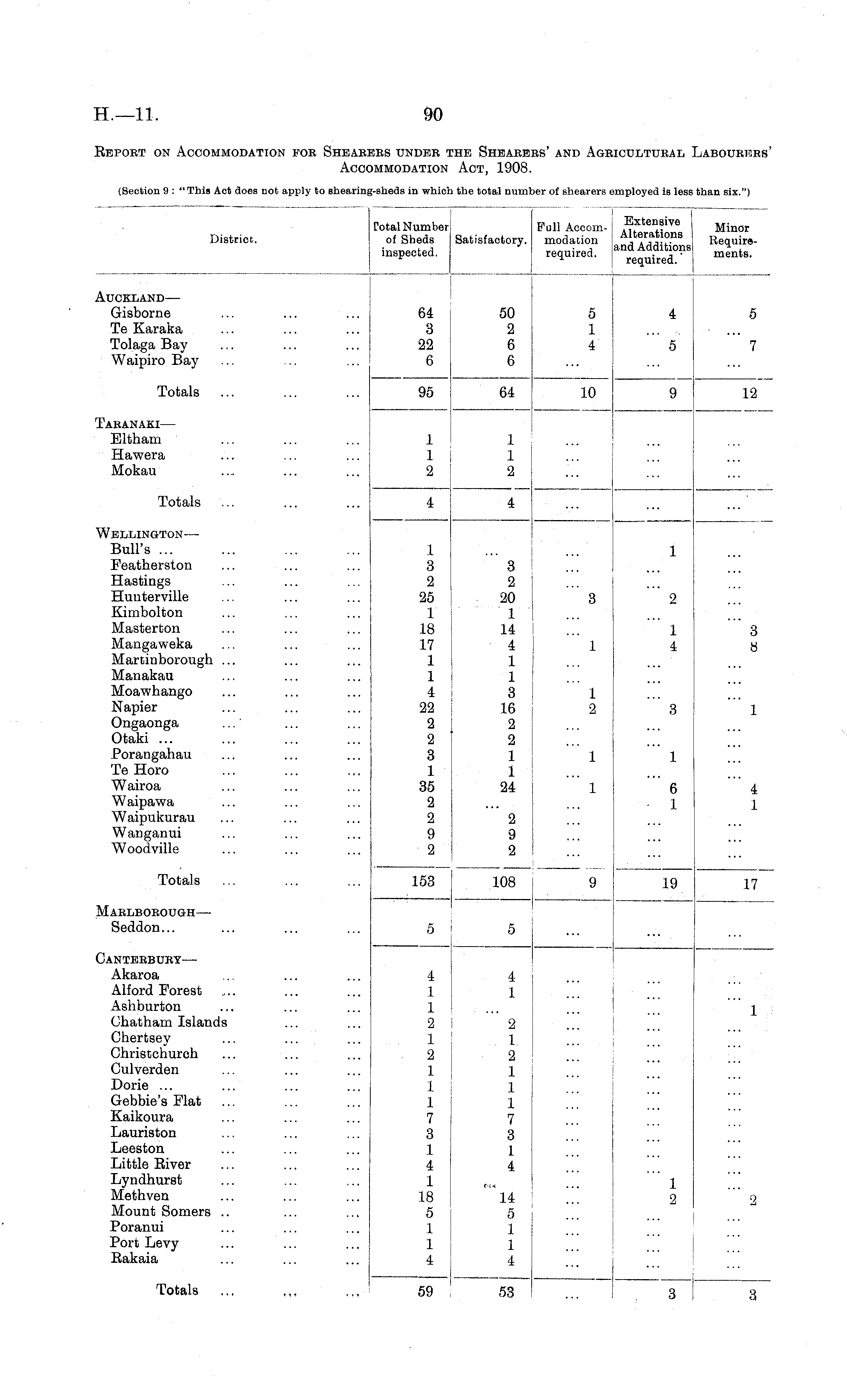 (Section 9 : "This Act does not apply to shi learinj leari! ;• r Is in wl lie! ie total numl >er of shearers employed is lesi than six.") District. Total Number of Sheds inspected. Satisfactory. Fall Accommodation required. Extensive j Alterations and Additions required. Minor Requirements. Auckland— Gisborne Te Karaka Tolaga Bay Waipiro Bay 64 3 22 6 50 2 6 6 5 1 4 4 5 5 7 Totals ... 95 64 10 12 Takanaki— Bltham Hawera Mokau 1 1 2 1 J. 2 Totals ... Wellington— Bull's ... Featherston Hastings Huuterville Kimbolton Masterton Manga weka Marcinborough ... Manakau Moawhango Napier Ongaonga Otaki ... Porangahau Te Horo Wairoa Waipawa Waipukurau Wanganui Woodville 1 3 2 25 1 18 17 1 1 4 22 2 2 3 1 35 2 2 9 2 3 2 20 1 14 4 1 1 3 16 2 2 1 1 24 3 1 1 2 1 2 1 4 3 8 3 1 1 1 1 6 1 4 1 2 9 2 Totals ... 153 108 19 17 Maklbobough— Seddon... 5 Canterbury— Akaroa Alford Forest Ashburton Chatham Islands Chertsey Chriscchurch Culverden Dorie ... Gebbie's Flat Kaikoura Lauriston Leeston Little Biver Lyndhurst Methven Mount Somers .. Poranui Port Levy ... ... Bakaia 4 1 1 2 1 2 1 1 1 7 3 1 4 1 18 5 1 1 4 4 1 2 1 2 1 1 1 7 3 1 4 1 14 5 1 1 4 1 2 2 I Totals ... 59 5S 3 3