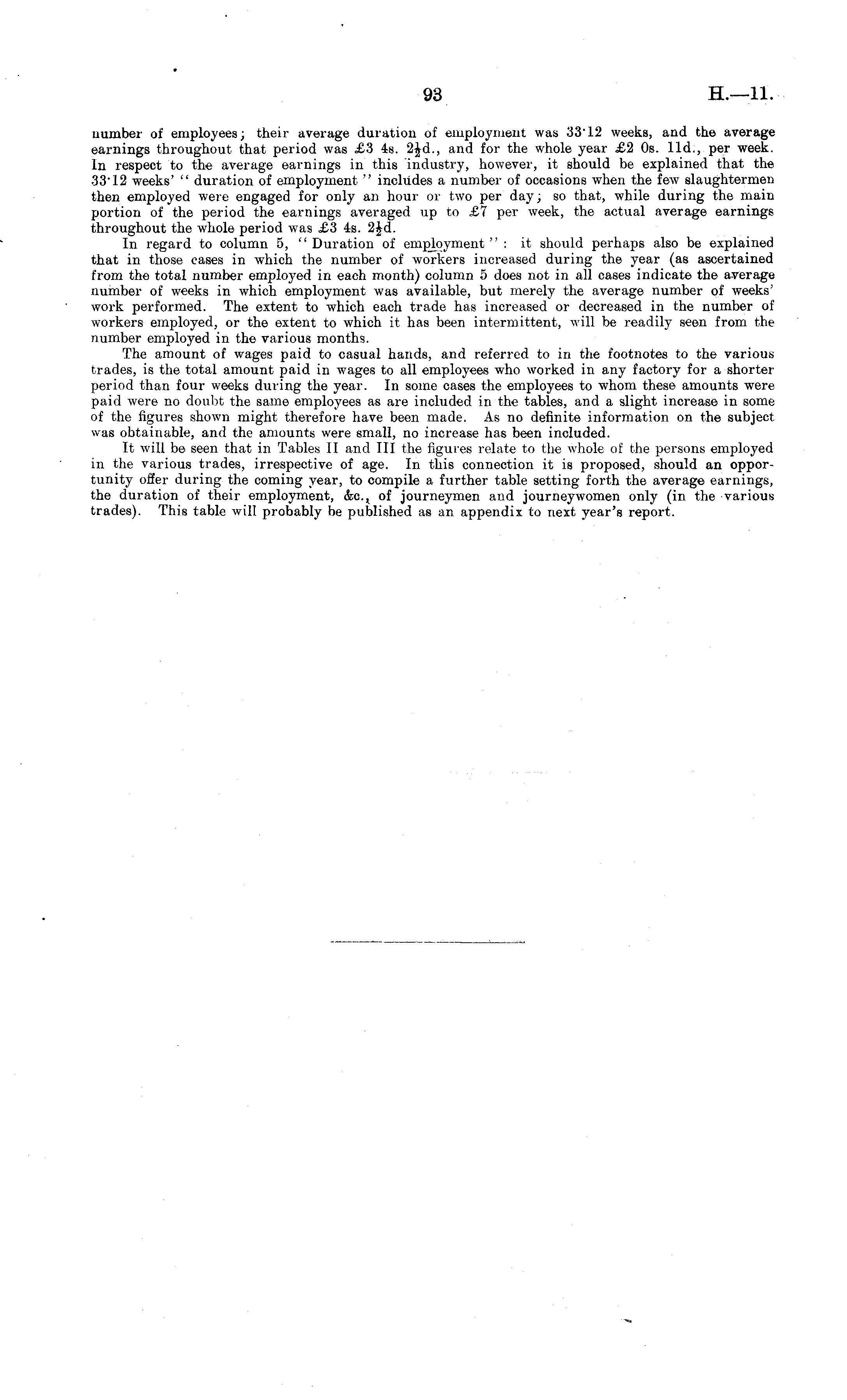 number of employees; their average duration of employment was 33' 12 weeks, and the average earnings throughout that period was £3 4s. 2£d., and for the whole year £2 Os. lid., per week, in respect to the average earnings in this industry, however, it should be explained that the 33 - 12 weeks' " duration of employment " includes a number of occasions when the few slaughtermen then employed were engaged for only an hour or two per day; so that, while during the main portion of the period the earnings averaged up to £7 per week, the actual average earnings throughout the whole period was £3 4s. 2jd. In regard to column 5, "Duration of employment" : it should perhaps also be explained that in those eases in which the number of workers increased during the year (as ascertained from the total number employed in each month) column 5 does not in all cases indicate the average number of weeks in which employment was available, but merely the average number of weeks' work performed. The extent to which each trade has increased or decreased, in the number of workers employed, or the extent to which it has been intermittent, will be readily seen from the number employed in the various months. The amount of wages paid to casual hands, and referred to in the footnotes to the various trades, is the total amount paid in wages to all employees who worked in any factory for a shorter period than four weeks during the year. In some cases the employees to whom these amounts were paid were no doubt the same employees as are included in the tables, and a slight increase in some of the figures shown might therefore have been made. As no definite information on the subject was obtainable, and the amounts were small, no increase has been included. It will be seen that in Tables II and 111 the figures relate to the whole of the persons employed in the various trades, irrespective of age. In this connection it is proposed, should an opportunity offer during the coming year, to compile a further table setting forth the average earnings, the duration of their employment, &c. X of journeymen and journeywomen only (in the various trades). This table will probably be published as an appendix to next year's report.