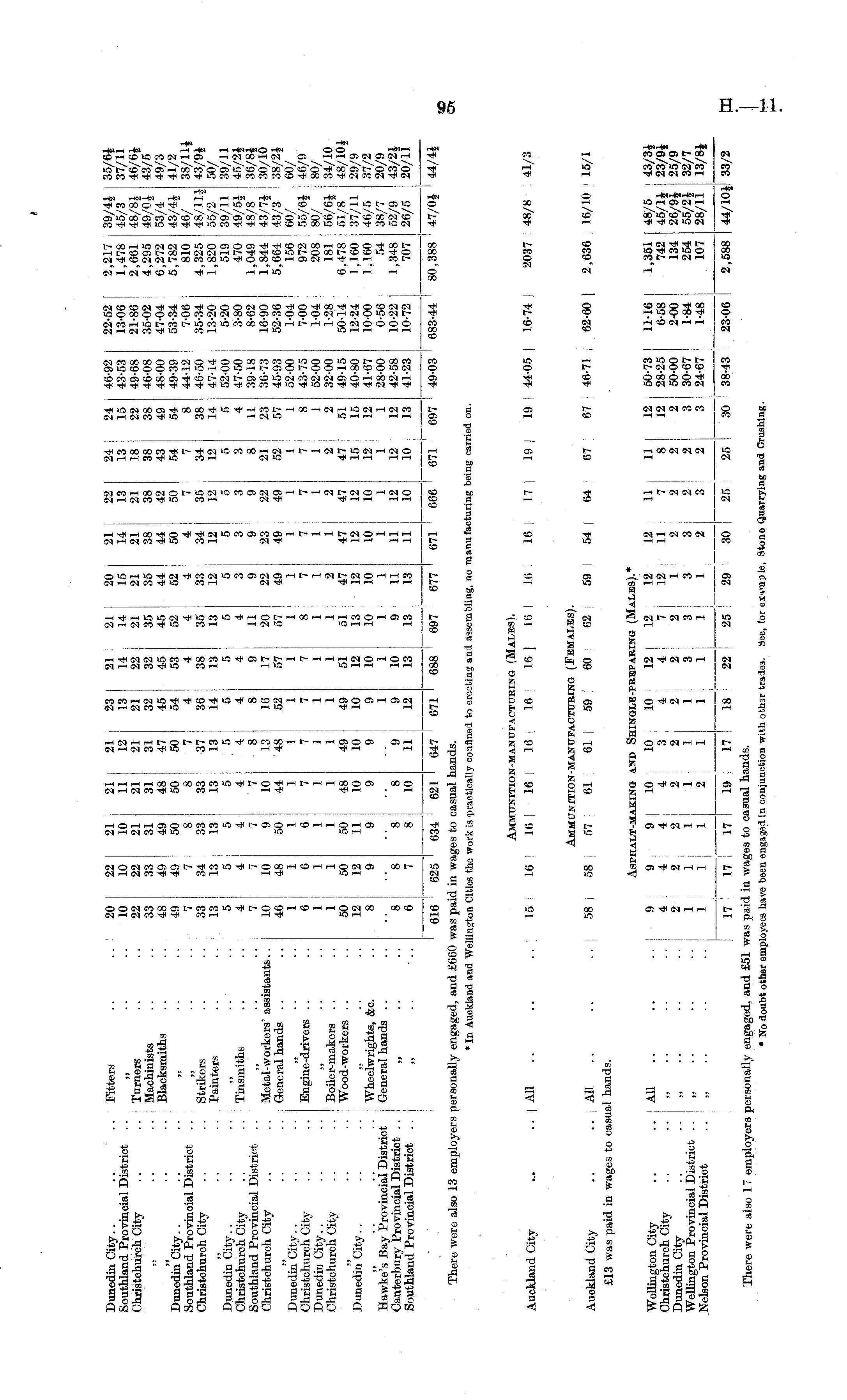 DunedinCity .. ' .. Fitters .. .. 20 22 21 21 | 21 : 23 21 21 20 21 | 22 1 24 24 46-92 22-52 2,217 39/44 j 35/64 Southland Provincial District .. „ .. ..10 10 10 11 12 | 13 14 14 15 14 | 13 13 15 43-53 13-06 1,478 45/3 37/11 Christehurch City .. .. I Turners .. .. 22 22 21 21 21 21 22 21 21 21 21 18 22 49-68 21-86 2,661 48/84 46/64 .. Machinists .. .. 33 33 31 31 31 32 32 35 35 38 38 38 38 46-08 35-02 4,295 49/04 43/5 I Blacksmiths .. .. 48 49 49 48 47 45 45 45 44 44 42 43 49 48-00 47-04 6,272 53/4 49/3 Dunedin'city . I „ . . .. 49 49 50 50 50 I 54 53 52 52 50 50 54 54 49-39 53-34 5,782 I 43/44 41/2 Southland Provincial District ... „ .. .. 7 7 8 8 7|4 4 4 4 4 7 7 8 44-12 7-06 810 46/ 38/11* Christehurch City .. .. Strikers .. . . 33 34 33 33 37 36 38 35 33 34 35 34 38 46-50 35-34 4,325 48/11 J 43/94 Painters .. .. 13 i 13 13 13 13 14 13 13 12 12 12 12 14 47-14 13-20 1,820 55/2 50/ DunedinCity. .. .. „ .. .. 5 5 5 5 5 5 5 5 5 5 5 5 5 52-00 5-20 519 39/11 39/11 Christchurch City .. .. Tinsmiths .. .. 4 4 4 4 4 | 4 4 4 3 3 3 3 4 47-50 I 3-80 470 49/5 J 45/24 Southland Provincial District .. „ .. .. 7 7 7 7818 9 11 9 9 9 8 11 39-18 8-62 1,049 48/8 36/84 Christchurch City .. .. Metal-workers' assistants.. I 10 10 9 10 13 16 17 20 22 23 22 21 23 36-73 16-90 | 1,844 43/74 30 / 10 General hands .. .. 46 48 50 I 44 I 48 52 57 j 57 49 49 49 52 57 45-93 52-36 i 5,664 43/3 38/24 Dunedni'city „ .. .. 11 ill 1 1 1 1 1 1 1 I 1 1 52-00 1-04 j 156 60/ 60/ Christchurch City .. .. Engine-drivers .. .. 6 6 6 7 7J7 7 8 7 7 7 7 8 43-75 7-00 972 55/64 46/9 DunedinCity.. .. .. „ .. .. 1 1 1 1 111 1 1 ! 1 1 1 1 1 52-00 1-04 208 80/ 80/ Christchurch City .. .. Boiler-makers .. .. 1 1 1 1 1 1 1 12 1 2 2 2 32-00 1-28 I 181 56/64 34/10 Wood-workers . 50 50 50 48 49 49 51 51 I 47 47 47 47 51 49-15 50-14 6,478 51/8 48/104 DunedinCity .. „ .. .. 12 12 11 10 10 10 12 13 1 12 12 12 15 15 40-80 12-24 1,160 37/11 29/9 , . .. .. ! Wheelwrights, &c. .. 8 9 9 9 9 9 i 10 10 10 10 10 12 12 41-67 10-00 1,160 46/5 37/2 Hawke's Bay Provincial District ; General hands .. 1 1 1 1 1 1 1 1 28-00 0-56 54 38/7 20/9 Canterbury Provincial District .. „ .. .. 8 8 8 8 9 I 9 10 9 11 11 12 12 12 42-58 10-22 1,348 52/9 43/24 Southland Provincial District .. „ .. •.. 6 7 8 10 11 12 13 13 13 11 10 10 13 41-23 10-72 707 26/5 20/11 i i 616 625 634 621 647 671 688 697 677 671 666 671 697 i 49-03 ' 683-44 ' 80,388 ' 47/04 W±l There were also 13 employers personally engaged, and £660 was paid in wages to casual hands. * In Auckland and Wellington Cities the work is -practically confined to erecting and assembling, no manufacturing being carried on. Ammunition-manufacturing (Males), Auckland City ... .. | All .. .. .. [ 15 ! Iβ 16 | 16 I 16 i 16 | 16 | 16 16 | 16 ! 17 j 19 | 19 I 44-05 | 16-74 j 2037 | 48/8 j 41/3 AMMOTrriON-MANtrFACTTJBING (FEMALES). Auckland City .. .. | All .. .. . . j 58 58 i 57. | 61 61 j 59 I 60 62 59 i 54 [ 64 67 67 i 46-71 | 62-60 | 2,636 j 16/10 i 15/1 £13 was paid in wages to casual hands. ASPHALT-MAKING AND ShINGLE-PRBPARIKG (MaLHS).* Wellington City .. ..'All [ 9 ; 9 , 9 j 10 : 10 10 12 i 12 12 12 I 11 I 11 12 ; 50-73 1116 1 1,351 48/5 ; 43/34 Ohristchurch City . . „ | 4 4 4 ! 4 3 4 4 7 | 12 11 7 8 12 j 28-25 j 6-58 742 45/1 J 23/9* Dunedin City i 2 2 2 5 2 2, 2 2 2 1 2 2 2 2 50-00 | 2-00 134 26/9* 25/9 Wellington Provincial District '..„ 1 l] 1 l! l l 3 3 3 3 i 2 ! 2 3 30-67 ; 1-84 254 55/24 32/7 Nekon Provincial District .. \ ', l| l| 1 s| 1 l| 1 l| 1 2 3 2 3 J24-67J 1-48 107 28/11 I 13/8J 17 I 17 I 17 19 I 17 18 I 22 ! 25 ! 29 30 26 I 25 I 30 i 38-43 ! 23-06 ! 2,588 44/10 jl 33/2 38-43 23-06 2,588 44/1041 33/2 There were also 17 employers personally engaged, and £51 was paid in wages to casual hands. • "No doubt other employees have been engaged in conjunction with othar trades. Sse, for example, Stone Quarrying and Crushing.
