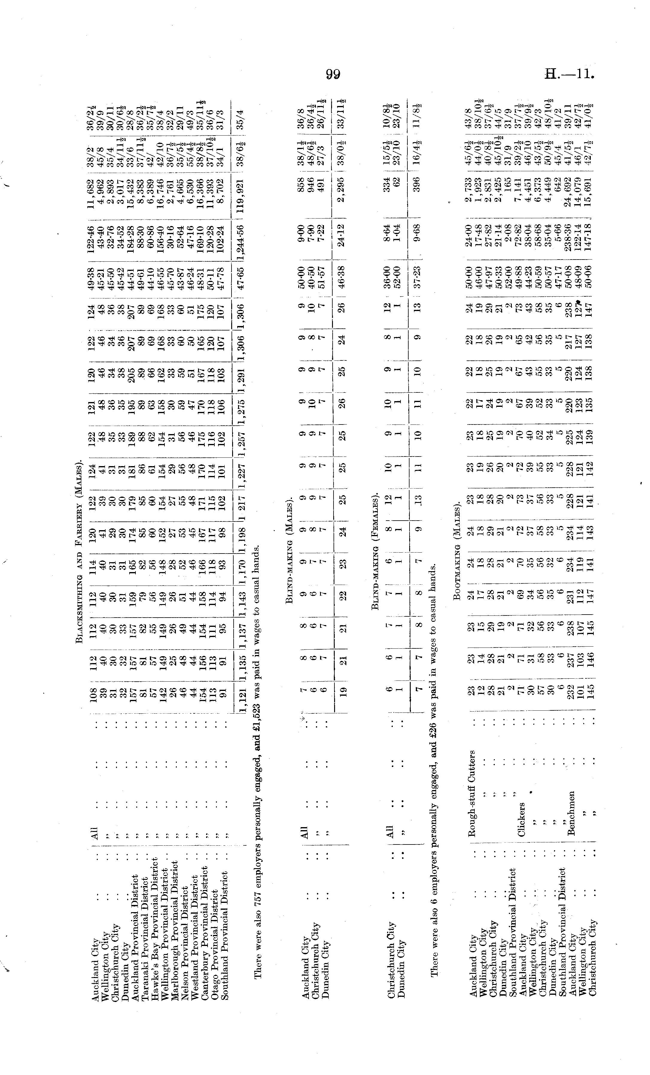 Blacksmithing and Farriery (Males). Auckland Citv 411 . ! 108 112 112 112 114 120 122 124 122 121 120 I 122; 124:49-38 122-46, 11,682; 38/2 36/21 Wellin "ton Citv " " '.. ■■ 39: 40 40 40 40 41 39 41 48 48 46 46 i 48 j 45-21 43-40; 4,962 ! 45/8 39/9 Christetochcftv " " -- 31 30 30 30 31 29 30 31 35 36 34 \ 34! 36:45-50 32-76; 2,893 135/4 30/11 Dunedin Citv " " ' .. 32 32 33 31 31 30 30 31 33 35 38 j 36 1 38 145-42 34-52! 3,017 34/111 30/61 nllkW Provincial District ""„ '. 157 157 157 159 165 174 179 1811189 195 205 207 j 207 44-51 184-28 15,432 j 33/6 28/8 Taranaki Provincial District .. , 81 81 82 79 82 85 85 86 88 89 89 ! 89 89 49-61 88-30; 8,383 ; 37/11* 36/2* Hawke's Bav Provincial District .. 57 i 57 55 56 56 60 60 61 ; 62 63 66 ; 69 ! 69 44-10 60-86 6,389 . 42/ 35/7* WeSonfcoWal 142 149 149 149 148 152 154 154 154 158 162 168; 168 146-55 156-40: 16,746 : 42/10 38/4 26 25 26 26! 28 27 27 29 31 30 33 33 | 33 45-70 30-16 2,76136/7132/2 Nelson Provincial District .... 46 48 49 51 52 53 55 56 56 59 59 60 j 60; 43-87 52-64: 4,665 35/5* 29/11 Westland Provmcial District ..!„ : 44 ! 44 44 44 : 46 45 48 48 46 47 51 50 51,46-24 47-16 6,530 55/41 49/3 Canterbury Provincial District .. „ 154 156 154 158 ; 166 167 171 170 175 170 167 165 175 ; 48-31 169-10 16,366 38/8* 35/11* Otao-o Provincial District . „ 113; 113 111 114 1 118 117 115 114 116 118 118 120 120 j 50-11 120-28; 11,393 37/10*36/6 southifrS fto^S Stot :: ;; 9l! 98 102 101 102i 106 103 107 107 l 47 ' 78 102-24 8 ' 702 1 34/1 ! 31/3 !ri^ll^l35 _ ri37~lTl43 11,170 1,198 1 217 1,227 il,257 !l,275 1,291 1,306 1,306 ! 47-65 1,244-56 1 119,921 I 38/6* | 35/4 There were also 757 employers personally engaged, and £1,523 was paid in wages to casual hands. Blind-making (Males). Auckland Citv All >r 7 I 8 81 9 9 1 9 9 9: 9l 9< 9; 9 9 50-00 9-00 858:38/11:36/8 cSchurchCity " 6; 6 6 6 7 8; 9 9! 9 10 9 8 10 40-50 7-90: 946 | 48/61 36/41 Dunfdtcity ". .. '„ " .. .. _6_| _J_ _7_ _7_j _VJ _7_ _7_ _7__ * 91 [ 27/3 26/11* 19~! 21 21 22 i 23 j 24 j 25 | 25 25 26 25 ; 24 26 j 46-38 | 24-12 j 2,295 i 38/0* ) 33/11* Blind-making (Females). Christchurch City .. .. AH < 6 6 7 I 7 I 6 j 8 - 12 I 10 9 j 10 9 8 12 36-00 8-64 334 J 15/5* 10/8* Dunedin City .. .. „ 1 1 1 1 1 ! 1 1 1 1 1 1 1 1 j 52-00 1-04 62 j 23/10 | 23/10 T~~ ~7 8~r 8~! -Tl 9 IS I ll 10 ll 10 9 13: 37-23 , 9-68 396 '' 16/4* 11/8* There were also 6 employers personally engaged, and £26 was paid in wages to casual hands. Bootmaking (Males). Auckland City .. ..; Rough-stuff Cutters .. 23; 23 23 241 24 24: 23 23 23 22 22 22 24 ! o0-00 24-00; 2,733 45/61 43/8 WdlinTton Citv ., ■• .. 12 14 15 17 18 18 18 19 18 17 18 18 19 46-00 17-48 1,923 44/01 38/101 CiristchrchCitv " " i -- .. 28 28 29 28 28 29! 28 26 25 24 25 26 29 47-97 27-82! 2,831 40/81 37/61 Dunfdtcitv " " „ -■ " .. 21 21 19 21 21 21 20 20 19 19 19 19 21 50-33 21-14 2,425 45/10144/5 Southland Provincial District " .. 2 2 2 .2 2 2 2 2 ■ 2, 2 2 2 2 52-00 2-08 165 31/9 31/9 Auckland Citv Clickers .. .. 71 71 71 69 70 72 73 72 70 67 67 65 73 49-88 72-82 7,141 39/21 37/7* Wei™nCit V " „ ' ■• •- 30 31 32 34 35 37 37 39 40 39 43 42 43 44-23 38-04 4,451 46/10 39/91 ChristcCchCitv '" - ..57 1 58 56 56 56 58 56 55 52 52 55 56 58 50-59 58-68 6,3,73 43/5* i 42/3 "dtSty y :: :: .. .. soi 33 33 35 32 33 33 33 34 33 33 35 35 50.57 35-041 50/91 wm Southland Provincial District „ .. .. 61666655555556 47-17 o-66 | 642 45/4 41/2 Auckland City " ? Benchmen .. .. 232 237 238 231 234 234 228 228 225 220 220 217 238 50-08 238-36 j 24,692 41/5* 39/11 WdCtoncL " ' ., -- .. 101 103 107 112 119 114; 121 121 124 123 124 127 127*; 48-09 122-14 14,079 46/1 42/7* CMstchurchCity " " .. .. 145 146 145 147 141 143 ! 141 142 139 135 138 138 147 150-06 147-18.! 15,691 42/71 41/0*