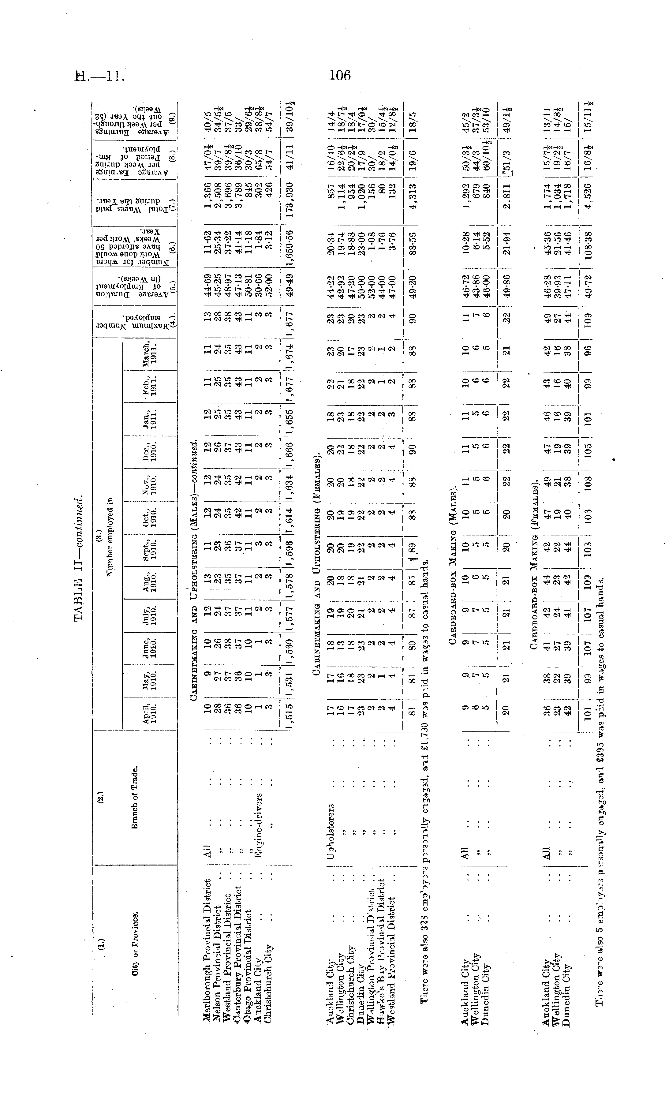 (1.) City or Province. (2.) Branch oi Trade. April, | May. June, July, Aug., Sept., Oct., Nov., Dec, Jan., Feb., March, 1910. ; 1910. 1910. 1910. 1910. 1910. 1910. 1910. 1910. 1911. 1911. 1911. i (3.) Number employed in tr Hi gg Kr± §1 flSS 2„fl (5.) sags o a ft . * « in t, '3 3 ft03 "cS fl (7.) |f a co fl ti i, K & s.' ftf-i p. -t| tc Am r o tr ar« 5 l Stir-8 © CD fl£. i- & eggr ■4 (6.) (9.) Cabinetmaking and Upholstering (Males) — continued. Marlborough Provincial District All .. .. I 10 9 10 12 13 i 11 12 I 12 12 ! 12 11 I 11 , 13 44-69 11-62 1,366 47/01 40/5 Mson Provincial District .. .. .. ..28 27 26 24 23 23 24 i 24 26 25 25 ! 24 28 45-25 25-34 2,508 39/7 34/51 Westland Provincial District .. .. .. ..36 37 38 37 35 36 35 I 35 37 35 35 35 38 48-97 37-22 3,696 39/81 37 /5 Canterbury Provincial District .. „ .. .. ..36 36 37 37 37 37 42 i 42 43 43 43 43 43 47-13 41-14 3,789 36/10 33/ ■Otago Provincial District .. ' „ .. .. .. j 10 10 10 11 11 11 11 11 11 11 11 11 11 50-81 11-18 845 30/3 29/61 Auckland City .. .. Engine-drivers .. .. 1 1 1 2 2 3 2!2 2 2 2 2 3 30-66 1-84 302 65/8 38/81 Christchurch City .. .. „ .. .. 3 3 3 3 3 3 3 I 3 3 3 3 3 3 52-00 3-12 426 54/7 54/7 1,515 1,531 1,560 1,577 1,578 1,598 1,614 |l,634 1,666 1,655 1,677 !l,674 1,677 49-49 1,659-56 173,930 41/11 39/101 1 12 25 35 43 11 2 3 1,655 11 25 35 43 11 2 3 11 24 35 43 11 2 3 |l,674 13 28 38 43 11 3 3 44-69 45-25 48-97 47-13 50-81 30-66 52-00 40/5 34/5| 37/5 33/ 29/61 38/81 54/7 1,677 I !l,677 49-49 Cabinetmaking and Upholstering (Females). AusklandCitv .. .. | Uoholsterers .. .. 17 17 18 19 20 20 20 20 I 20 i 18 22 23 23 44-22 20-34 857 16/10 I 14/4 Wellington City .. .. j „ .. .. 16 16 13 19 18 20 19 20 22 23 21 20 23 42-92 19-74 1,114 22/61 i 18 / 7 i Christchurch City .. .. „ .. .. 17 18 18 20 18 19 19 18 18 18 18 17 20 47-20 18-88 954 20/21 I 18 /4 Danedin City .. .. „ .. ... 23 23 23 21 21 22 22 22 22 22 22 23 23 50-00 23-00 1,020 17/9 j 17/01 Wellmgton Provincial TDistrict .. „ .. ..2222222222222 52-00 1-08 156 30/ I 30/ Hawke's Bay Provincial District I „ .. ..2122222222112 44-00 1-76 80 18/2 j 15/41 .Westland Provincial District .. „ .. .. 4 4 4 4 4 4 4 4 4 3 2 2 4 47-00 3-76 132 14/01 12/8* 81 j 81 80 87 85 | ,89 88 83 90 83 83 88 90 49-20 83-56 4,313 19/6 | 18/5 There were also 323 e-np'ryje-s pi™3.:ina!ly eagag3d, ail £1,790 was pv.d ia wagss to casual hands. Cardboard -box Making (Male3). Auckland City .. .. All .. .. .. 9 9 9:9 10 10 ; 10 11 I 11 11 10 10 [ 11 46-72 [ 10-28 1,292 50/31 I 45/2 Wellington City .. .. „.. .. .. 6 7 7 7 6 5155 5 5 6 6!7 43-86 ! 6-14 679 44/3 ! 37/3* Dunedin City .. .. „.. .. .. 5 5 515 5 5 5 6J6 6;6 5 6 46-00 ; 5-52 840 60/10*' 53/10 20 21 I 21 I 21 21 20 i 20 22 j 22 22 I 22 21 ' 22 I 49-86 j 21-94 ; 2,811 "51/3 49/1* Cardboard-box Making (Females). .Auckland City ... ..All .. .. .. j 36 38 41 42 44 : 42 47 [ 49 47 ! 46 - 43 42 49 46-28 45-36 ■ 1,774 15/7* 13/11 Wellington City .. .. .. .. .. 23 22 27 24 23 j 22 19 - 21 19 16 ' 16 16 27 39-93 ! 21-56 : 1,034 19/21 14 /8i Dunedin City .. . . .. .. .. 42 39 39 41 42 I 44 40 38 i 39 39 j 40 38 44 47-11 j 41-46 j 1,718 16/7 15/ 101 | 9.9 ! 107 107 103 i 103 103 108 I 105 101 ! 93 96 103 49-72 ! 108-38 I 4,526 16/81 15/11* TTi3Te W3re also 5 3-n-) 1 personally engaged, and £335 was p'nid in wages to casual hands.